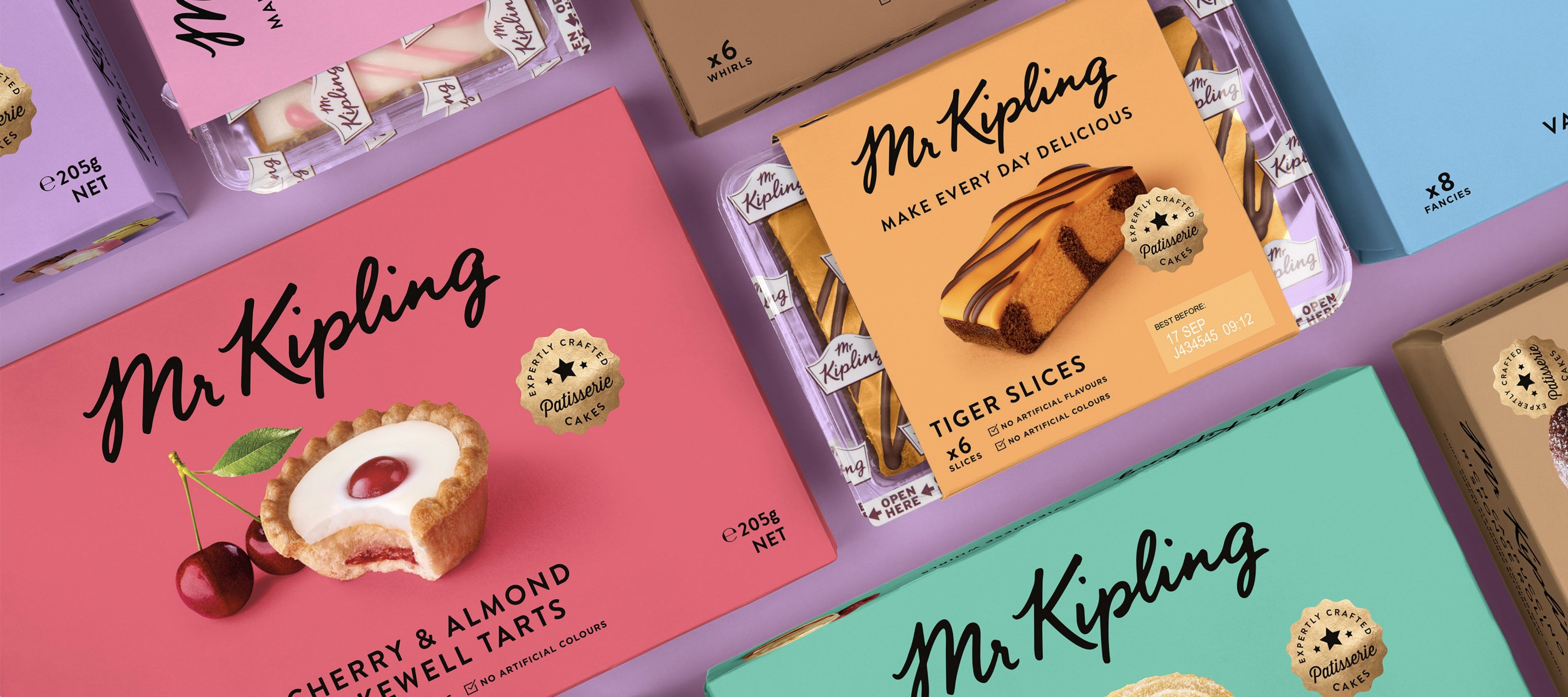 Above, top: Alison redesigned the logo for Mr Kipling, featuring a stylised version of what she believed Mr Kipling’s signature might be like, if he were a real person. See the full project here.