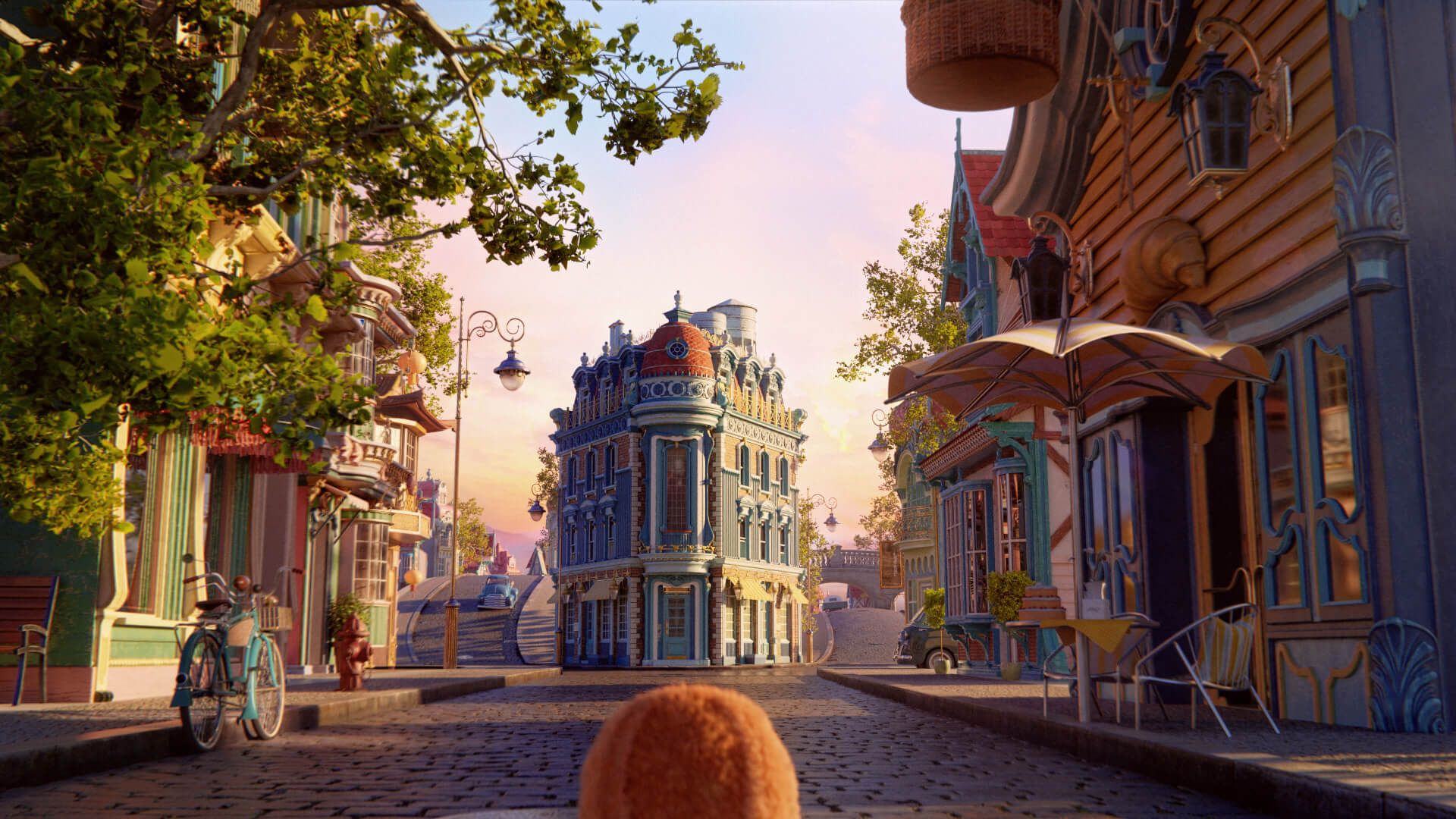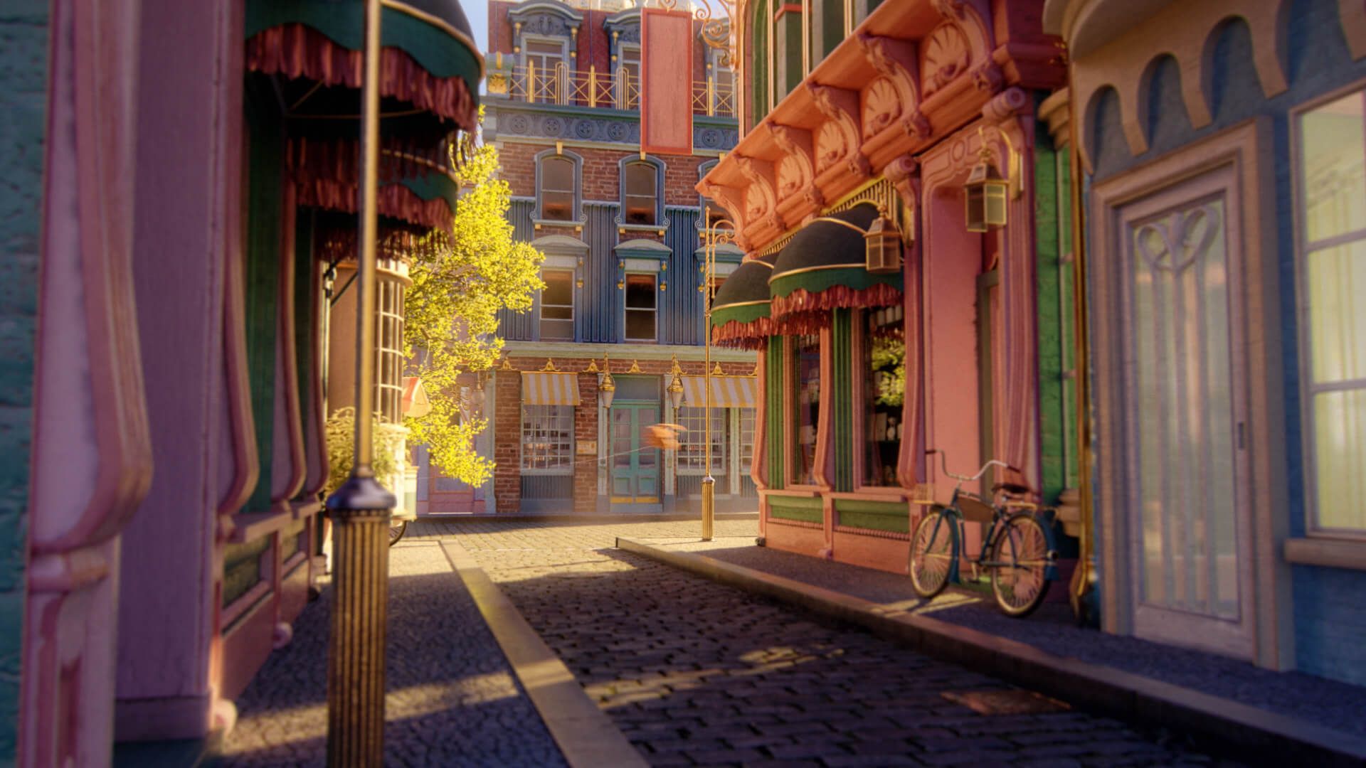 “We designed a city filled with charming small-town storefronts, illustrating each with its own character and purpose to communicate Barbara’s journey. This shot establishes the world we’re in and it’s very dear to us.”