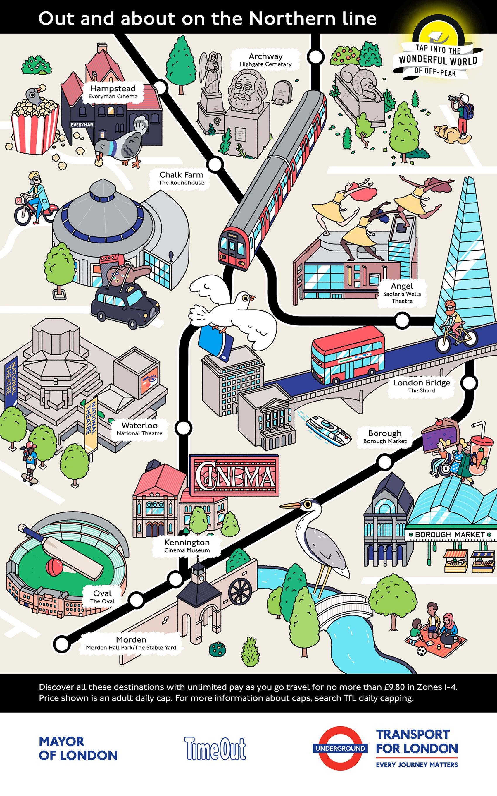 A select group of artists represented by Jelly London were asked to create some TfL posters to bring to life their ‘Wonderful world of off-peak’ initiative, revealing some of Time Out’s recommended museums, galleries, street art and more on various tube lines.