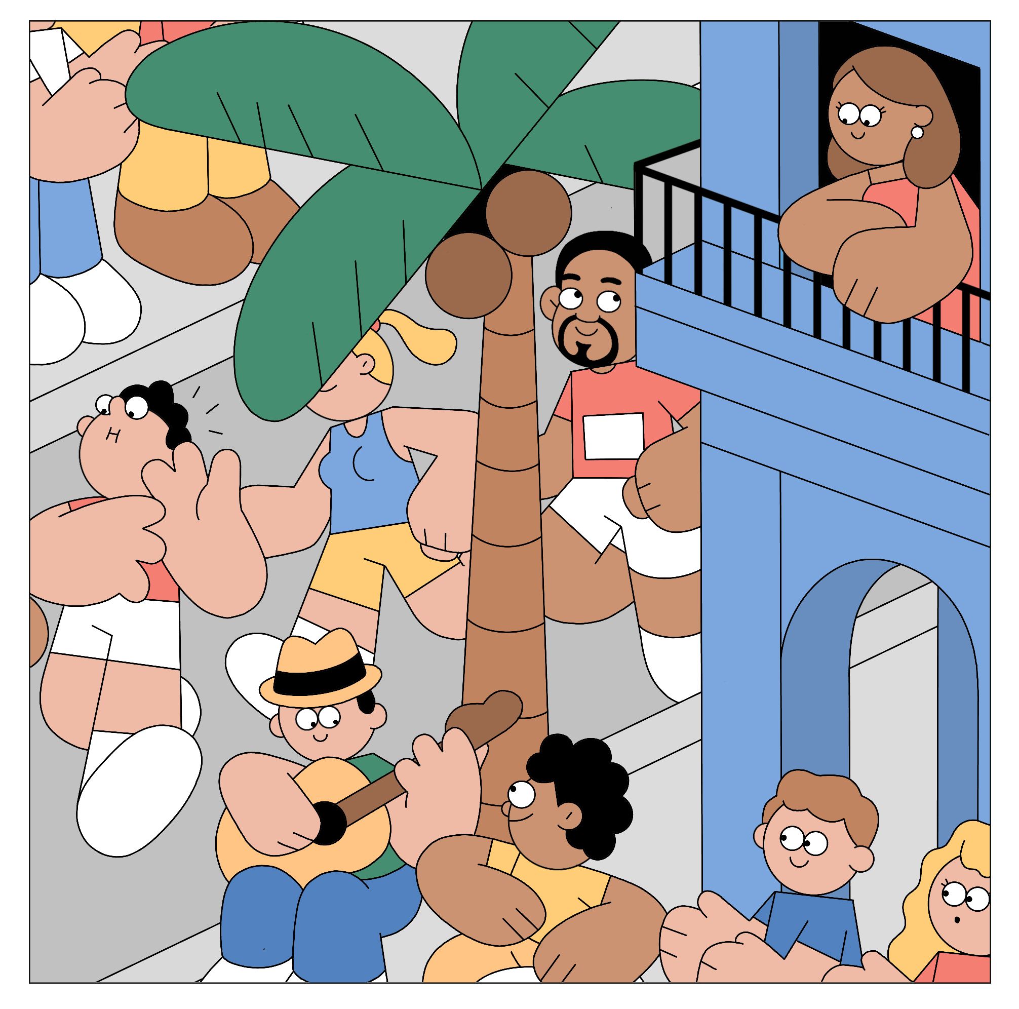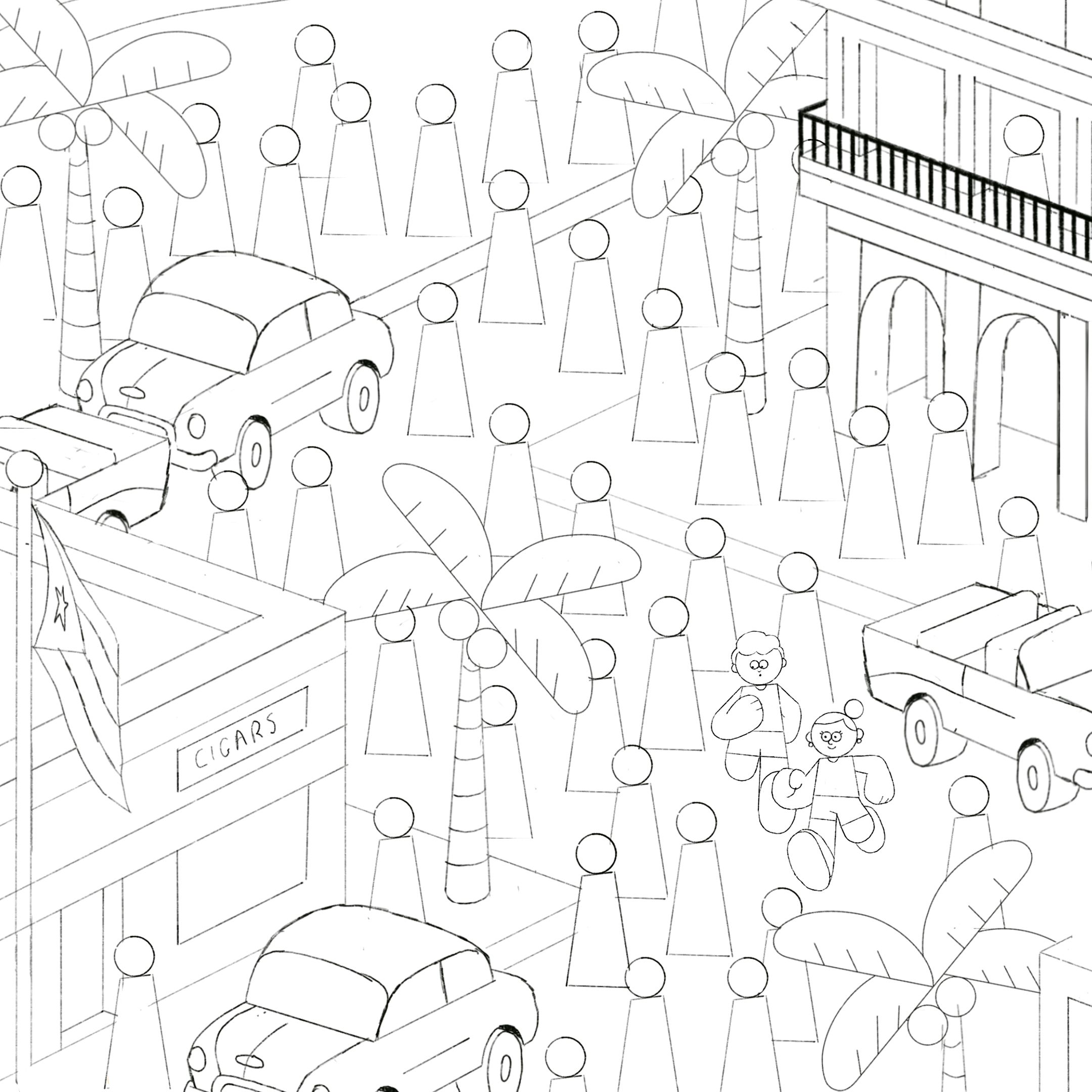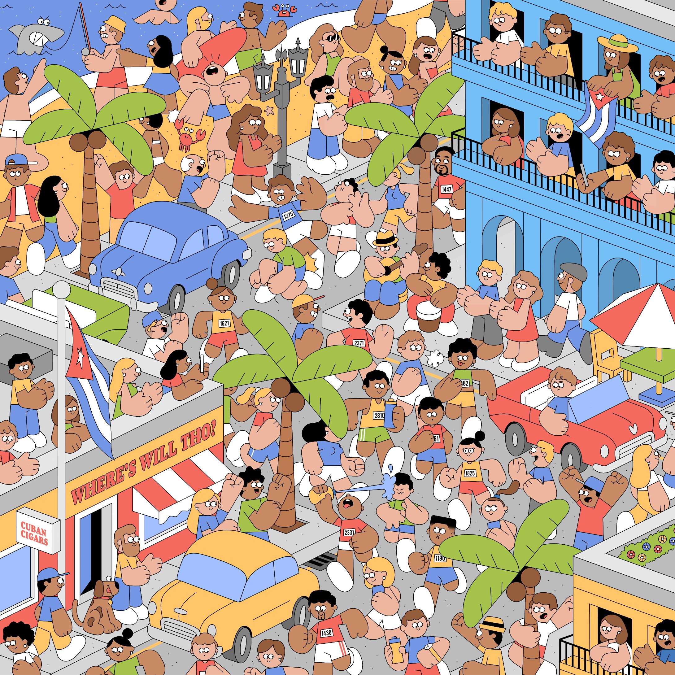 Dan’s final illustration includes typically Cuban elements, from street musicians and palm trees, to the colourful facades of European style architecture and vintage cars. Dan has also included a hiding Will Smith amongst the many figures in the illustration.
