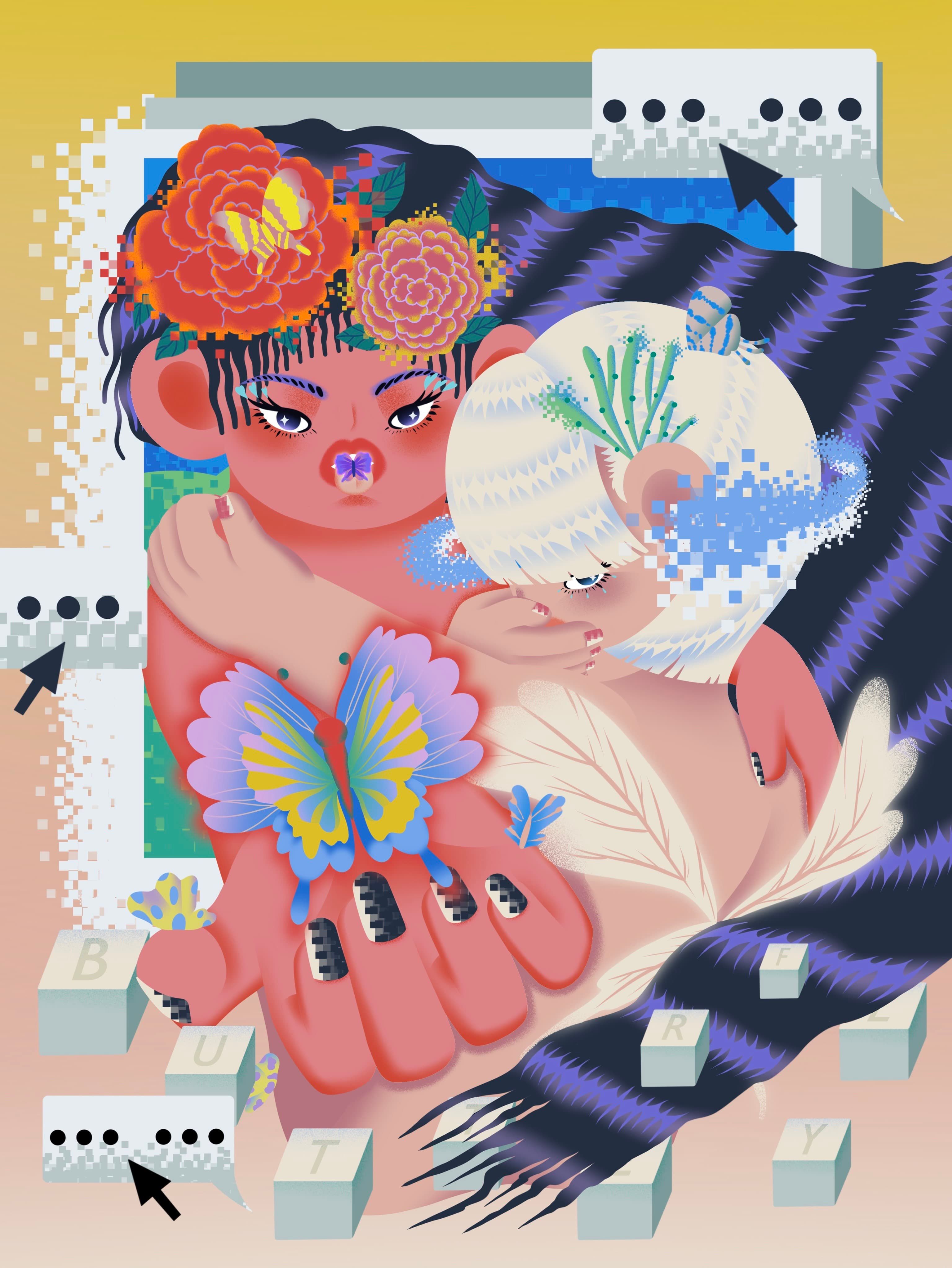Wei Wu is fresh out of studying and has a beautiful style and amazing point of view as an Artist. I can see her going really far. In her colourful, textural illustration style, she uses metaphors to explore topics including love, friendship and nature, and enjoys telling stories about relationships, society and being a woman, all drawing on her cultural experience.