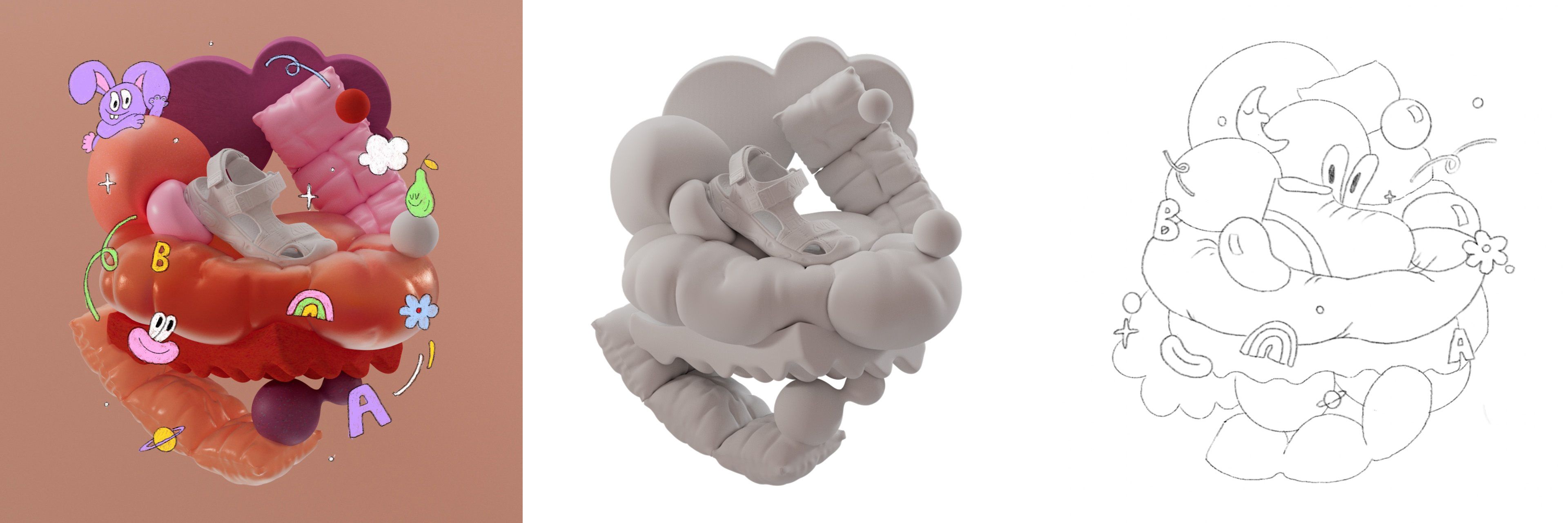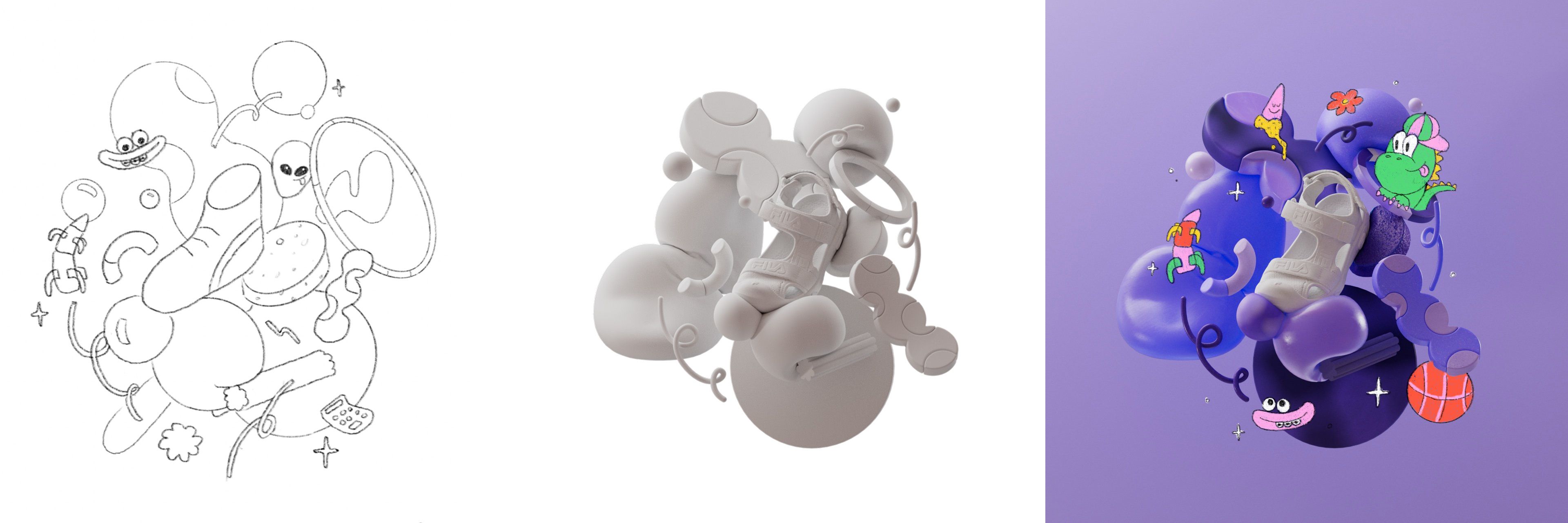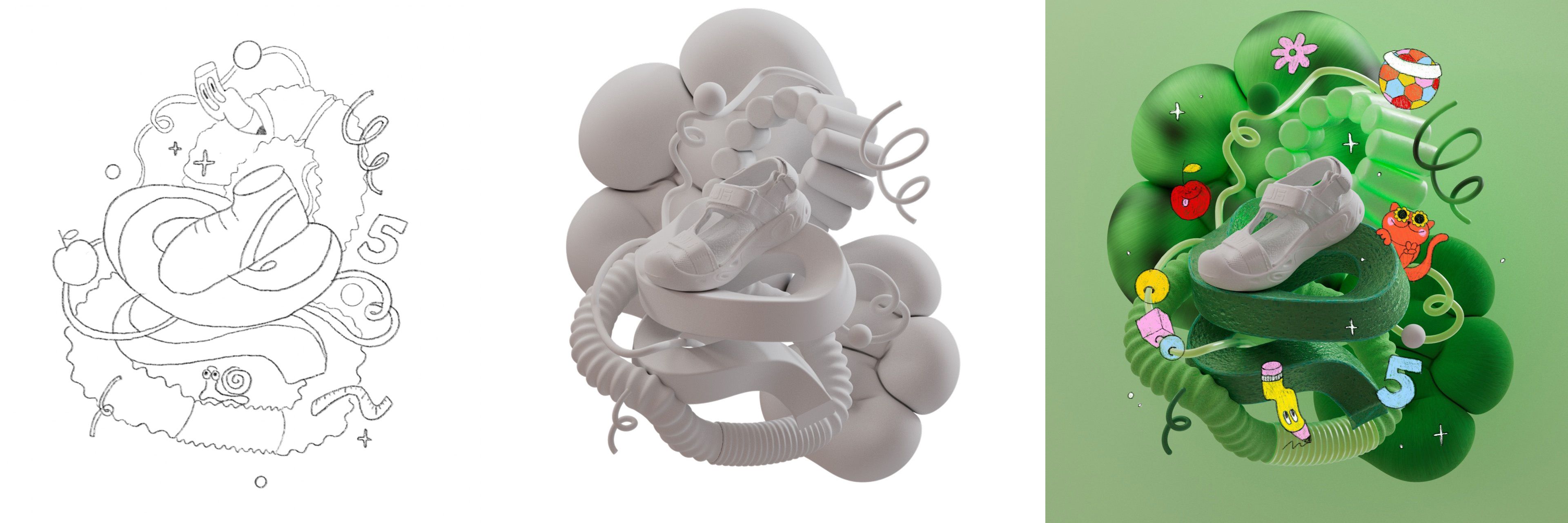 Crafting each design in her classic joyful style, all three animations have unique properties and features that bring the concepts to life, such as Eva’s use of inflated & buoyant shapes for the ‘protection’ shoes, twisted and bendy shapes for the ‘flexible’ shoe, and playful zero gravity elements for the ‘lightweight’ film. To add an extra level of cohesion to the films, Eva 3D scanned the shoes so that they could exist realistically within the digital worlds.