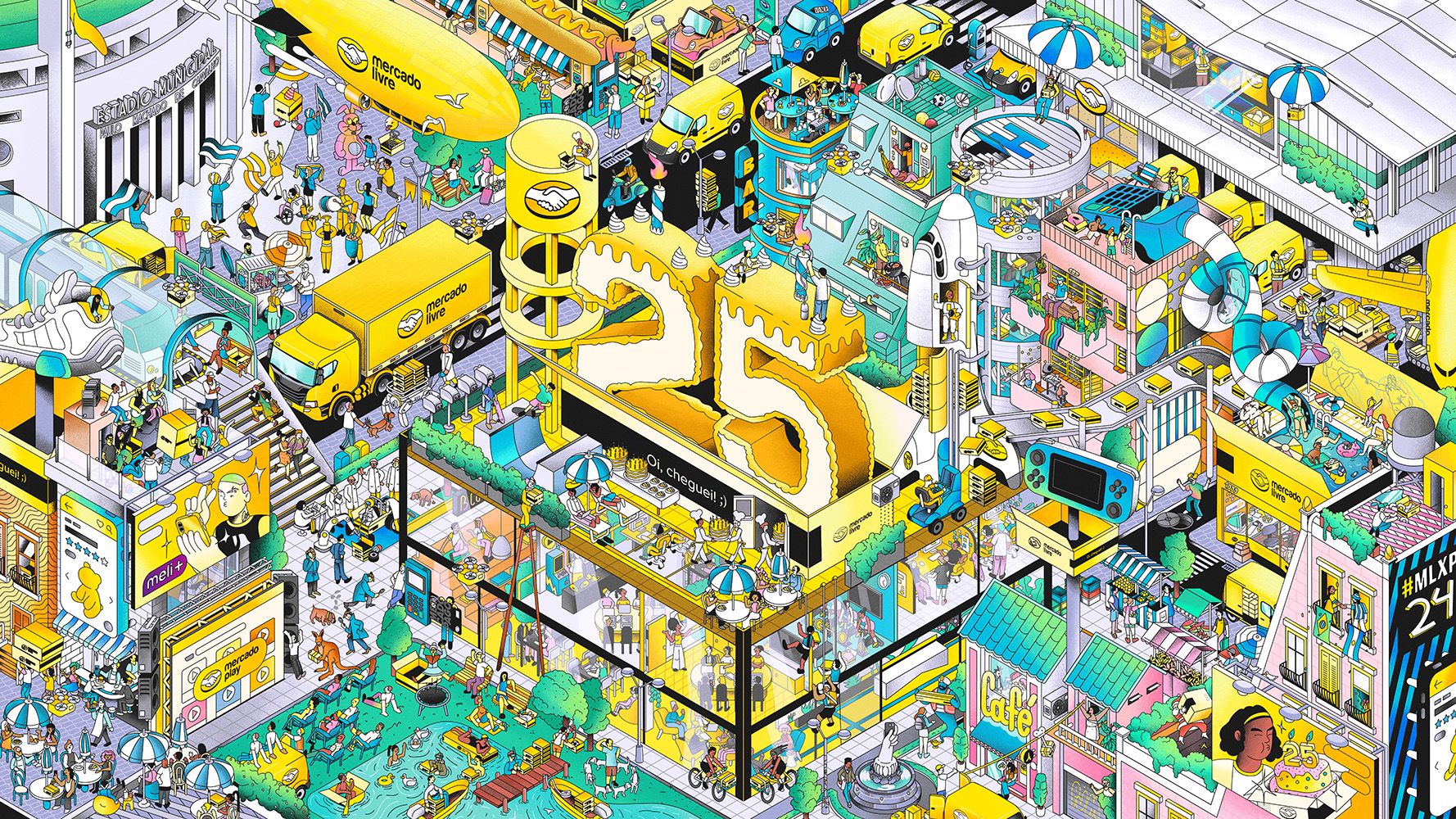 Working with agency Brodeur, Pum crafted an intricate isometric design for Mercado Livre, the largest e-commerce and online marketplace platform in Latin America which is celebrating their 25th year of business.