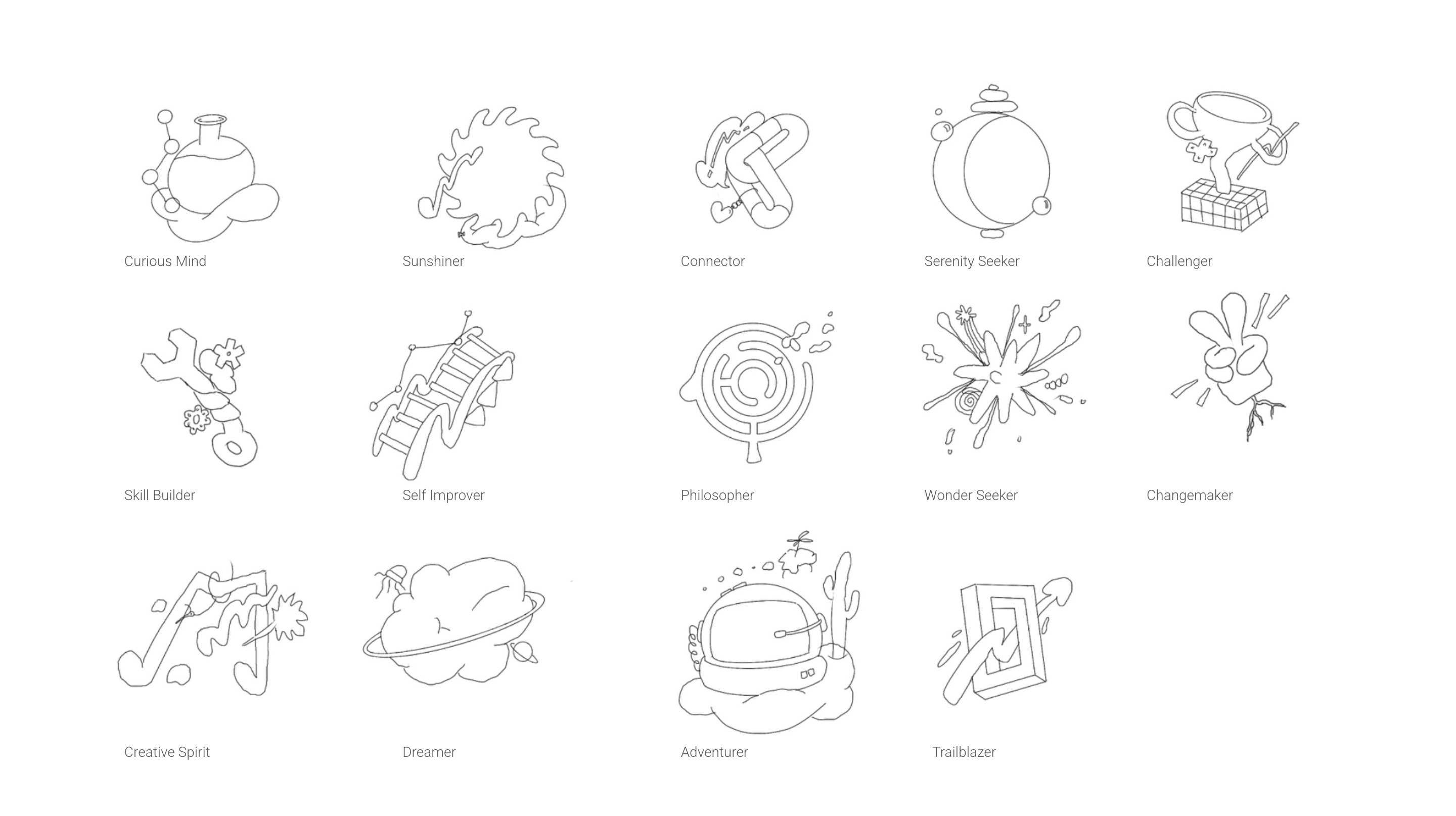 Considering all elements of each personality type, every character was crafted with unique inspirations, textures and organic shapes. Beginning with pencil sketches, Eva explored the essence of each personality card to streamline the visual design without relying on literal interpretations.