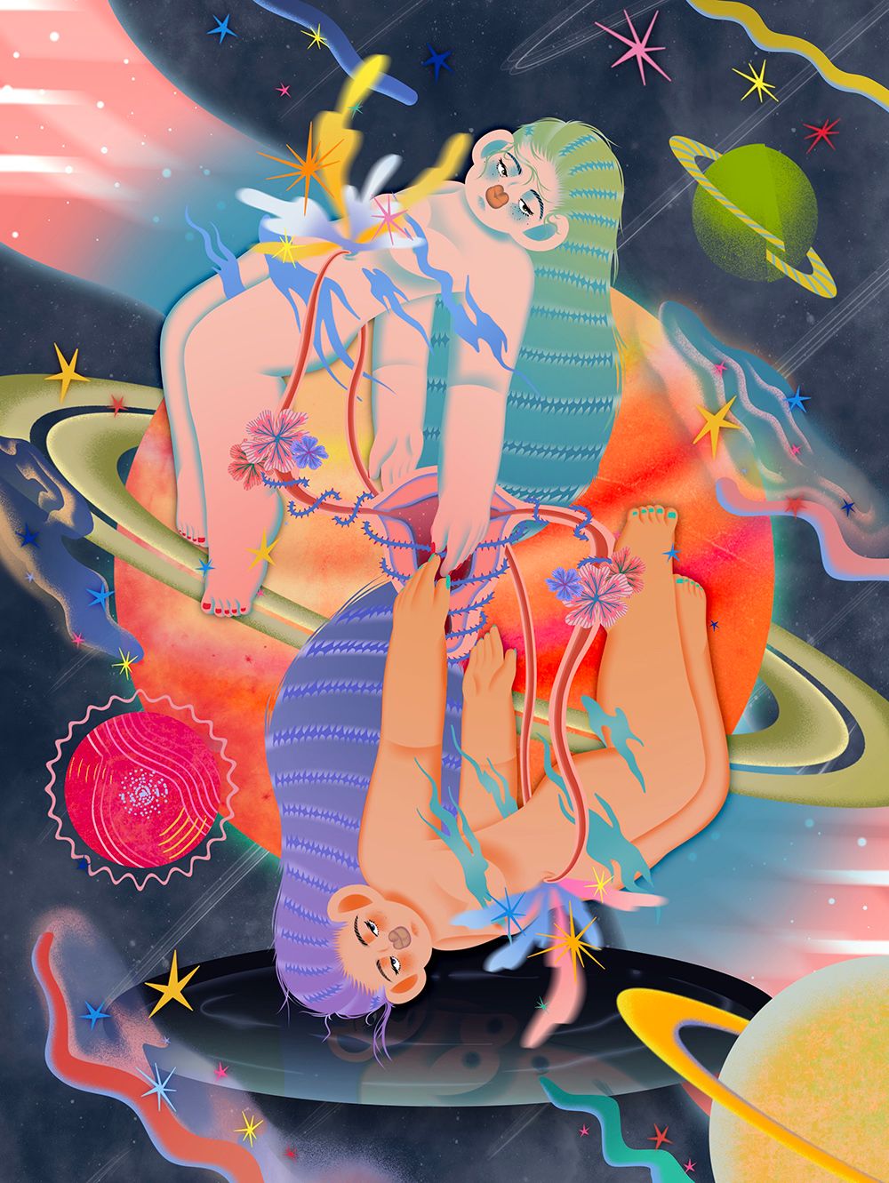 Wei finds sensuality in nature with Glimpse and Purpose Disruptors, crafting illustrations for their 'Ecokamasutra' book, a unique read which encourages more young people to connect with nature on every level. Born from the concept of ecosexuality, the Ecokamasutra is a sex-positive and colourful exploration of nature which aims to showcase how everyday interactions with the natural world become moments of deep connection.