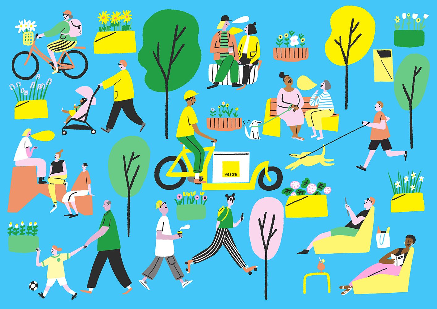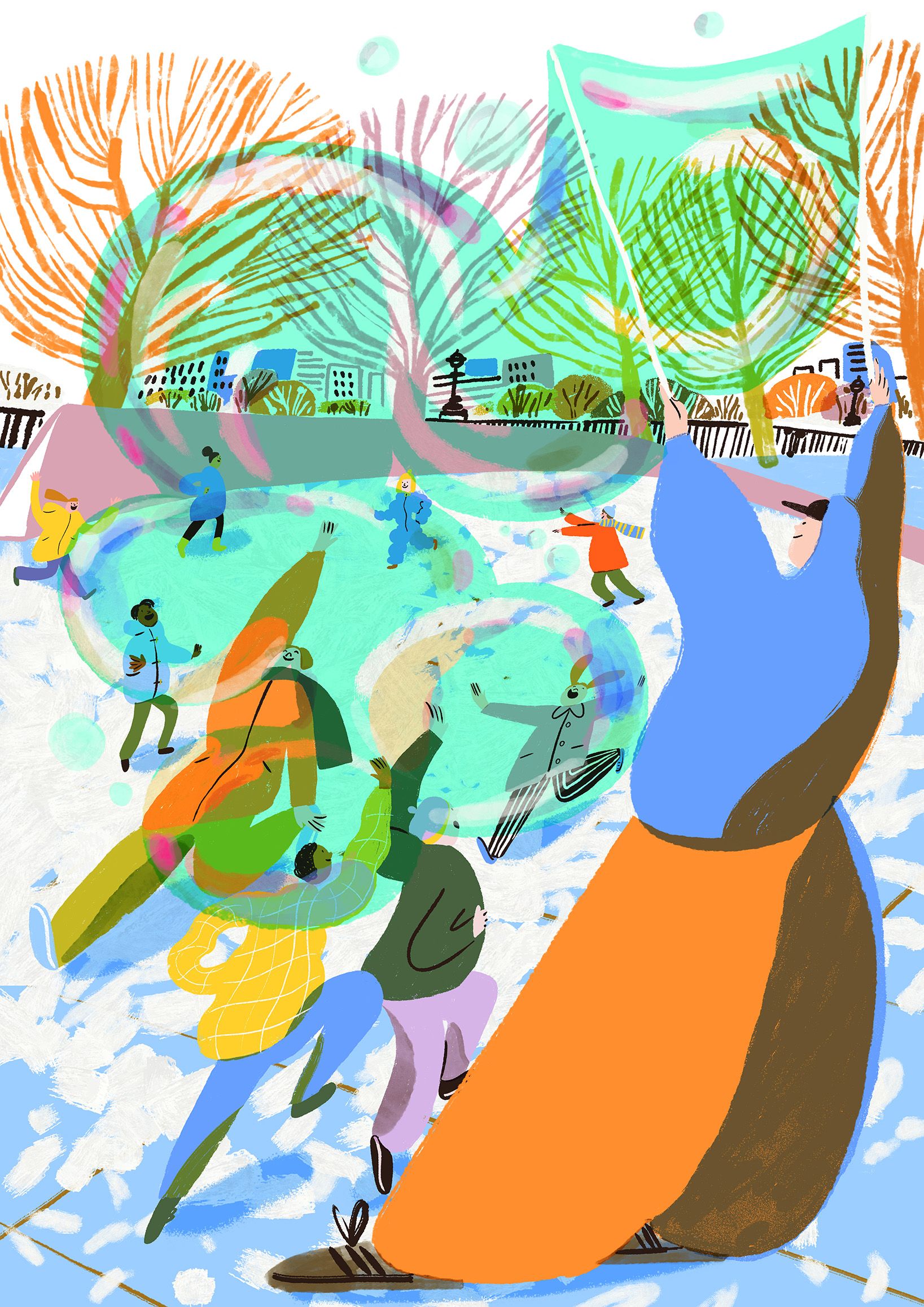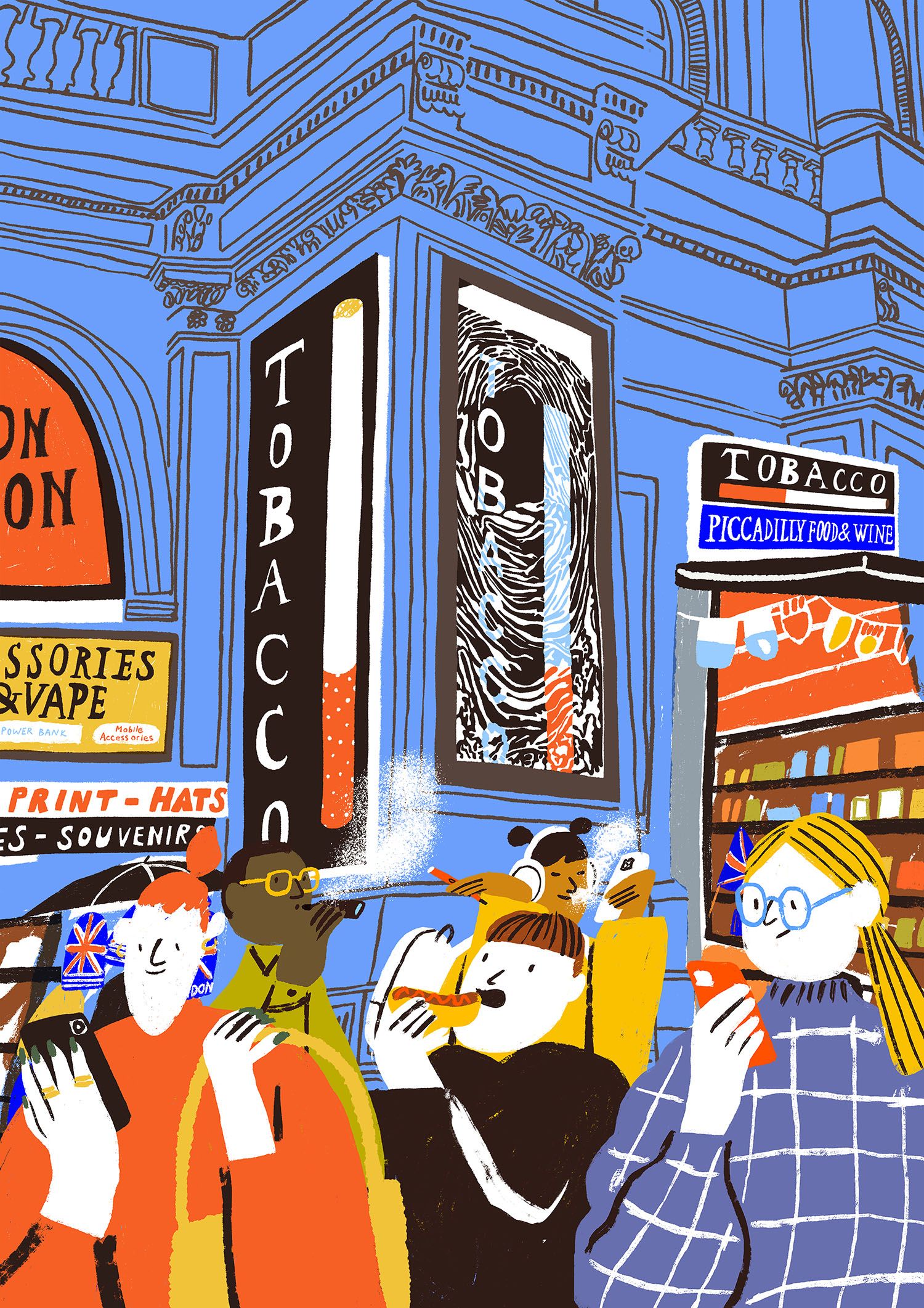 I think the work I did for Vestre was aided by my observational drawing. And then a personal project that was an example of capturing two very different moments in London Tobacco, tobacco, tobacco and Bubbleman!! Both very different scenes of disconnect and then joyful connection. People on their phones, ignoring each other under a squashed vintage tobacco advert / poster. The second, children playing after the Covid lock downs with giant bubbles on the Southbank, finally free of their lockdown “bubbles” - loved capturing both these moments.