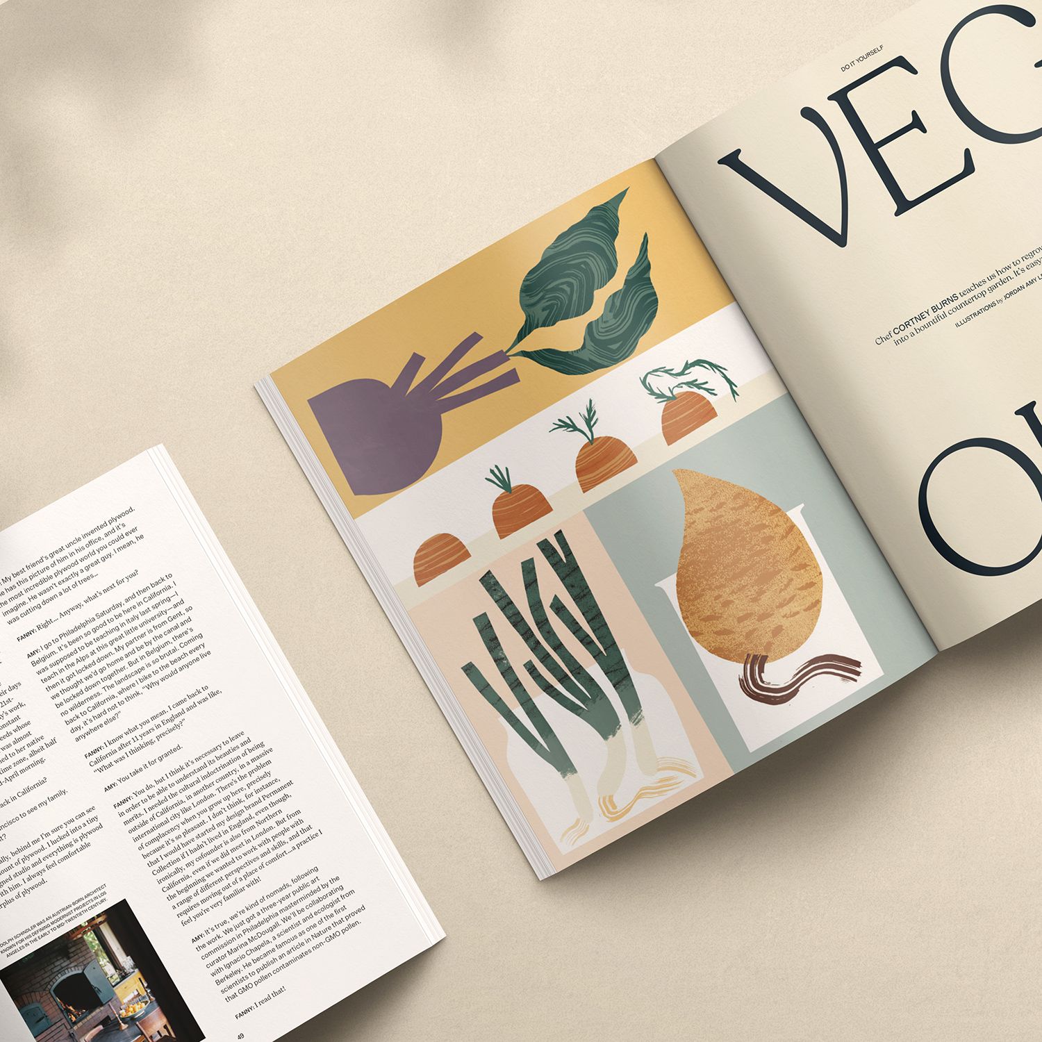 Launched by sustainable food subscription brand Alltrue, All Good Things is a quarterly print magazine dedicated entirely to conscious and sustainable living. The magazine is included in each seasonal Alltrue box with Jordan designing the covers and illustrations accompanying the features for the summer 2021 release.