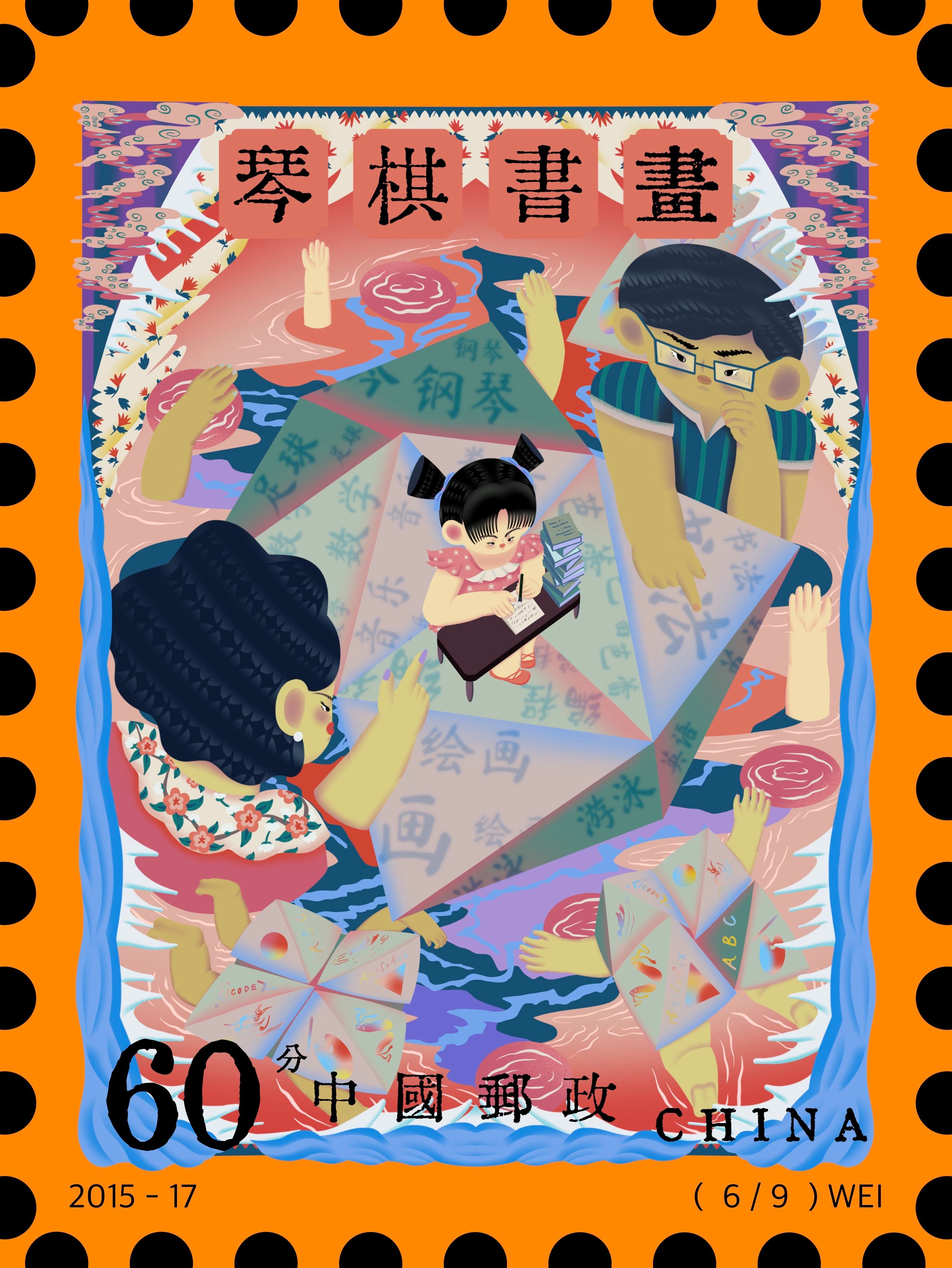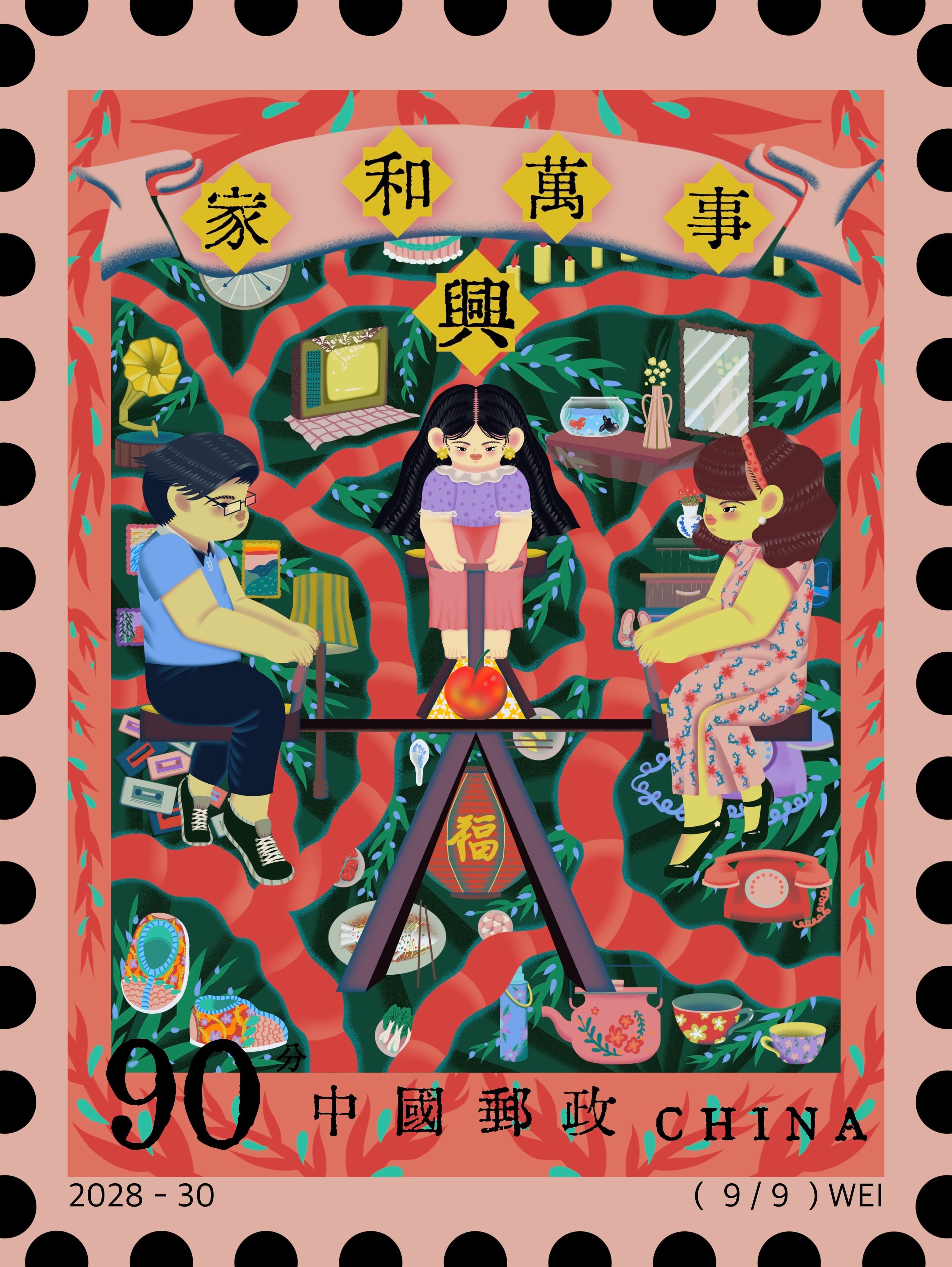 A series of stamp designs depicting the experiences of being a part of China's one-child policy.