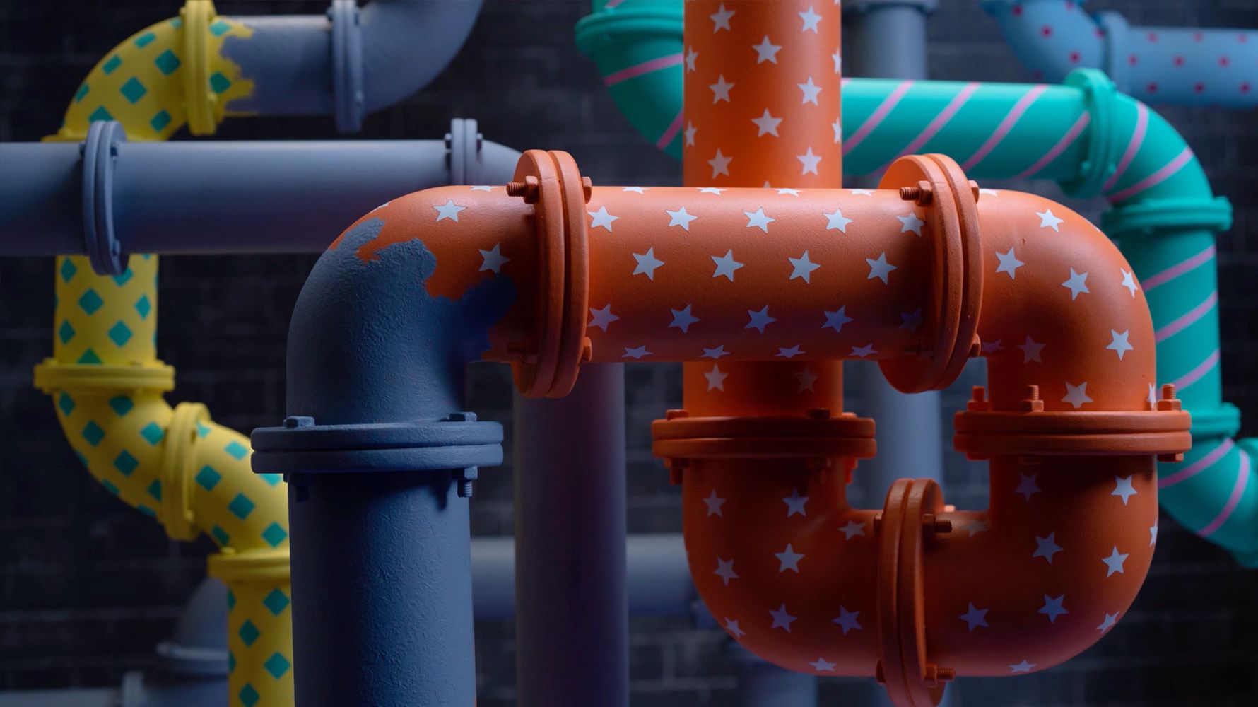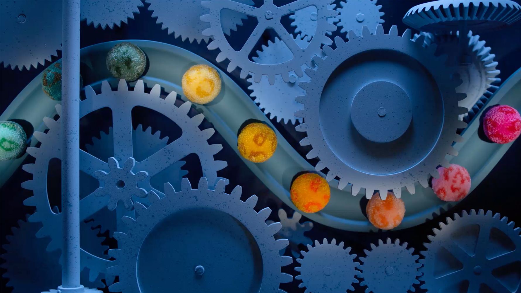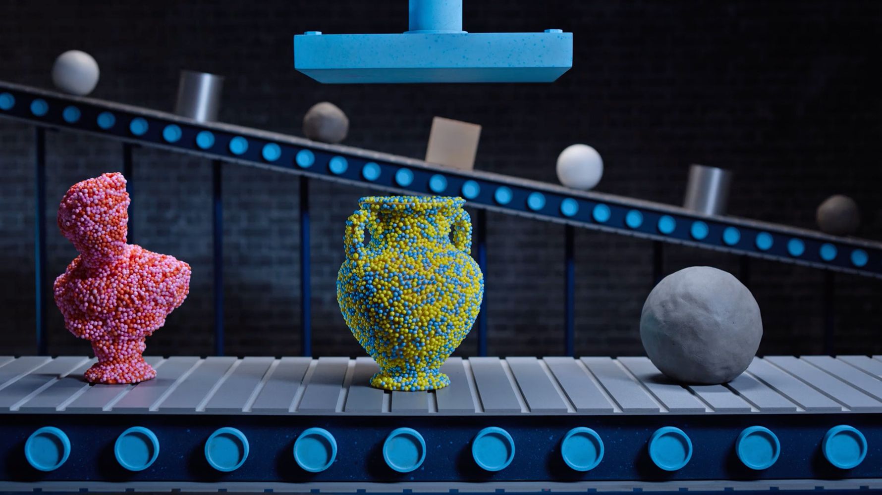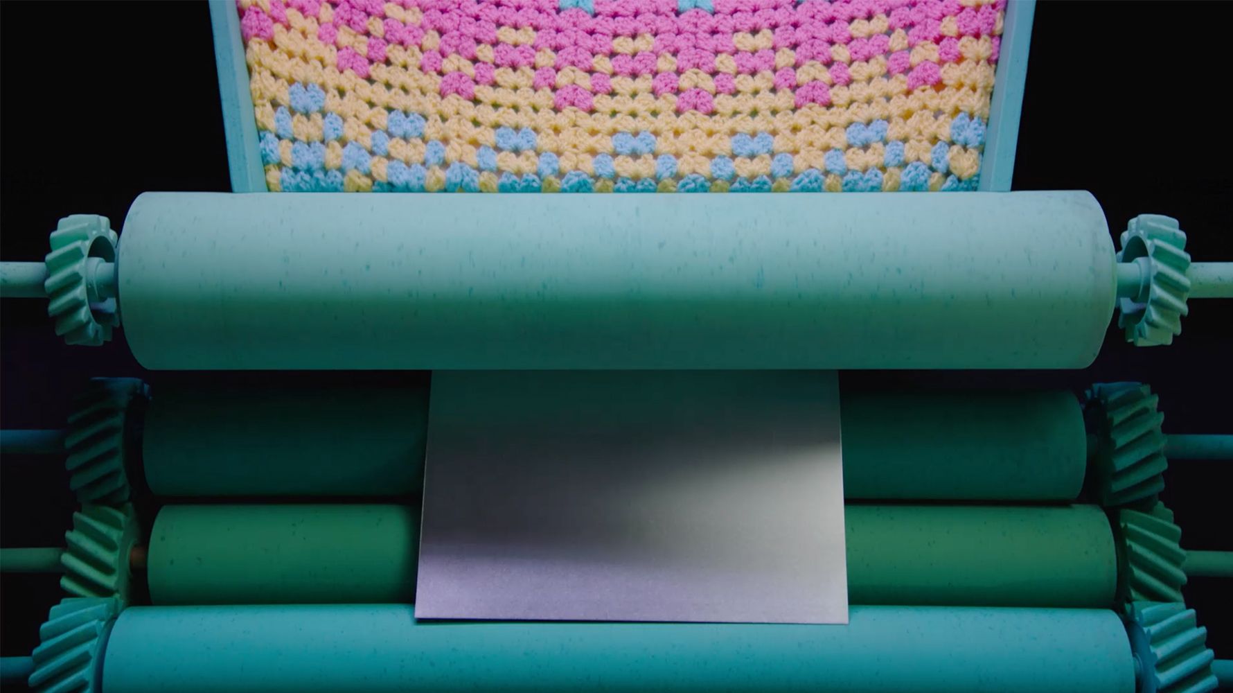 Matte designed a series of undefinable factory machines that come to life after the power switch is thrown, transforming mundane raw materials into an assortment of multi-coloured craft delights.