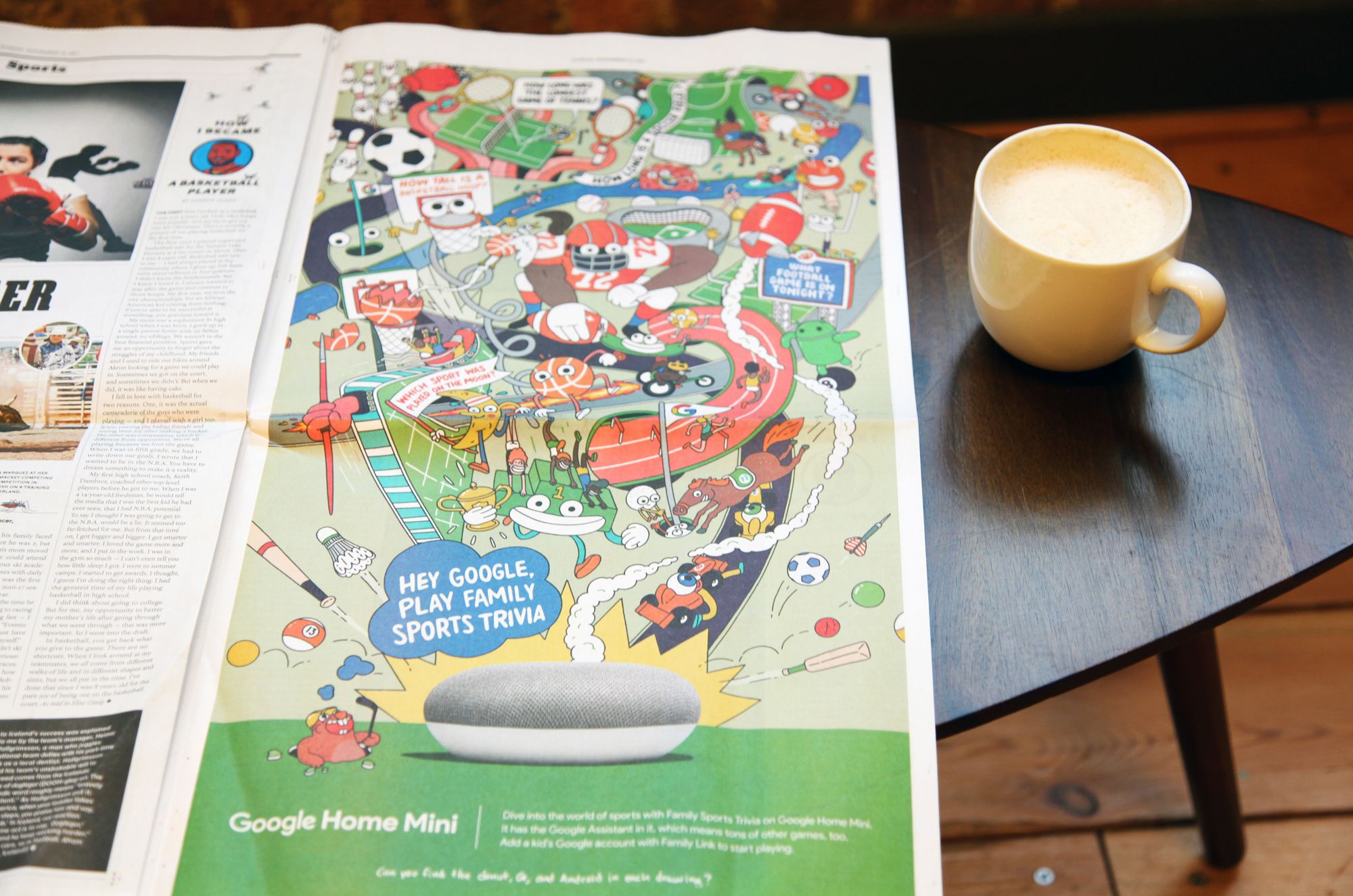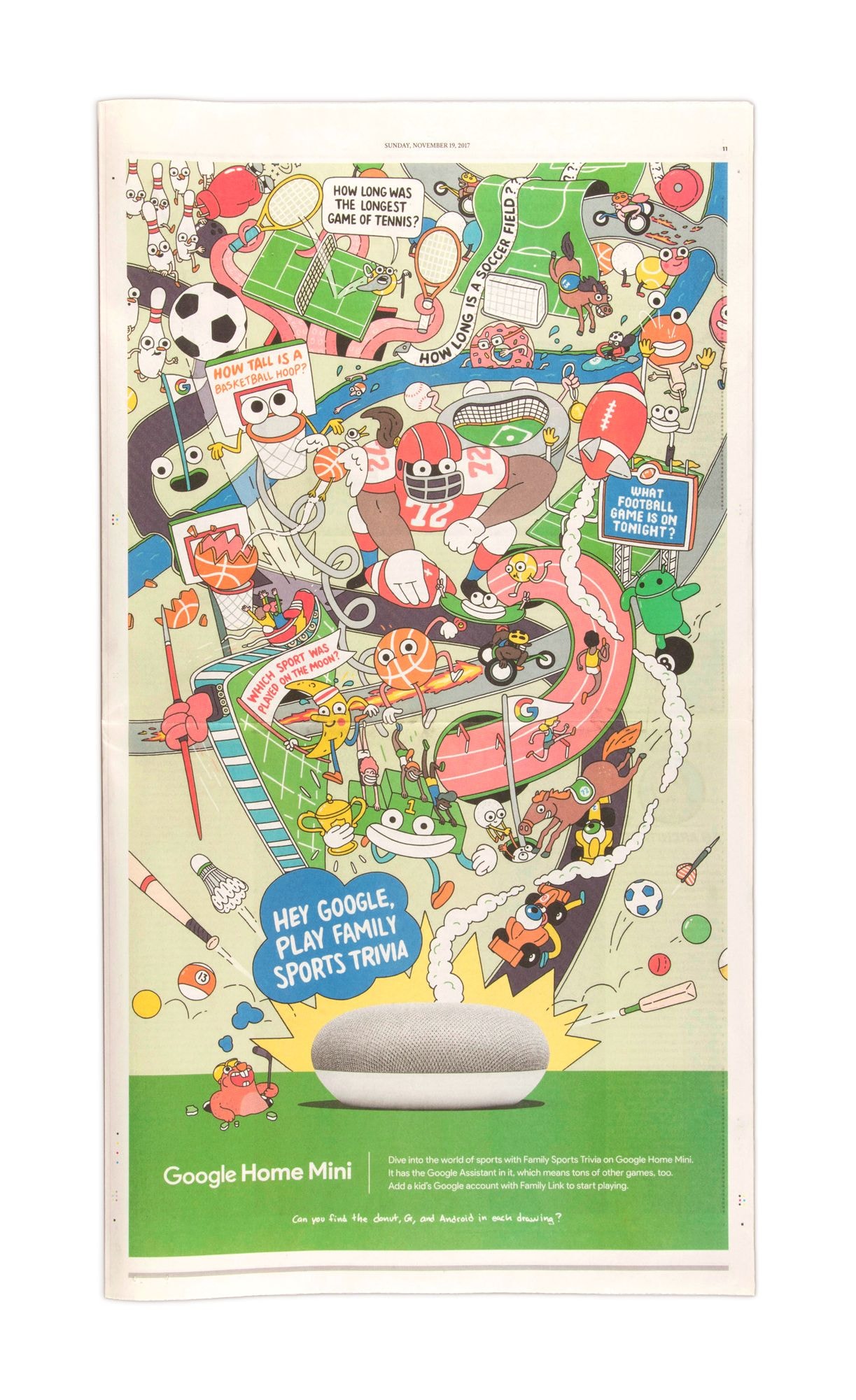 The main ‘call to action’ the ad wanted to achieve was prominently placed right next to the Google Home Mini, “Hey Google, Play Family Sports Trivia” along with smaller related questions that one might ask Google, peppered throughout the illustration.