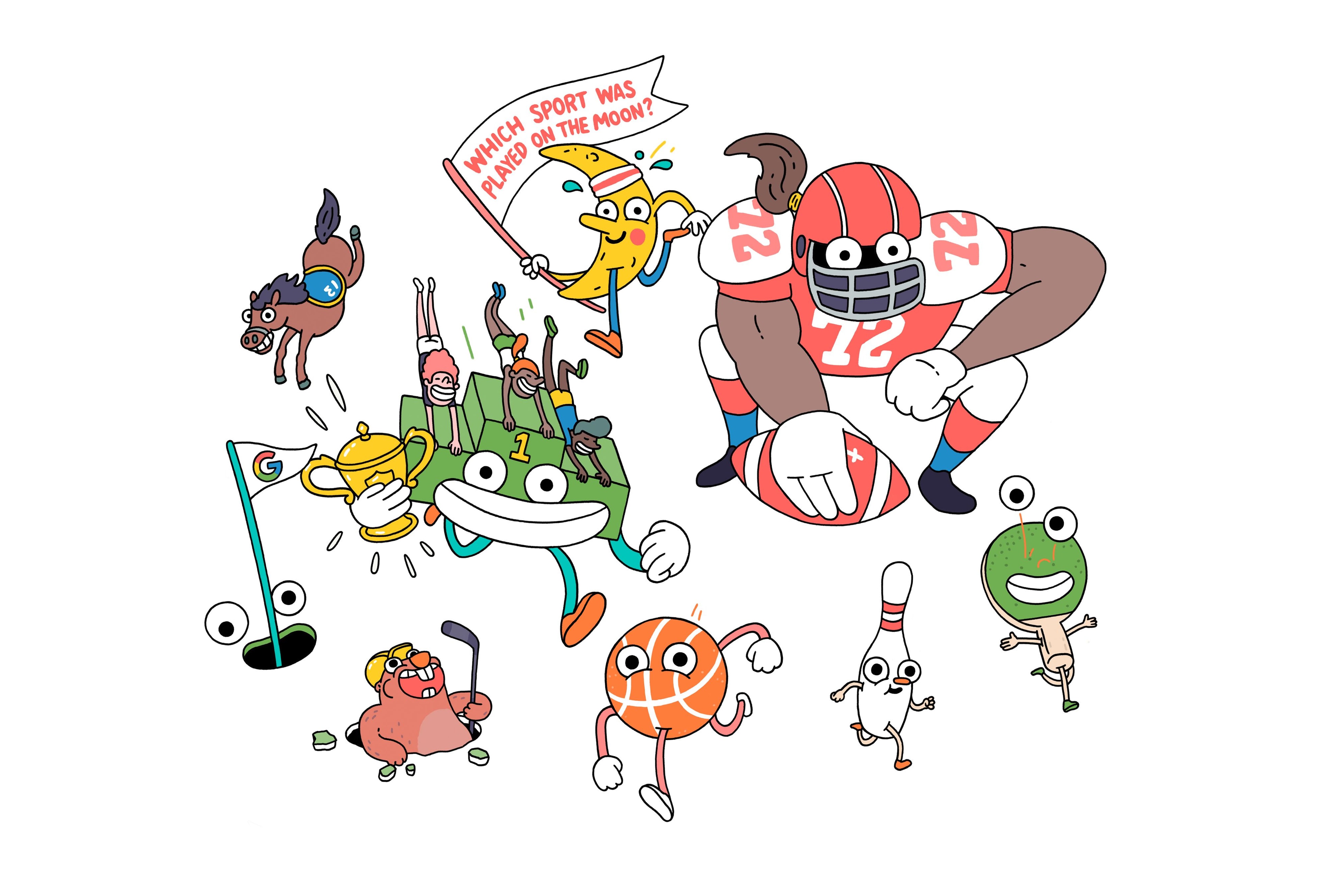 Queue a whole host of sports-related illustrations, from footballs, basketballs and tennis balls, to baseball bats, darts, golf clubs and horses as well as rogue trophies, running tracks, podiums and rivers.