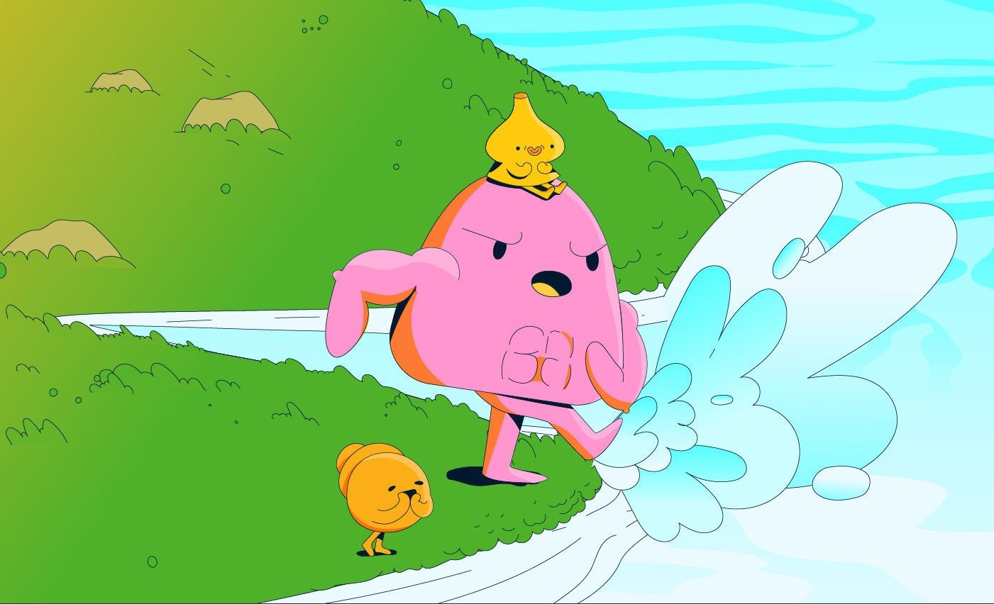 ‘The whole idea of the brand and portfolio animations were to convey energy. We took inspiration from modern dances for a couple of movements and then made sure to give each character its own unique feel. For the Sparkling Probiotic Drinks product videos, we needed to go down a much more chilled vibe. Still keeping to the principles of each character having their own feel, we wanted to convey the relaxation you get from the scenic illustration, using the sparkling bubbles as a way to transport us through the main Probiotic piece tying the product and animation together.’