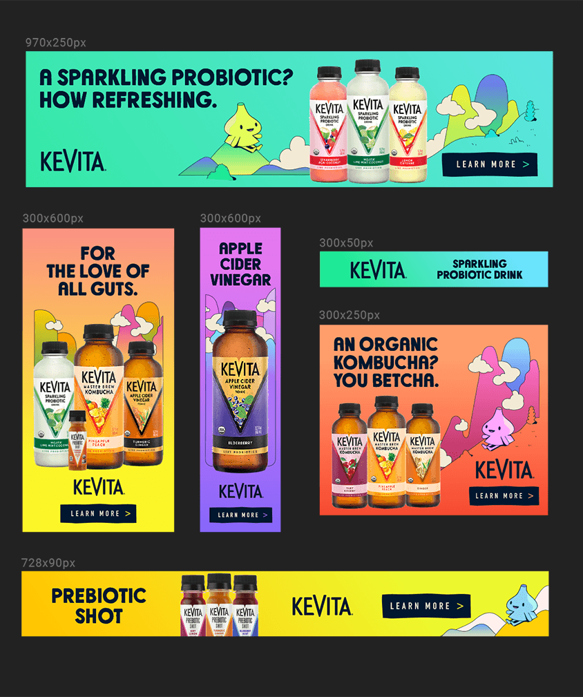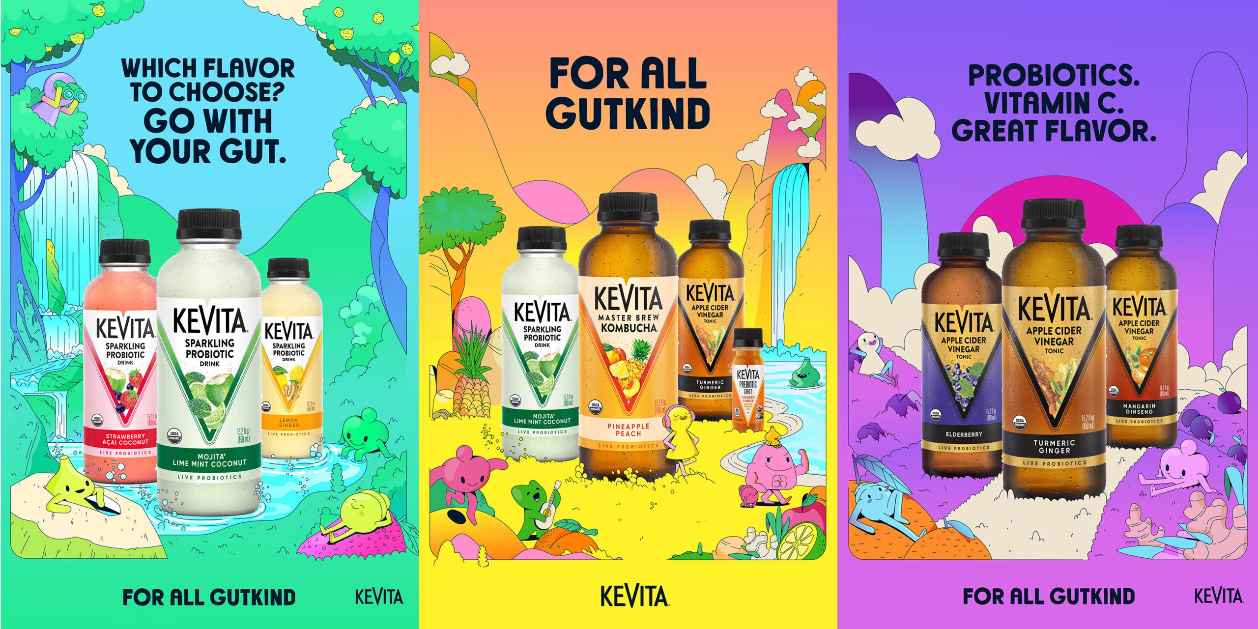Working closely alongside Adam&EveNYC, Estudio Pum were commissioned together with KITCHEN to develop a new visual world for the US probiotic and prebiotic drinks brand KeVita. ‘For All Gutkind’ is an ode to each and every kind of gut there is.
