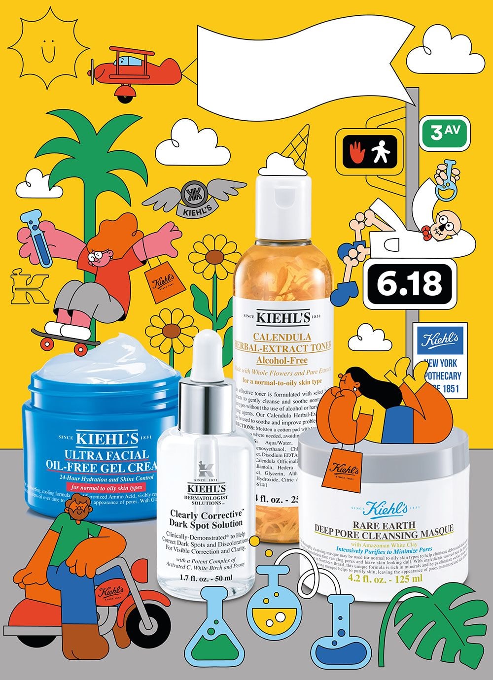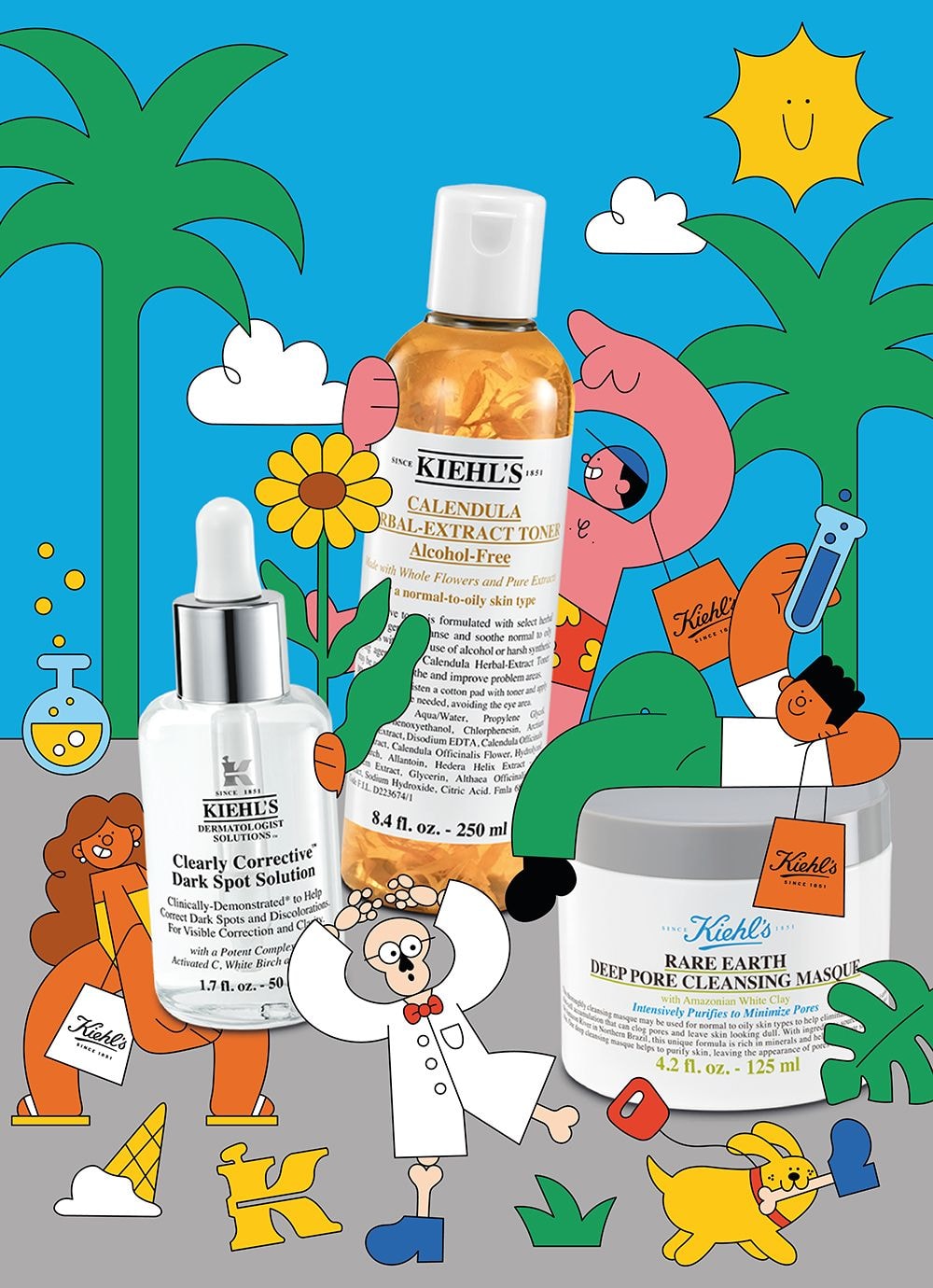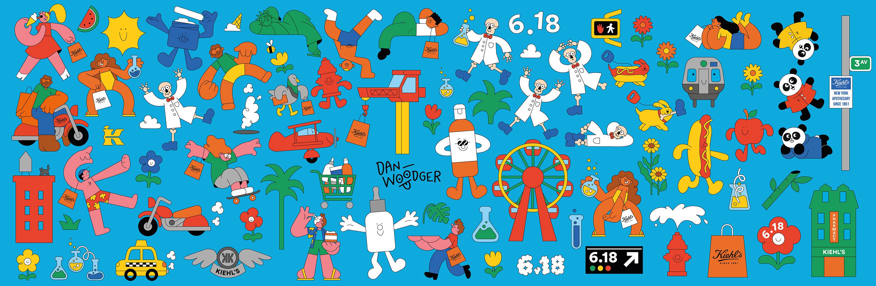 Tasked with creating a joyful and saturated summer campaign, Dan Woodger lent his vibrant characterful style to skincare brand Kiehl’s and their 618 shopping festival. The brand has a long history with providing adventurous science-backed products to consumers who care about their skin, so the illustrations for the campaign needed to reference the spirit of the brand while also remaining truthful to Dan’s instantly recognisable design style.