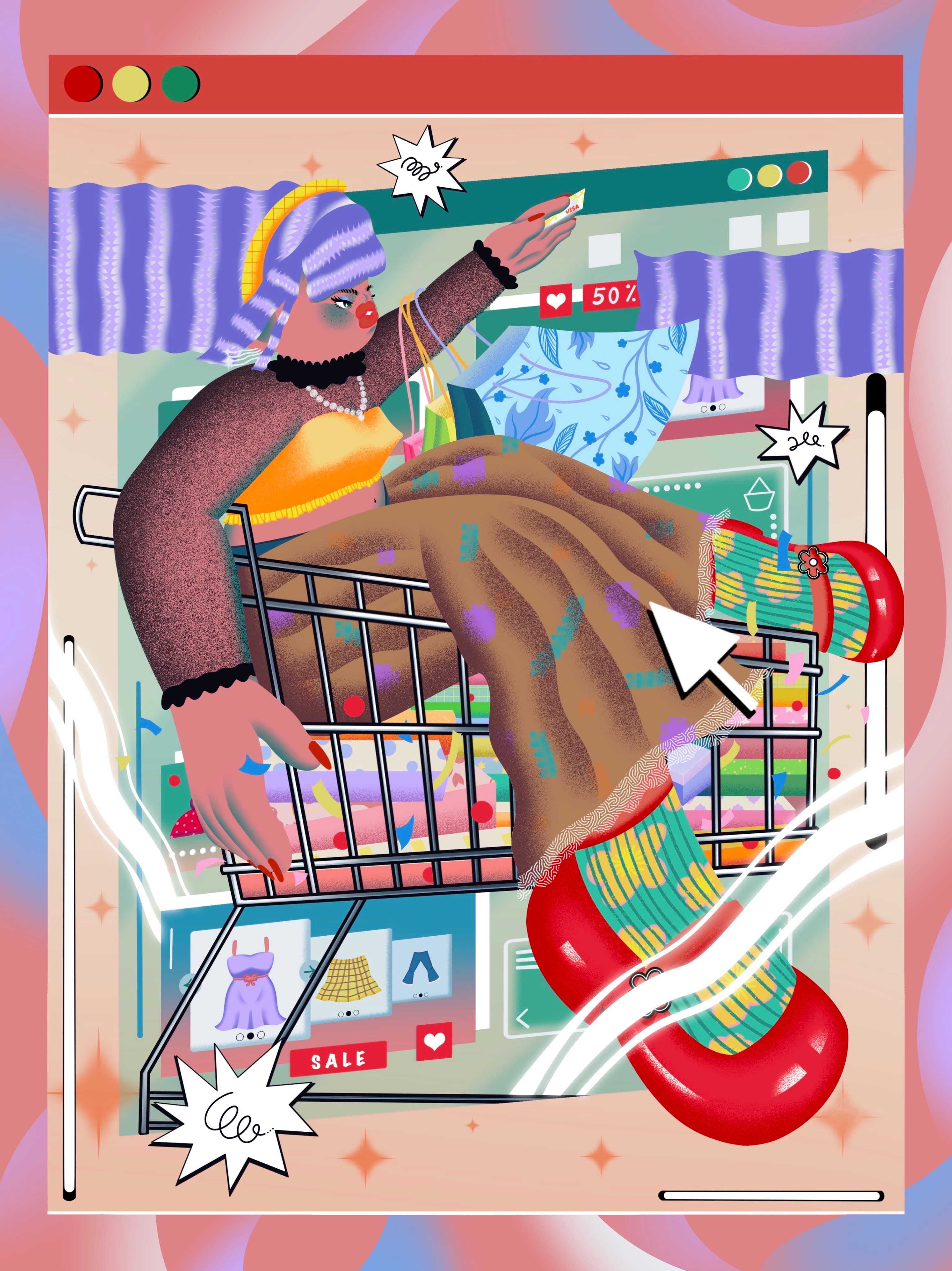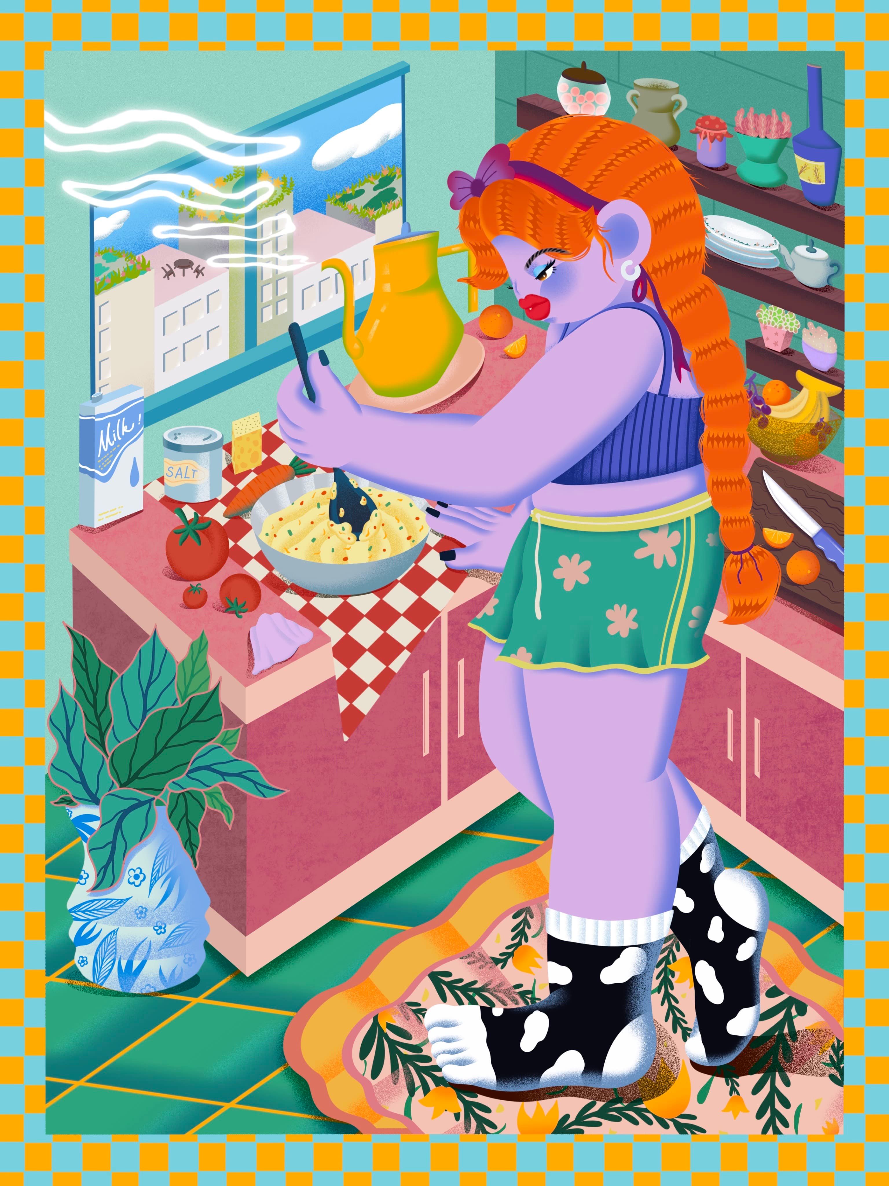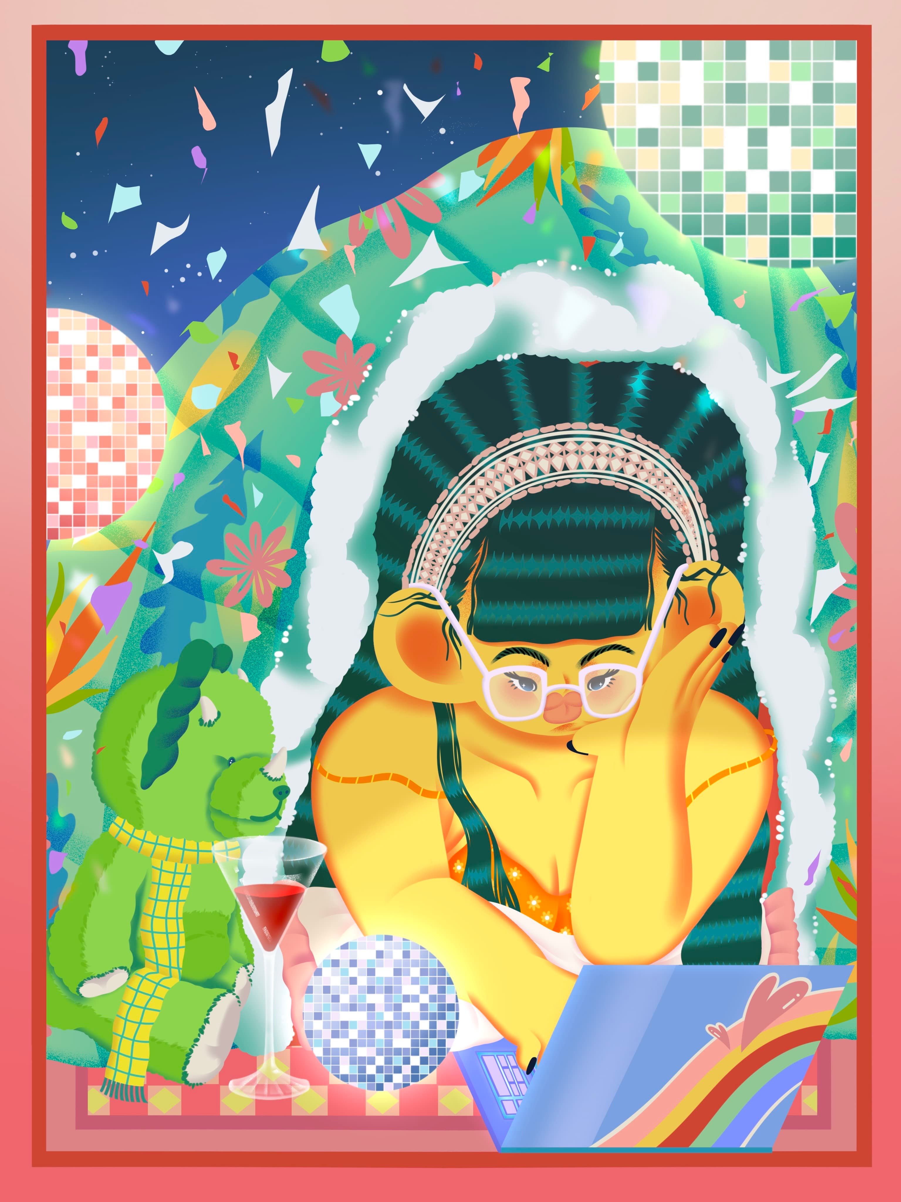 In this series of illustrations, Wei takes inspiration from her own life living alone in a busy city. Influenced by everyday moments that unite young women, Wei creates the designs in her signature colourful style. Each piece takes a moment of solitude and finds the beauty within it, whether that's applying makeup in the morning, online shopping or getting a little tipsy.
