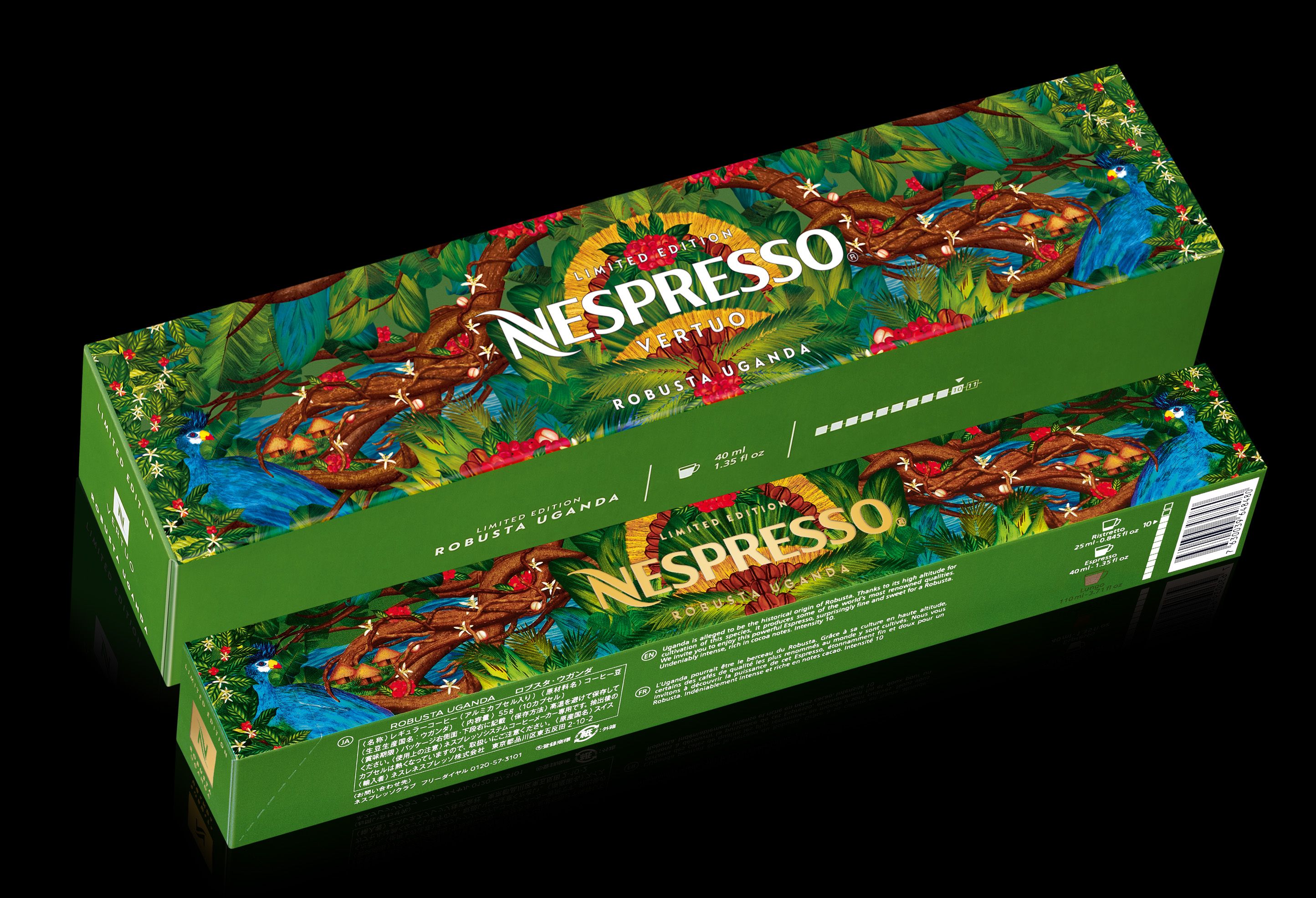 The Robusta Uganda grows near lakes, low mountainous landscapes and lush vegetation and it’s more intense and deeper, with notes of chocolate — this translated into darker browns, deep greens and blues.