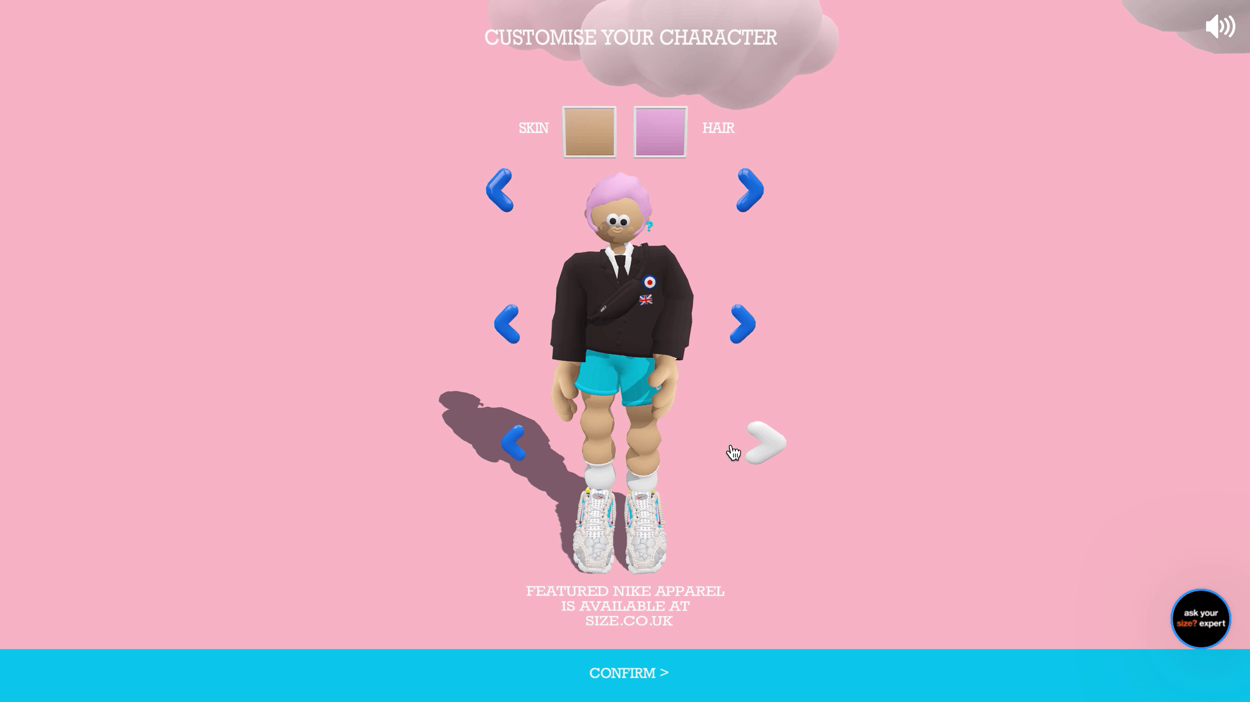 The user is asked to select their character, designed by Eva. Starting with base options in race and gender, the user is then able to select from options of clothing and hair styles that pull from different subcultures of Carnaby that make up the inspiration behind the shoe. The variations in apparel include the Carnaby items such as the ‘welcomes the world’ sign fleece and always wear the Zoom Spiridon Cage 2. The subculture options include a mohawk (punk subculture), a pair of floral flares (hippy subculture) and mods.