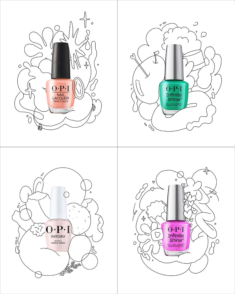 Beginning the project with initial sketches, Eva centred the iconic O.P.I bottle shape to ground her compositions and set about designing the motifs that would accompany the product, which needed to subtly nod to the name of the shade without being too literal, so ‘Bubble Bunny’ became a soft, translucent world with inviting fuzziness, ensuring the design stayed at a mature level without compromising on fun.