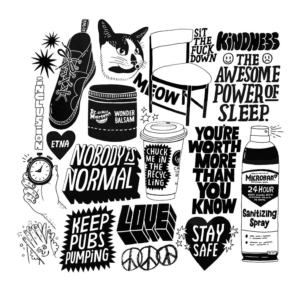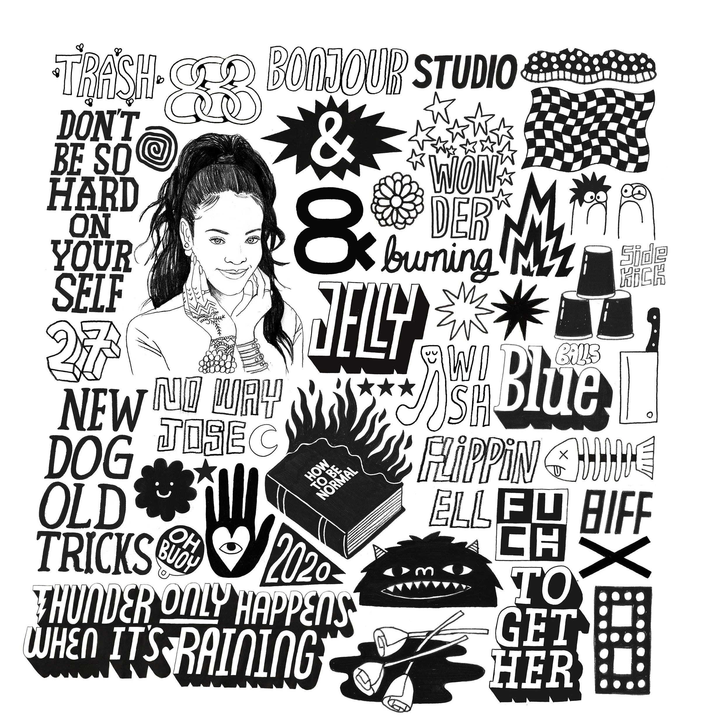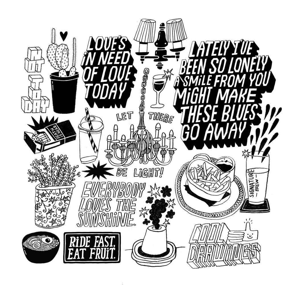 The tactile feel of the sketchbook pages gives life to music lyrics, pretty pints and little characters, bursting with humour and joy. Sometimes they're inspired by Jeff Goodblum, a game of Perudo, local taco places in Leyton or live music - whatever sparks the creativity!
