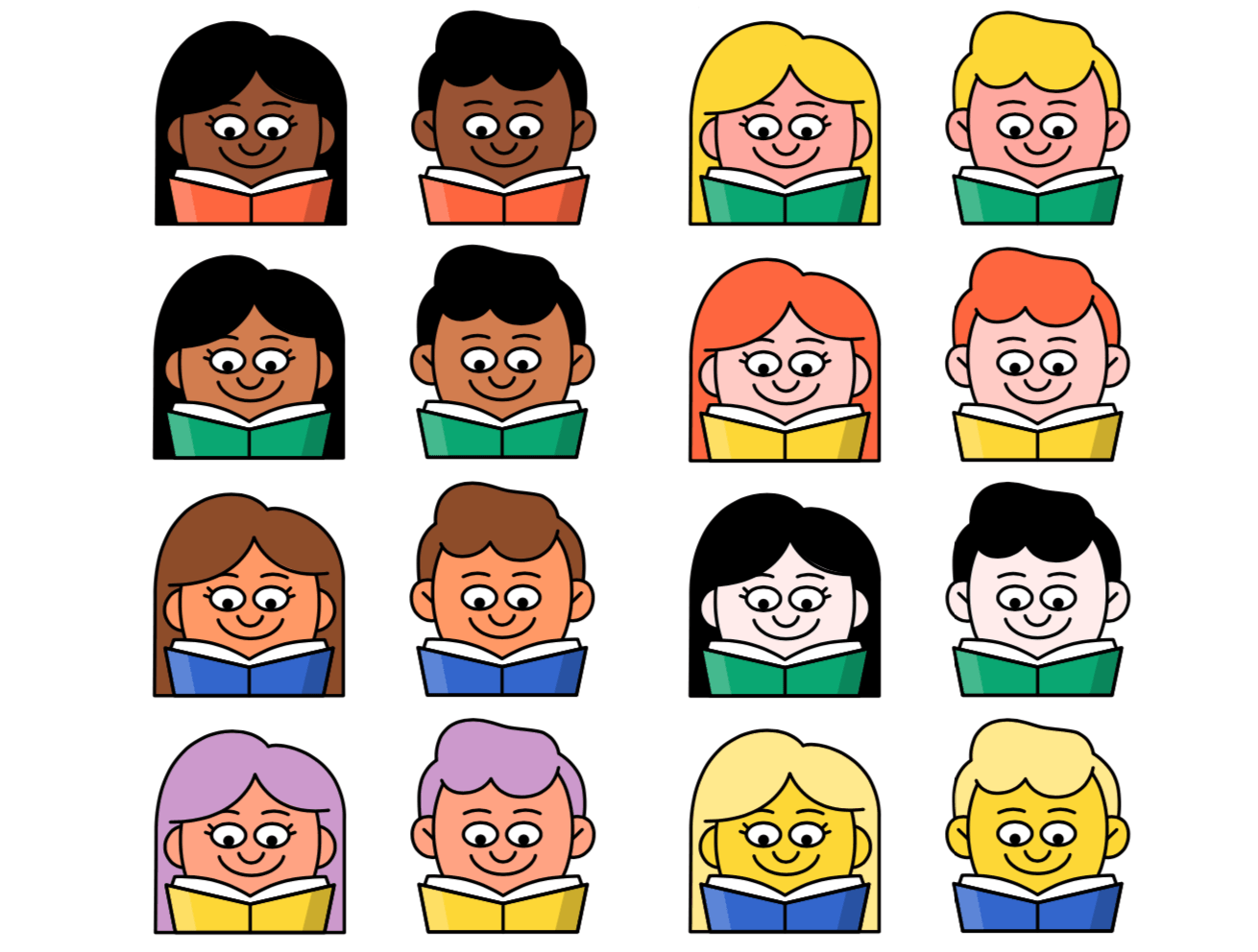 Working on a small scale, Dan used his trademark, retro style to create a variety of different emojis for people to use to express reading. These fun, character-filled emojis capture the ups & downs of a good read while also showing a mix of reading characters in different skin tones.