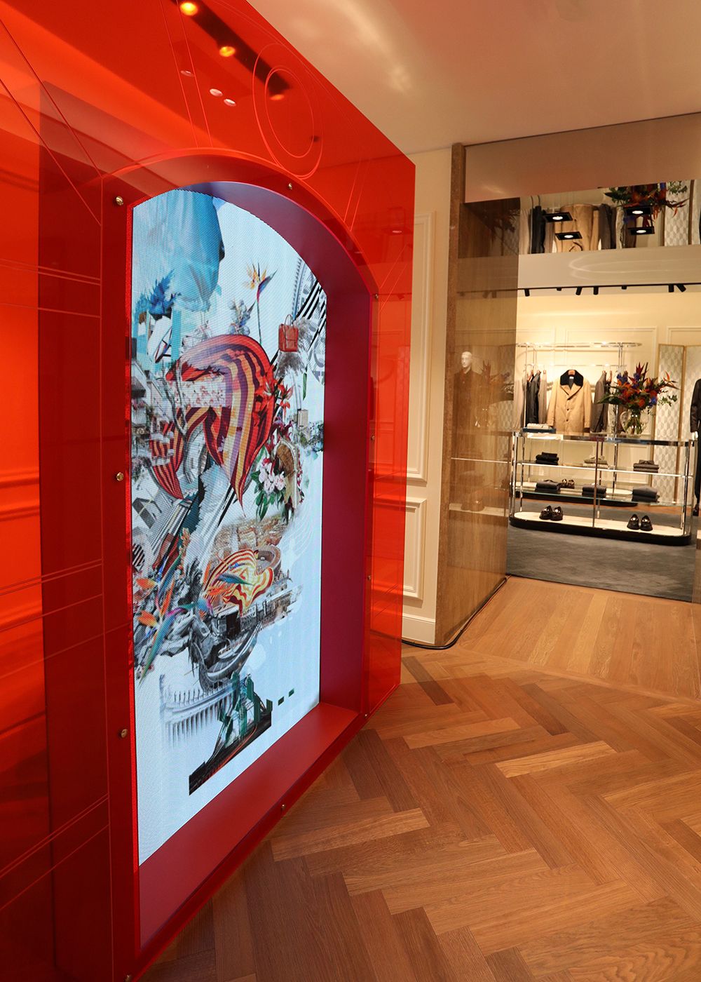 The video was then projected during the re-opening event at 65 Via Condotti on 2-metres high LED screens, taking the guests into a hypnotic digital journey into the artwork.