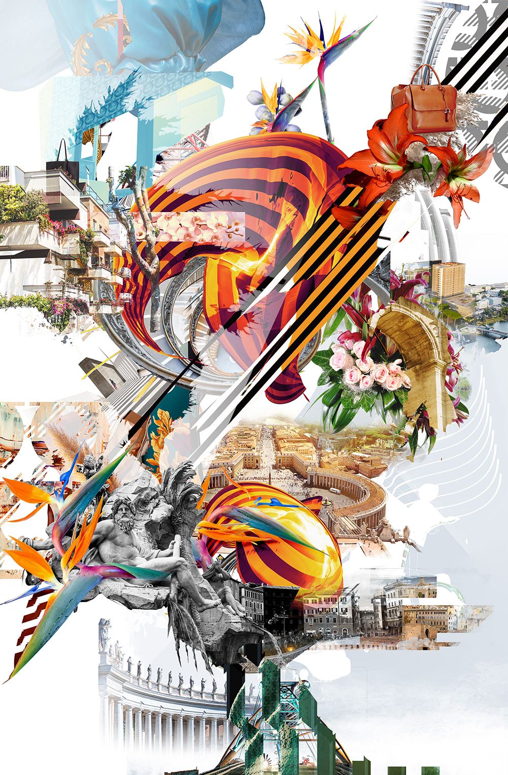 “I always had a cinematic view in mind when creating the artwork because the history of Rome being used as a sort of film set. Placing things in the bottom left-hand corner and then being able to flow up almost like you’re taking flight over the city.”