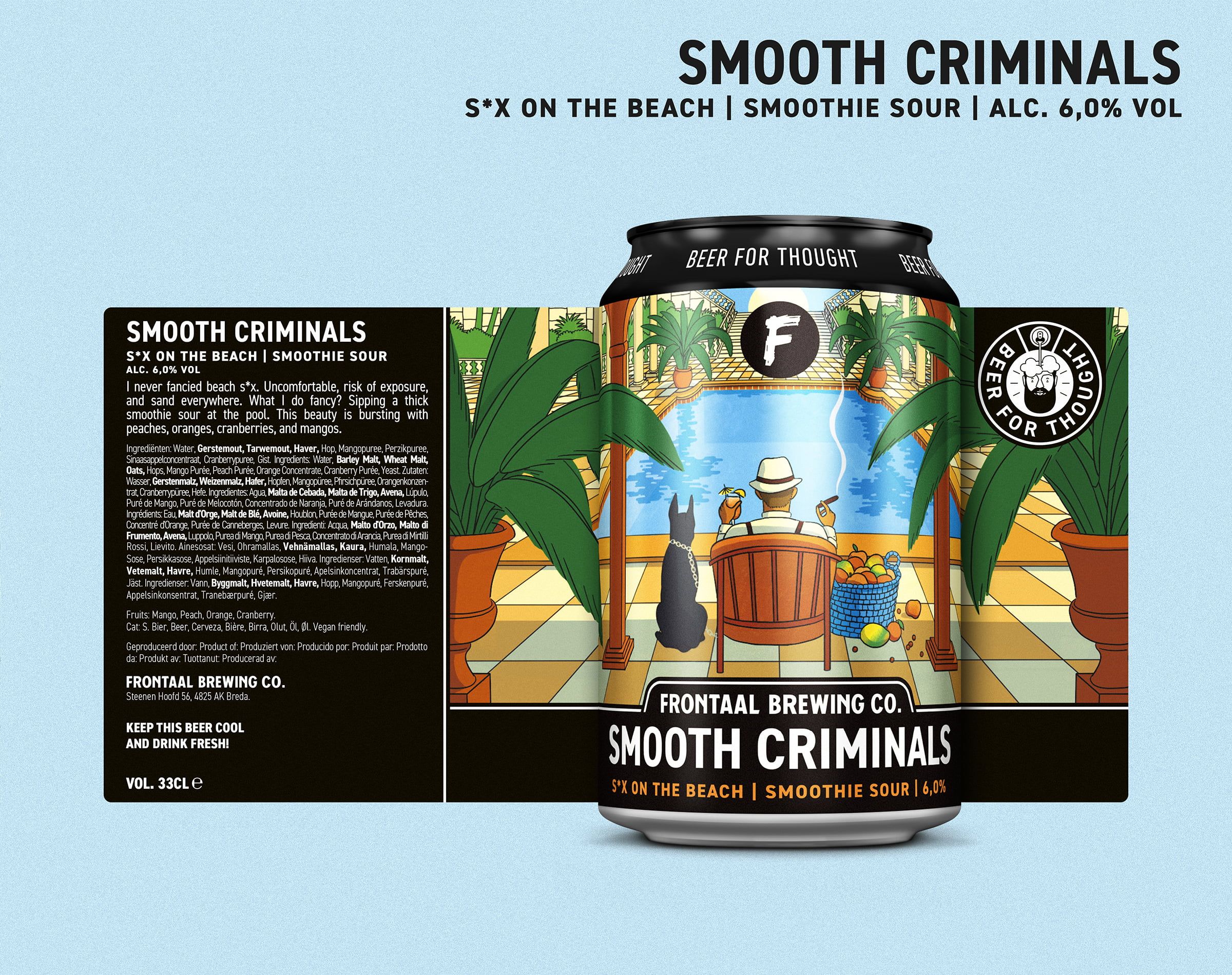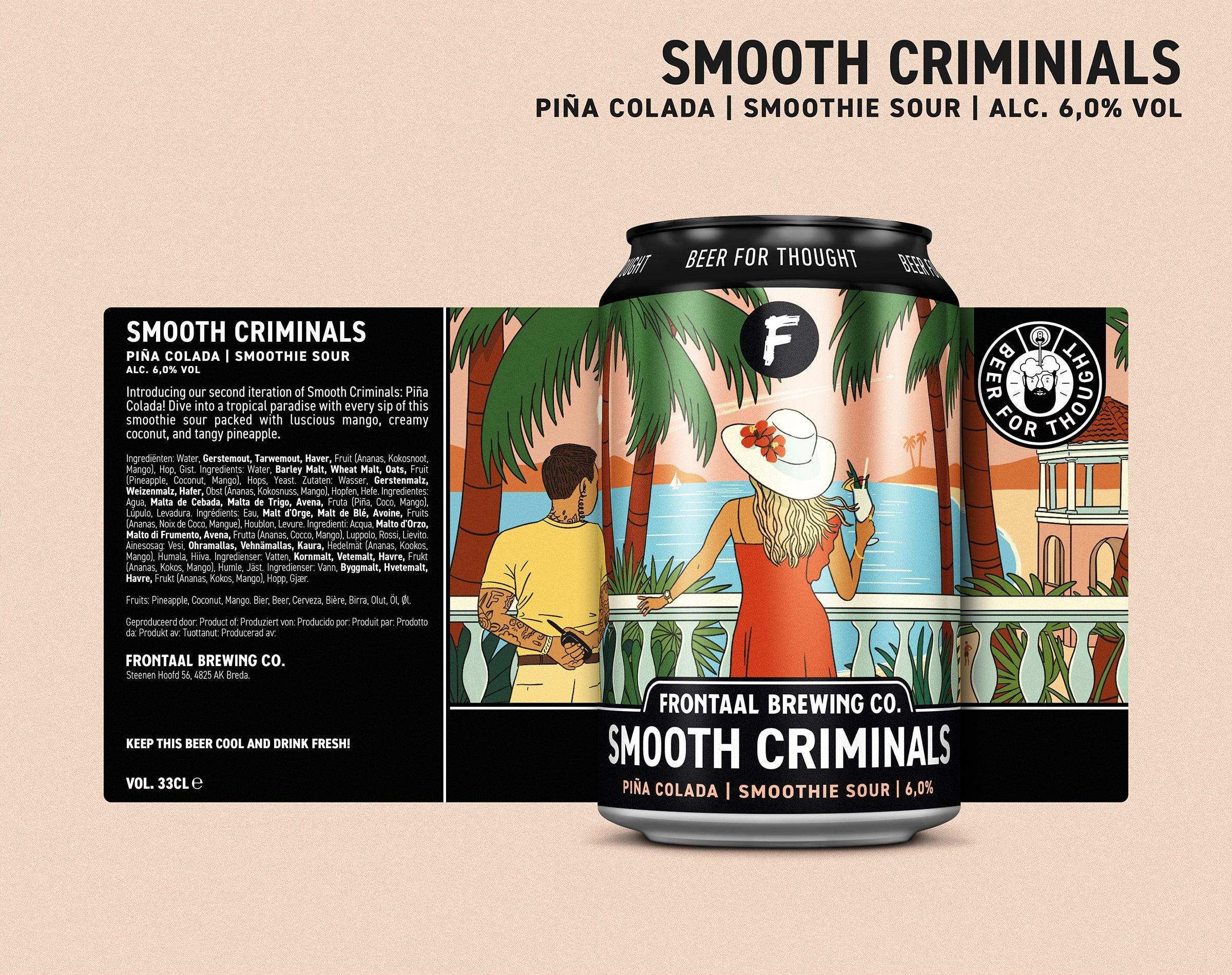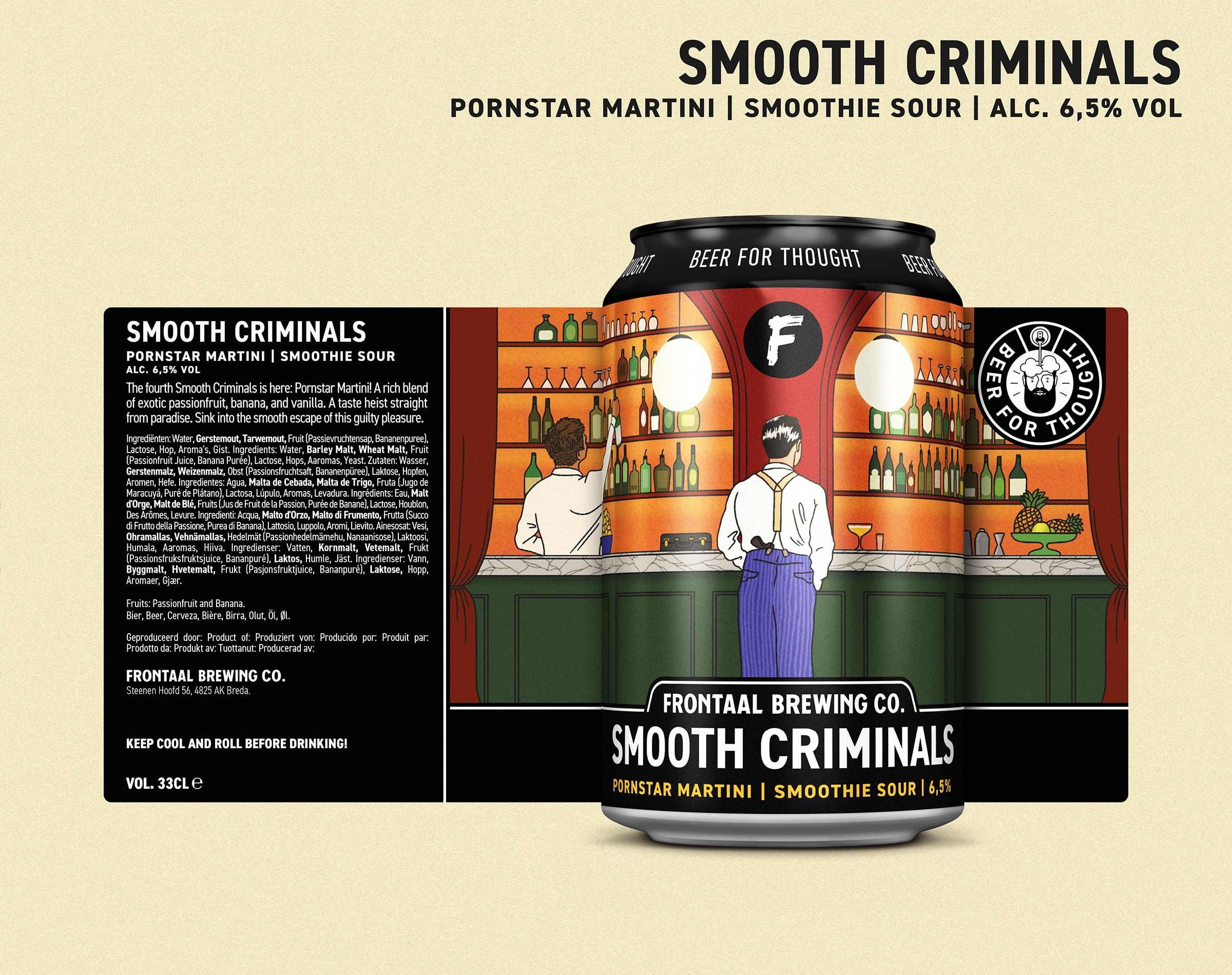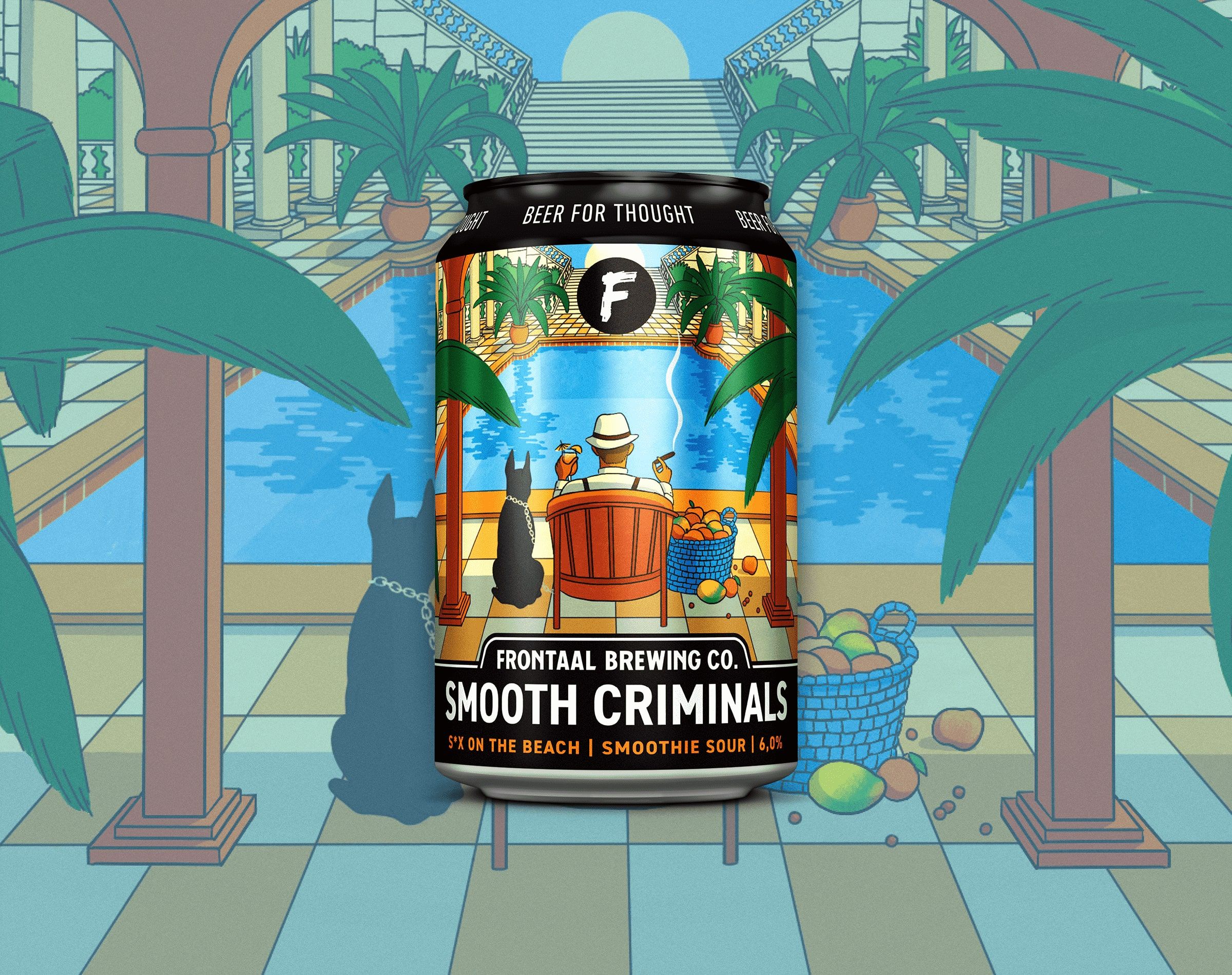 Partnering with Frontaal Brewery, Maaike crafted four label illustrations for Frontaal’s ‘Smooth Criminals’ line of drinks. A brand that takes a playful approach to their flavours and label designs, Maaike’s illustrations inject mystery and narrative in each can, embodying the star ingredients alongside an intriguing central character.