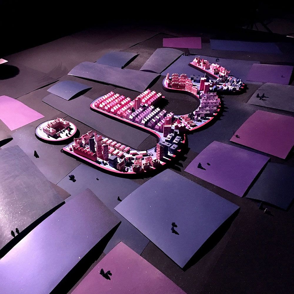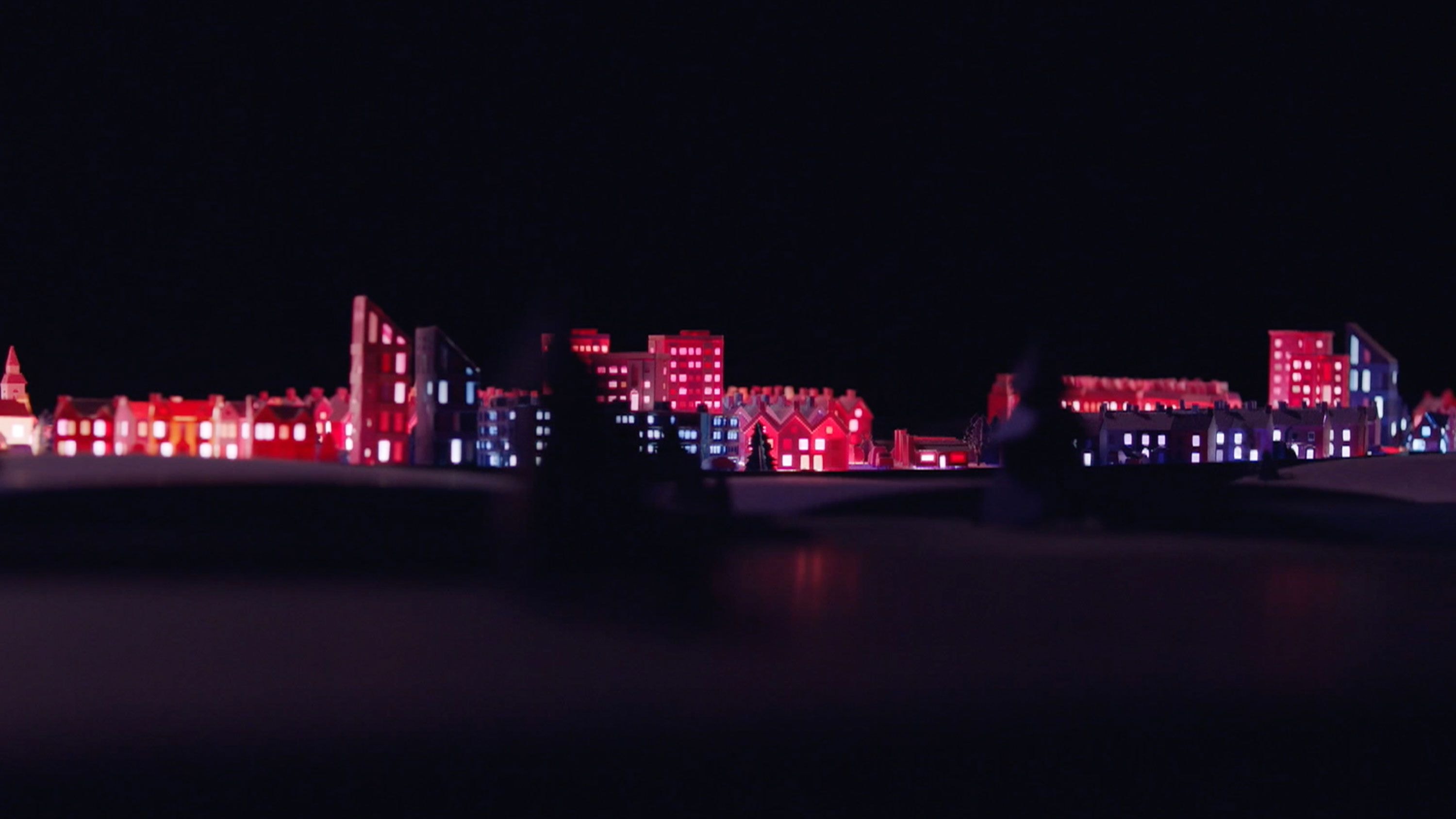 Given a fairly open brief, Hattie came up with the idea to create a miniature town at dusk, featuring little paper houses nestled together and surrounded by frosty fields and forests.