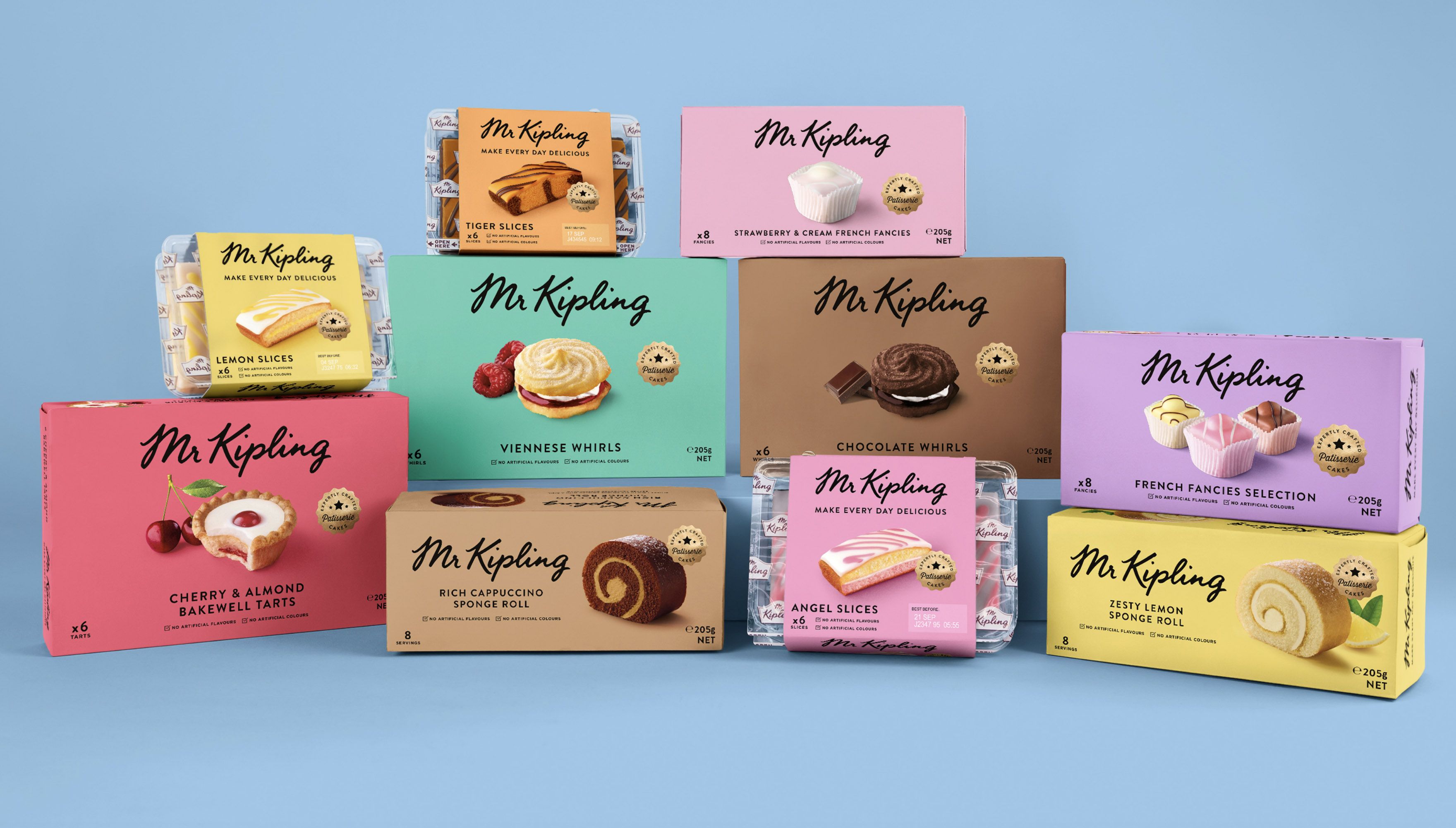 In 2018 Studio Robot Food redesigned Mr Kipling’s branding and packaging, taking inspiration from European patisseries. Alison’s brandmark was refreshed, and is now a flat, black colour, printed directly on the coloured background, rather than on a light-coloured label as in previous designs.