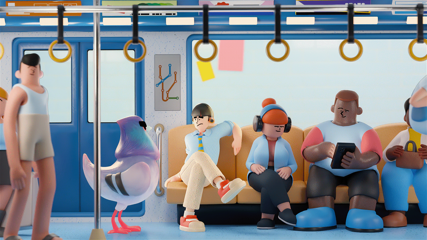 Laura's hero of the ident is a young man exhausted from his first real job in the big city, suddenly compelled by the need to locate the only empty seat, the hero is animated humorously with his centre of gravity in his butt. Designed in Laura's signature 3D style, the characters have soft rounded edges and a light, buoyant energy as they make their way home.