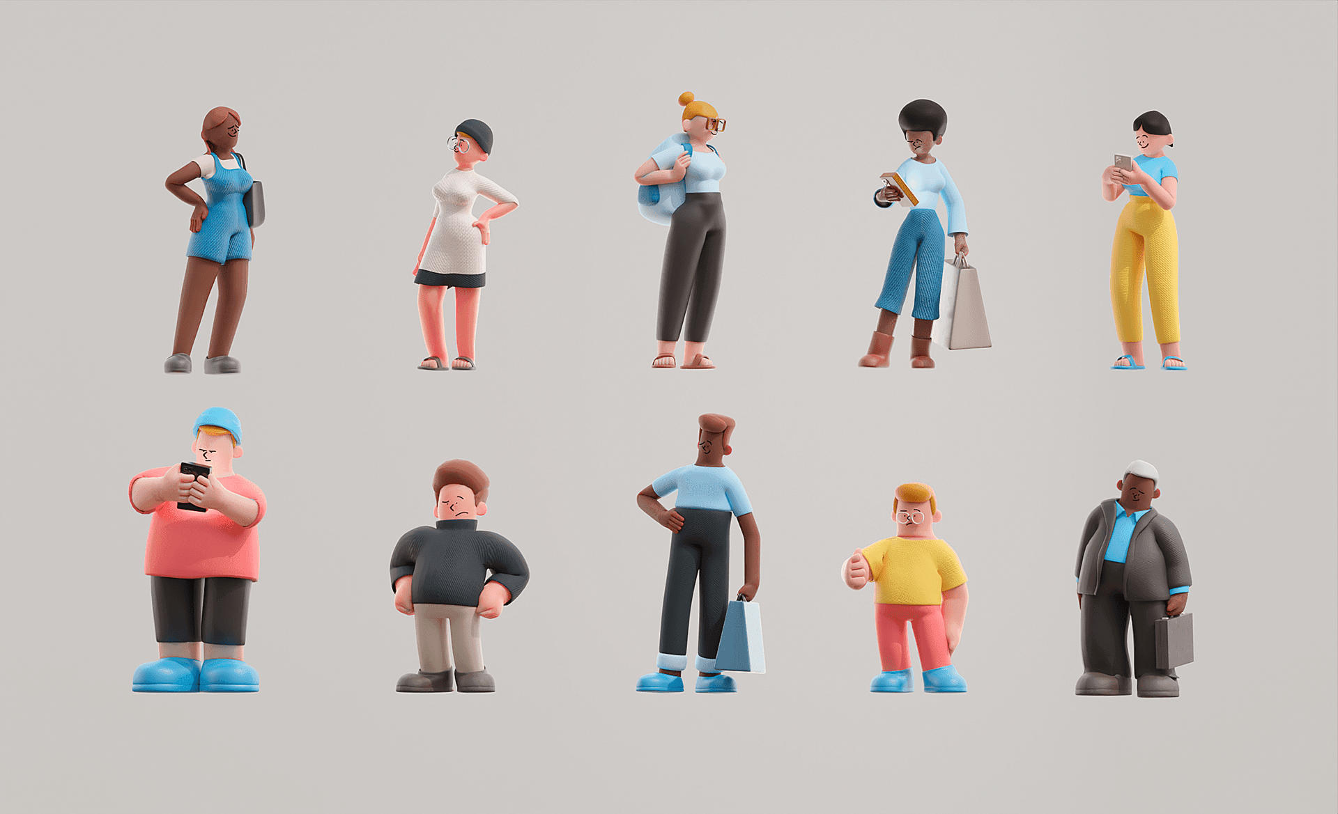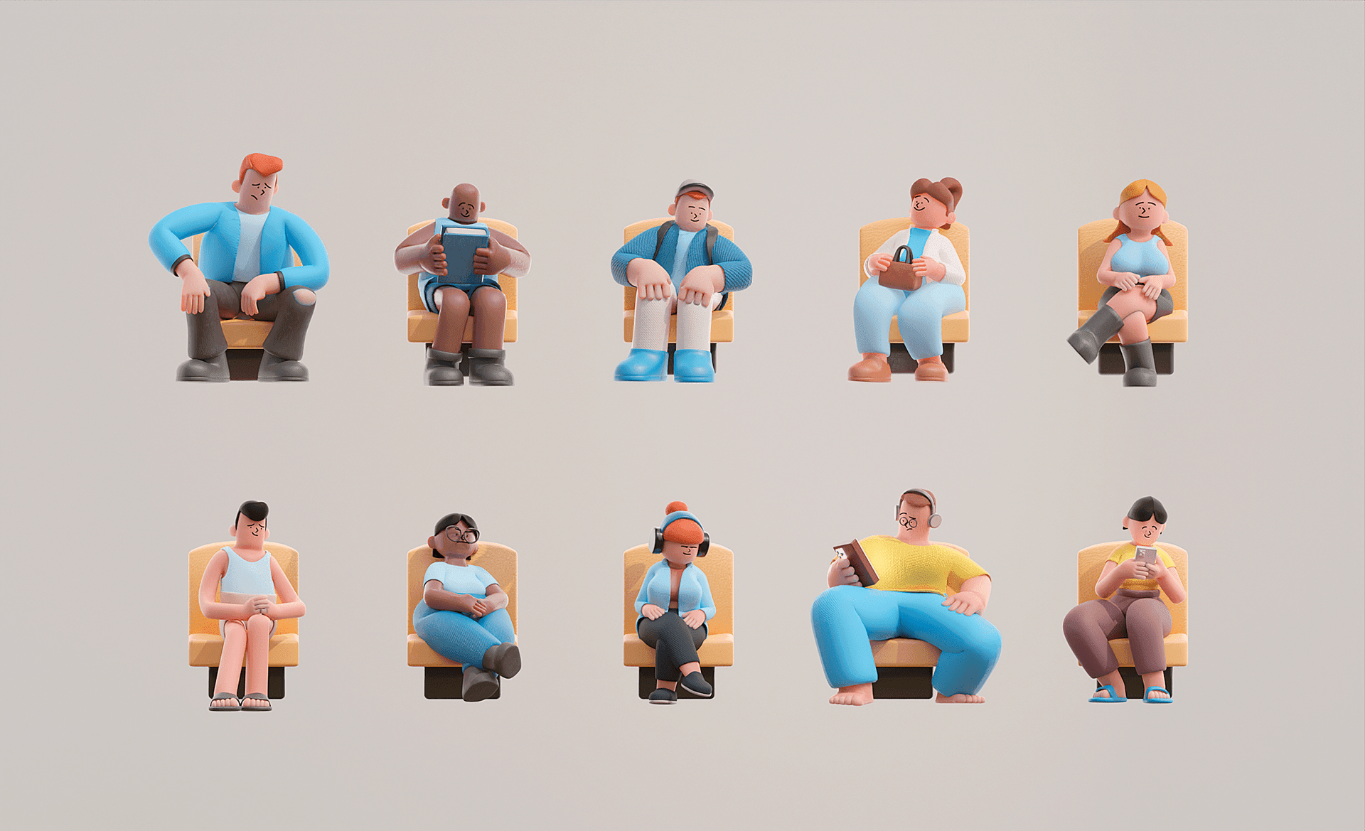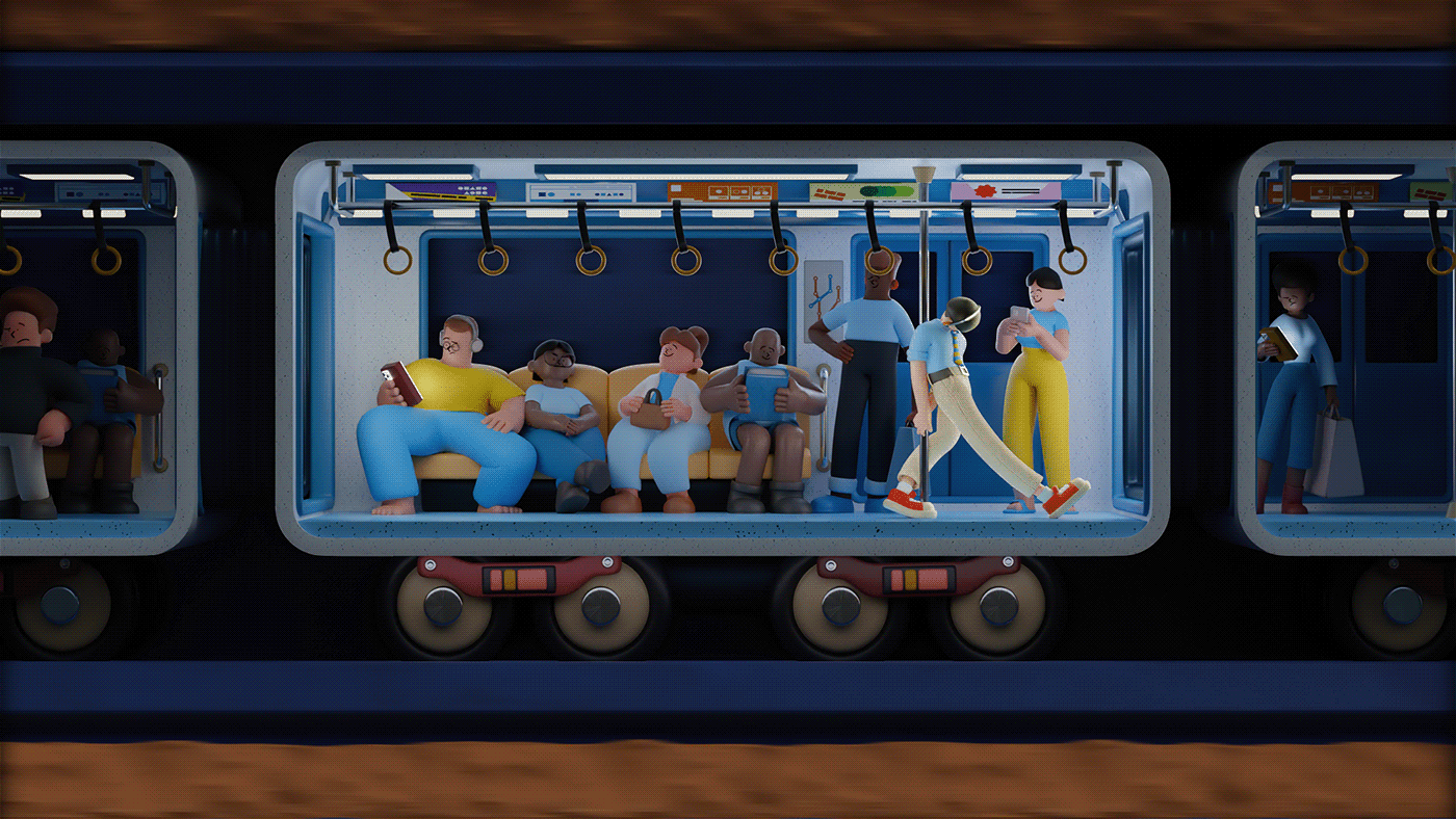Laura designed the background characters in the scene to be realistic and individual without drawing too much attention. She took references from observing real life people and how they amuse themselves while commuting.