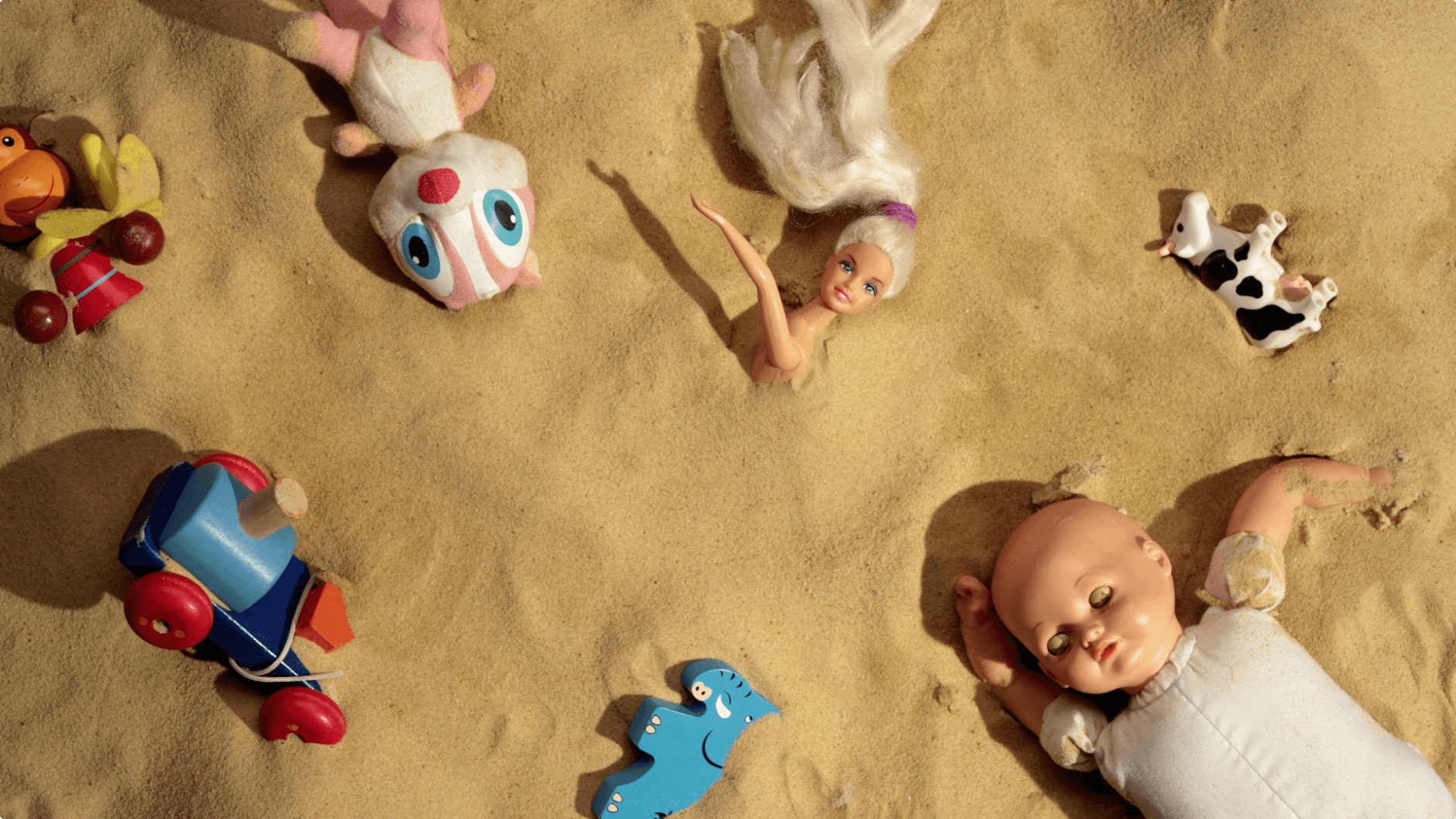 The piece takes its visual cue from the type of ‘play therapy’ that helped Melissa to overcome her experiences – using paint, mud, food, toys, crayons and a sand pit to tell her story.
