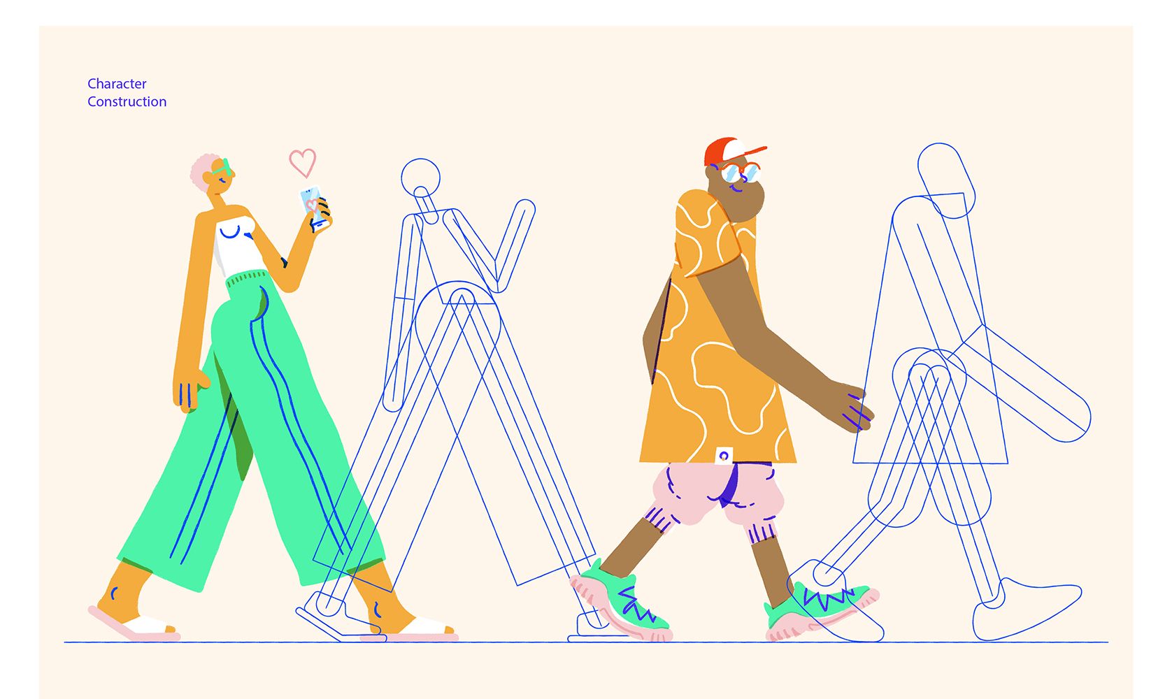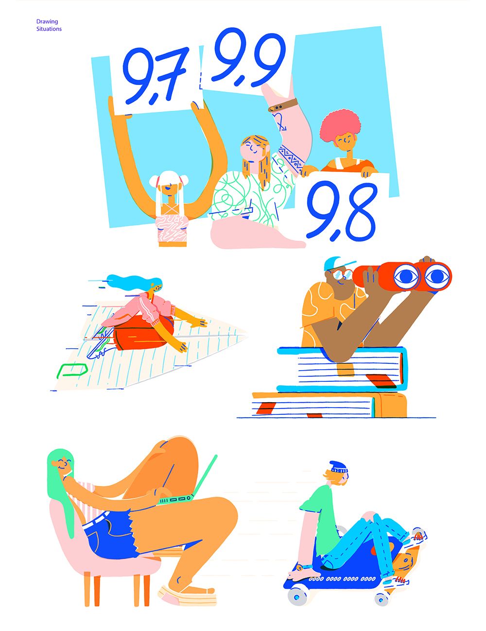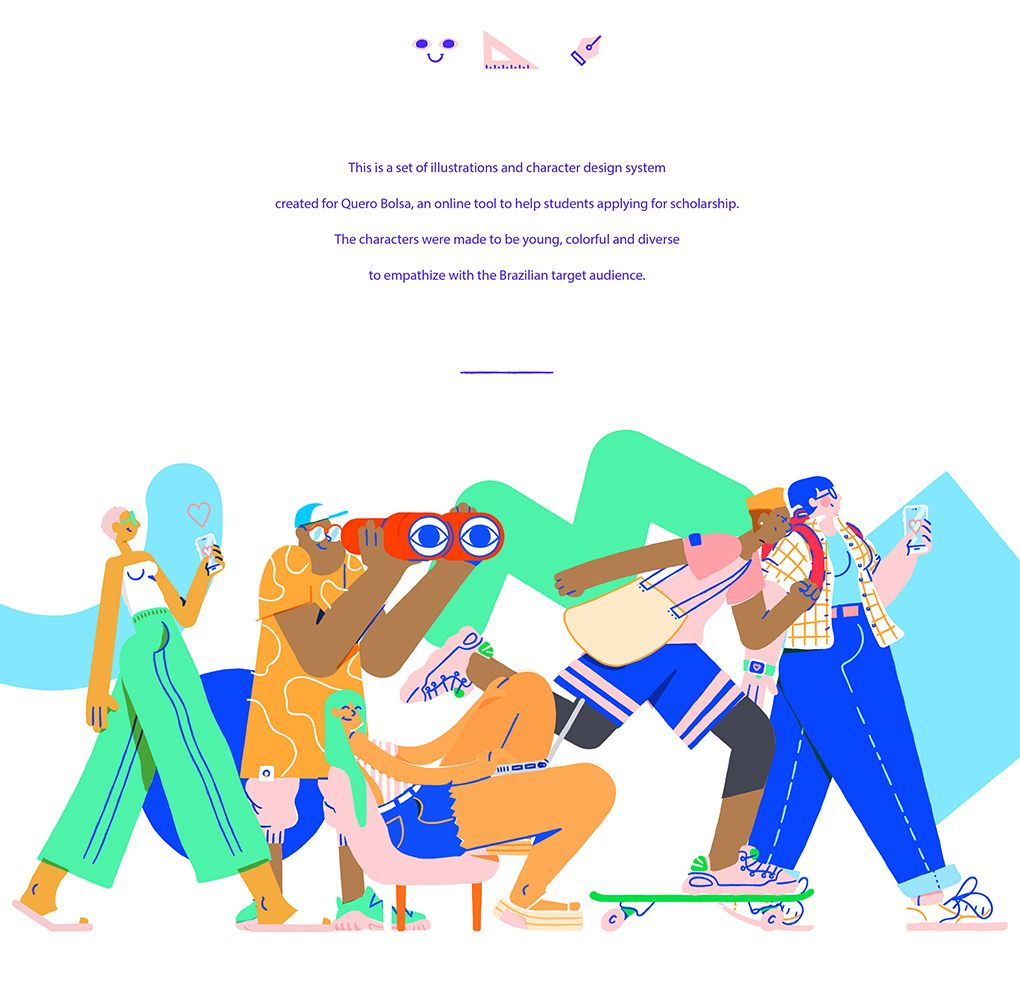 Quero Bolsa is an online tool to help students applying for university scholarships. Estudio Pum were approached to develop and create a full illustration system for the platform. The client needed colourful, young and diverse characters that would immediately relate to students. The end output was not only illustrations that lived across the platform but an illustration system with rules and guidelines that could be as flexible as the client required. Pum stretched the illustration style to its limits to know how much could be done without losing it’s identity. At the end they systematised everything with rules and orientations inside a guideline.