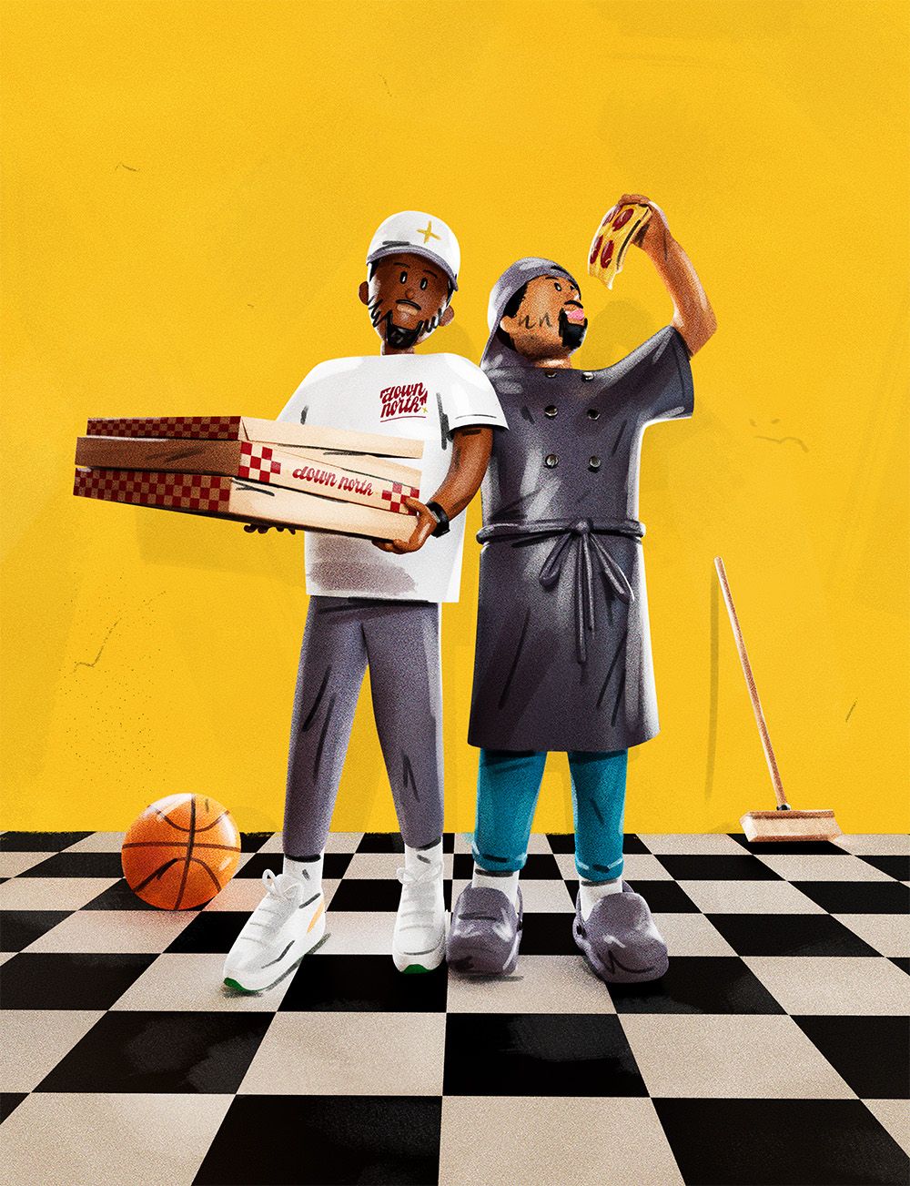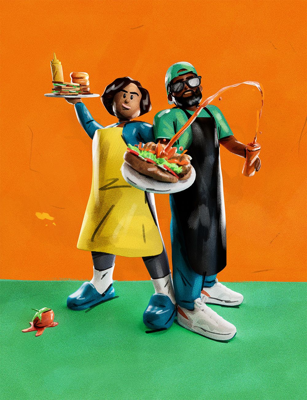 Black Childish illustrates for "On a Mission," portraying restaurant owners and teams as active heroes in their local settings.