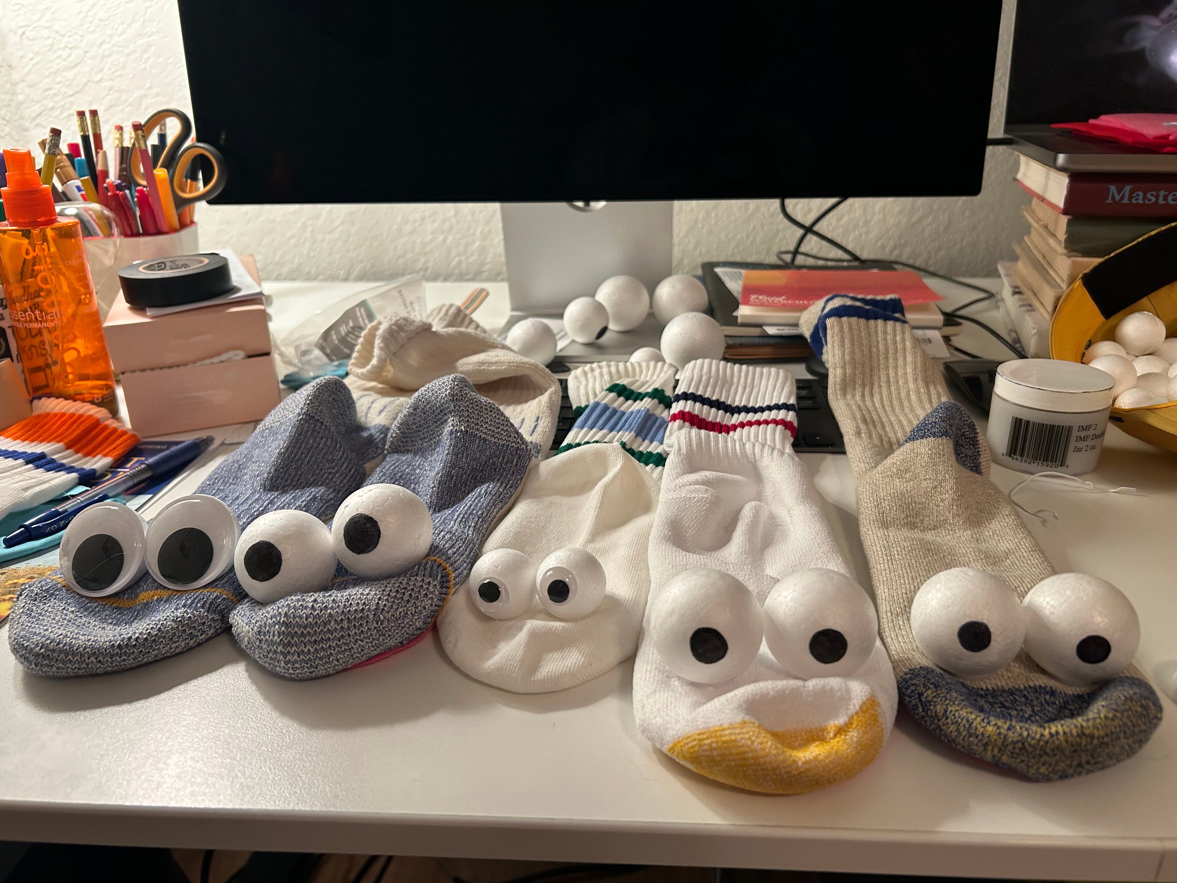 It was important to Thumbtack for Socky to look like a sock puppet, and not a muppet. Resulting in a lo-fi, not overly crafted design, but at the same time able to have exaggerated facial movements and heaps of personality. After trying various sock materials Practice settled on a wool sock with a white heel/toe combination that gives Socky a resemblance of a face to ensure stand-out characterisation. Next the eyes - foam, ping pong, googly, and half sphere were all tried to create the perfect fit.
