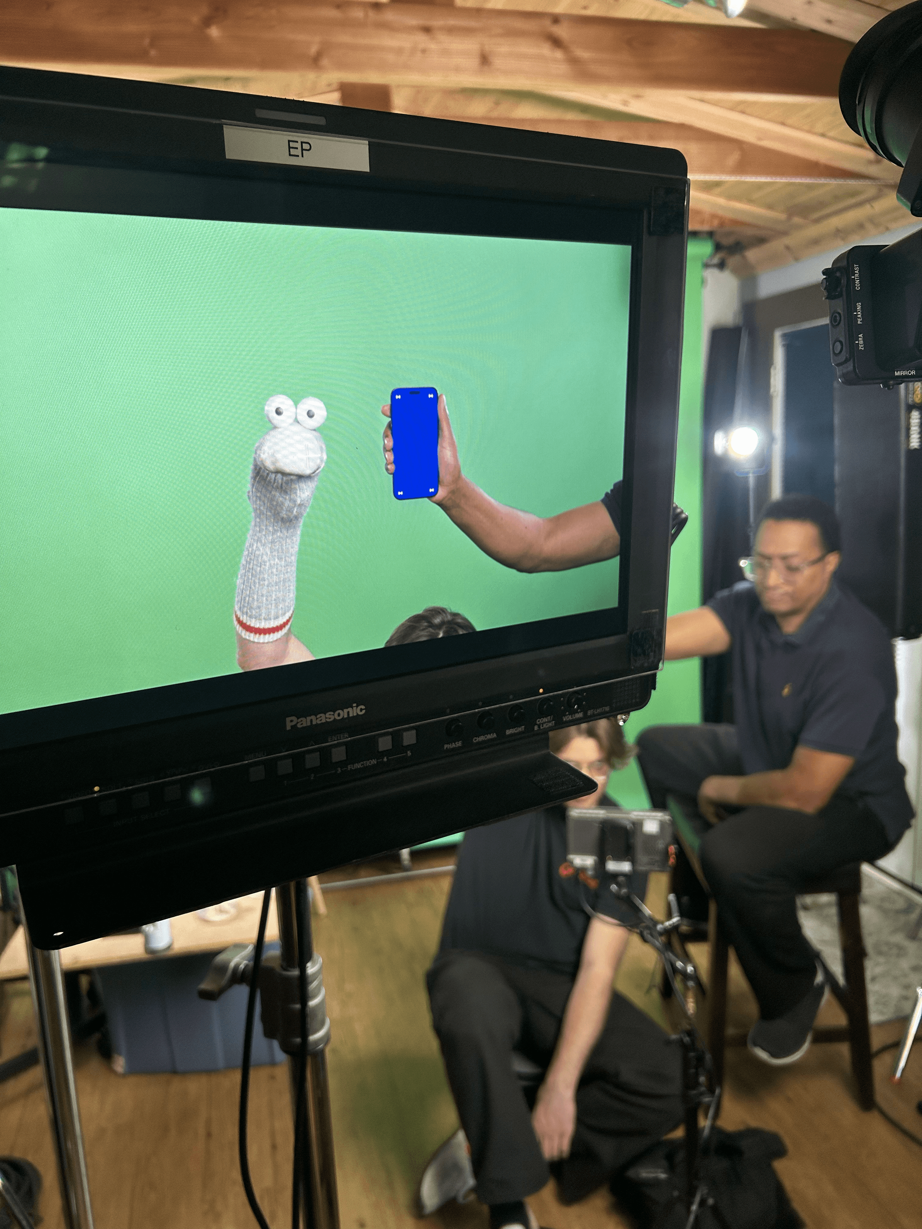 For the stage set up, Socky was filmed on a green screen with various props in the foreground and interacting with the “phone hand” to create humorous and joyful moments. Although the environments appear to be large, the set up of the shots is quite contained to ensure precision on Socky's mannerisms and expressions, as well as the overall timings.
