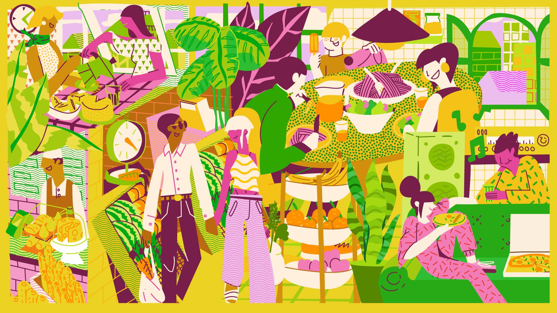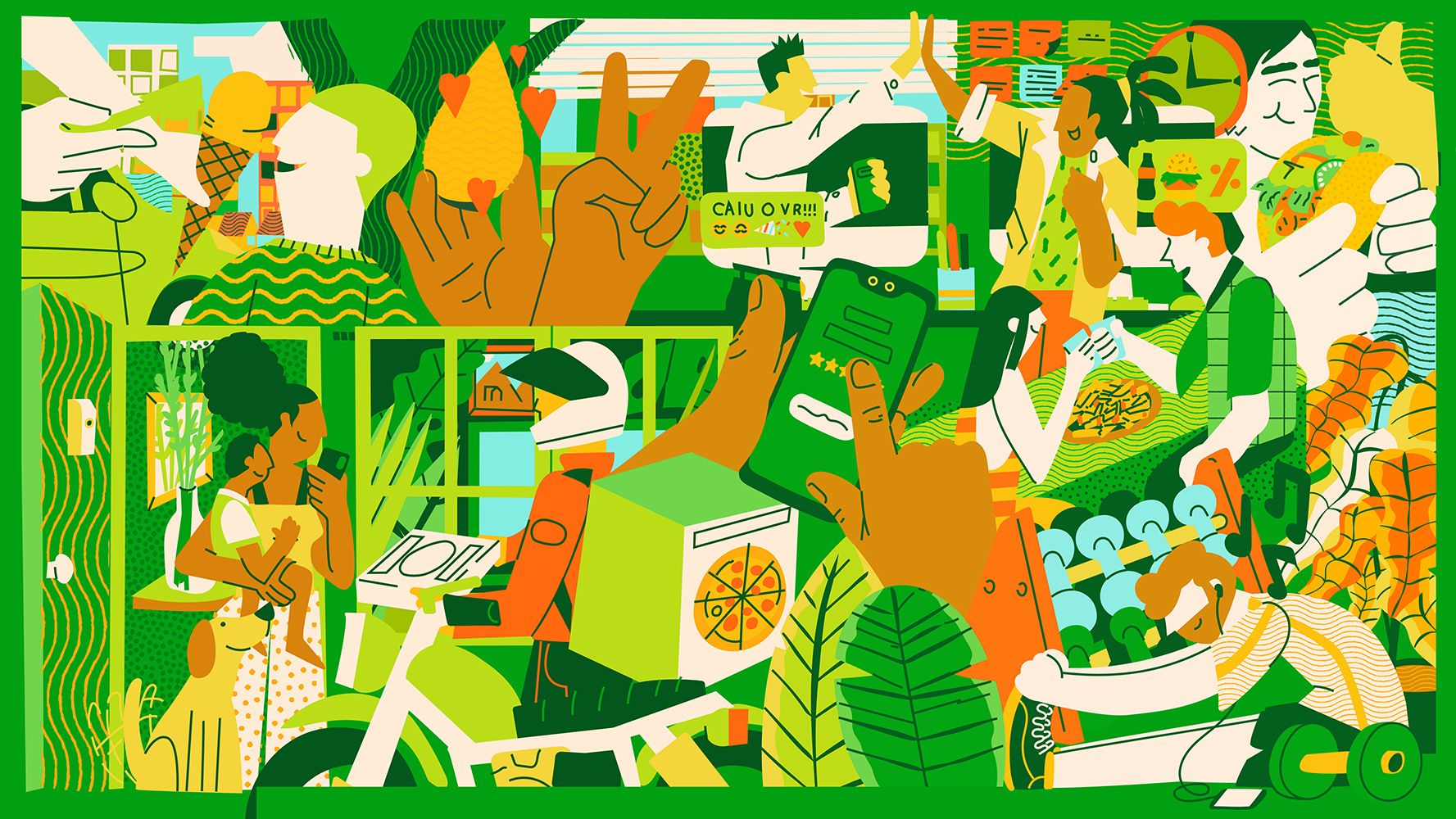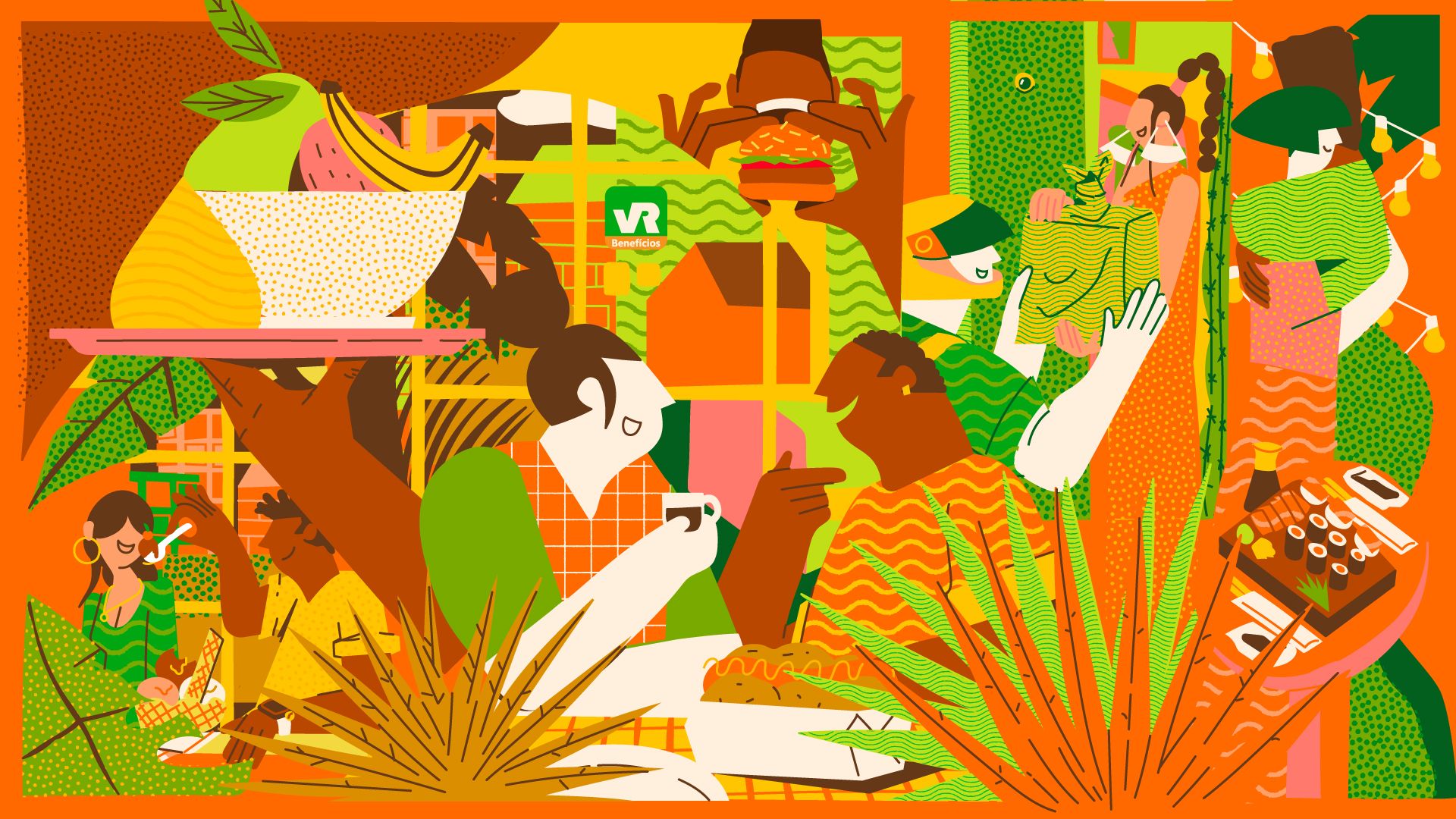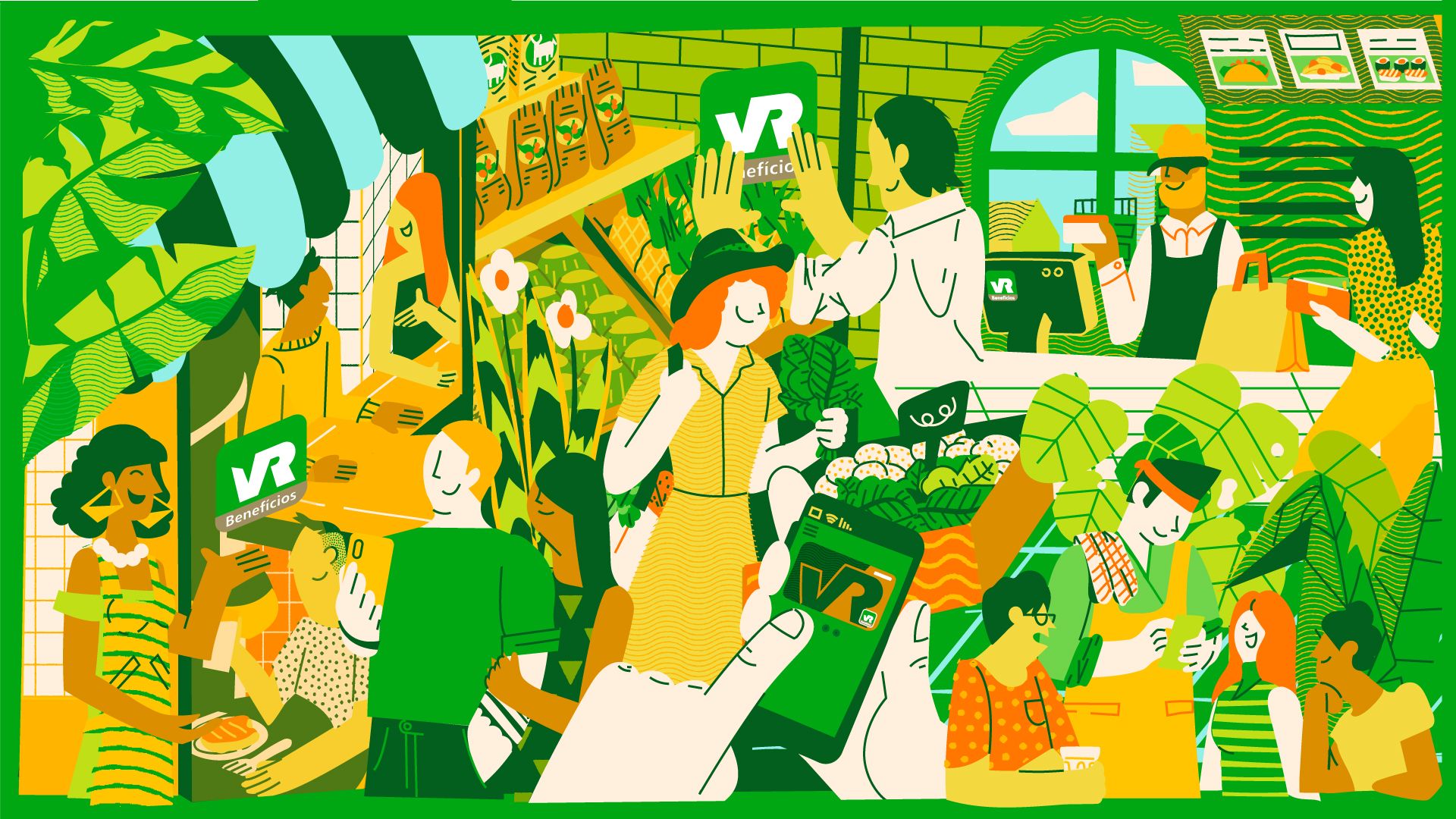 Pum developed a bespoke illustration style for VR Benefícios and built mural compositions relating to various brand themes. The key visuals were developed directly with the brand so their in-house designers could use them altogether as compositions or separately as single illustrations, providing a huge range of assets and possibility for different layouts.