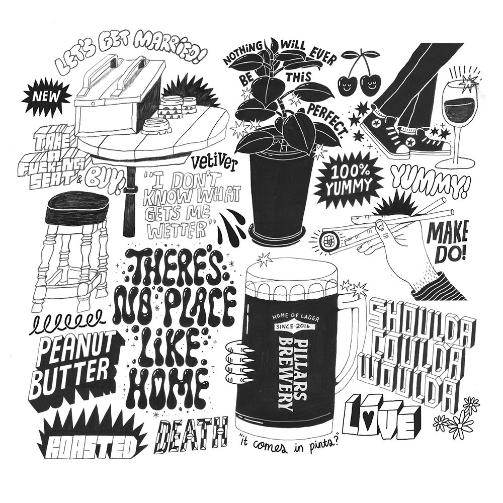 It’s more of a diary or a therapeutic outlet. It’s a way of being creative without really forcing myself too hard or putting pressure on myself to just make something. If I hit a brick wall and my brains empty of all thought and logic, I can rely on the world around me . For example, a lot of the sketchbook pages usually start off with me sat in a pub, coffee shop or public place. I’ll start drawing what’s in-front of me- usually a chair or piece of furniture. Then maybe what I’m drinking. A song’s usually playing in the background , so I’ll write the lyrics in a style that suits the mood. I’ll eavesdrop into an awkward first date conversation and cherry pick words or phrases. So it’s kind of capturing a still life of what a normal person would probably describe as a mundane situation. I see it as a goldmine for ideas. Everyday’s slightly different and I find it massively beneficial to appreciate the smaller things.