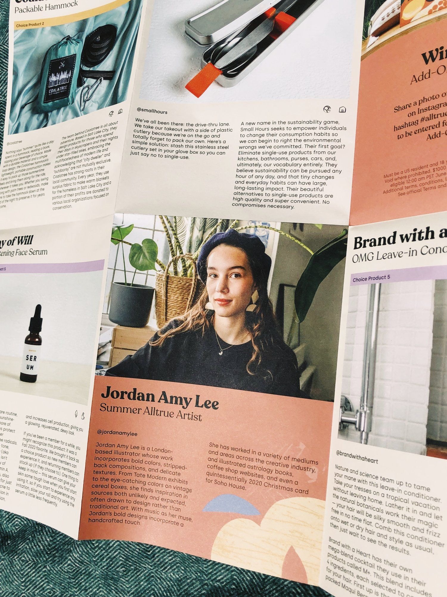 Alltrue are a female-focused brand who send out a monthly curated box of ethically sourced, sustainable products. A different female artist is chosen to create the artwork for each box, and Jordan was delighted to be asked to create the design for the Summer 2021 box.