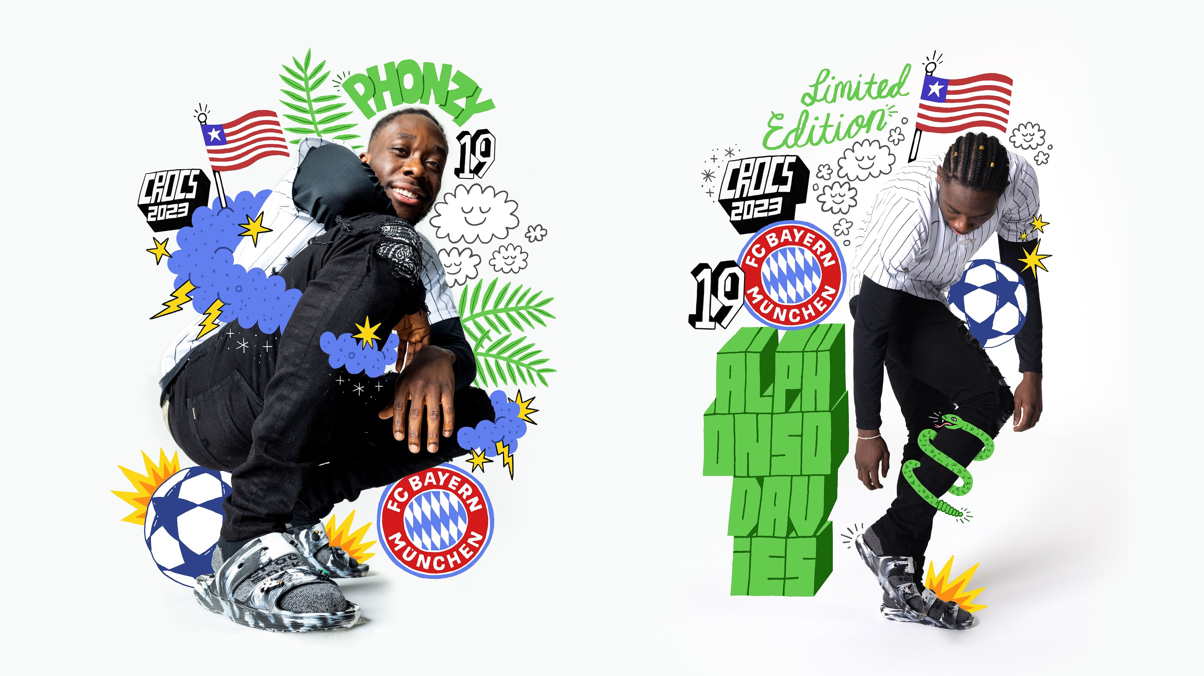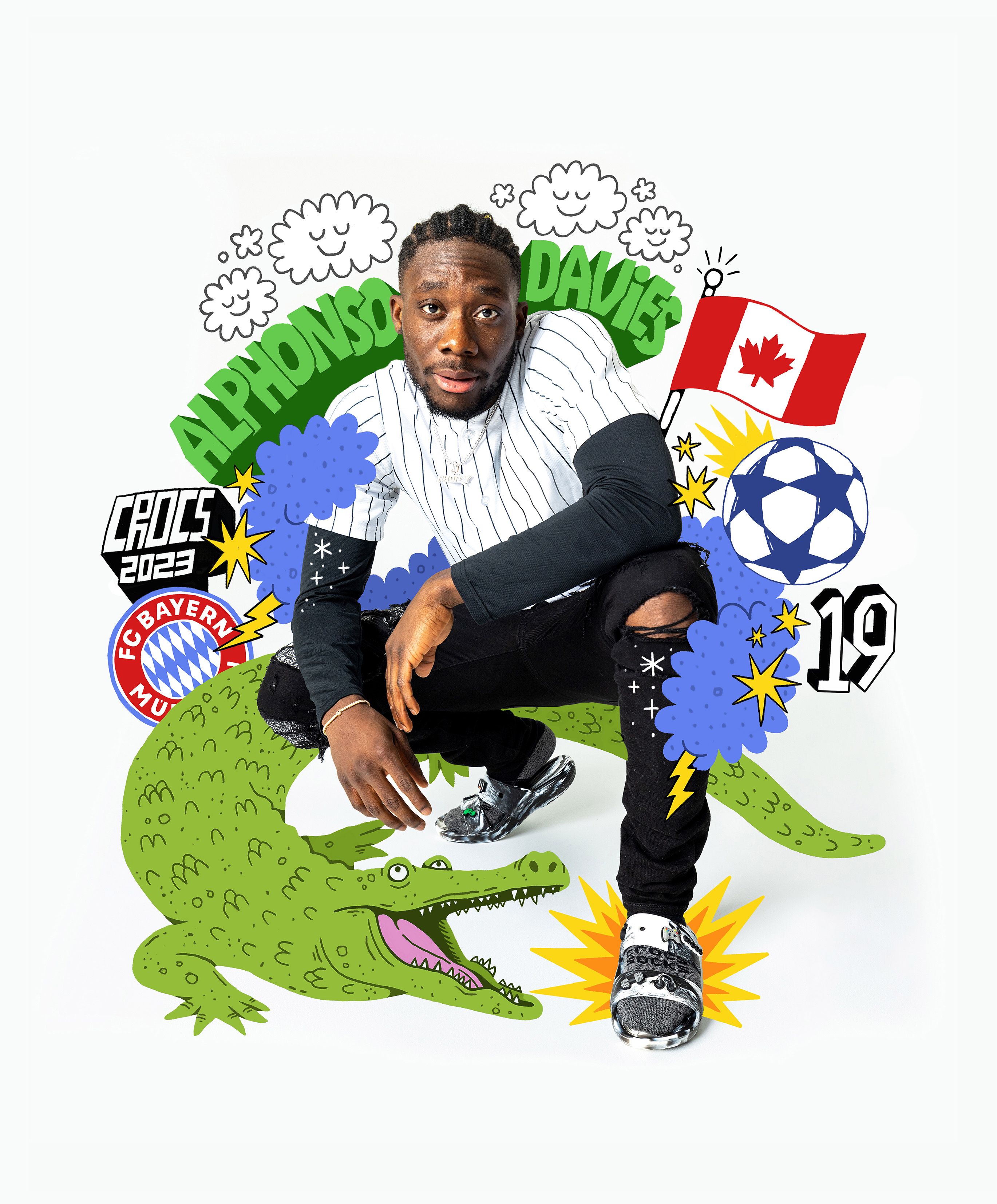 Biff worked with Hifen studios to make five graphics that sat alongside the Alphonso Davies partnership with footwear brand Crocs. Biff's vibrant and characterful illustrations add to the contemporary, street style direction the brand was aiming for with the collaboration with the football player.