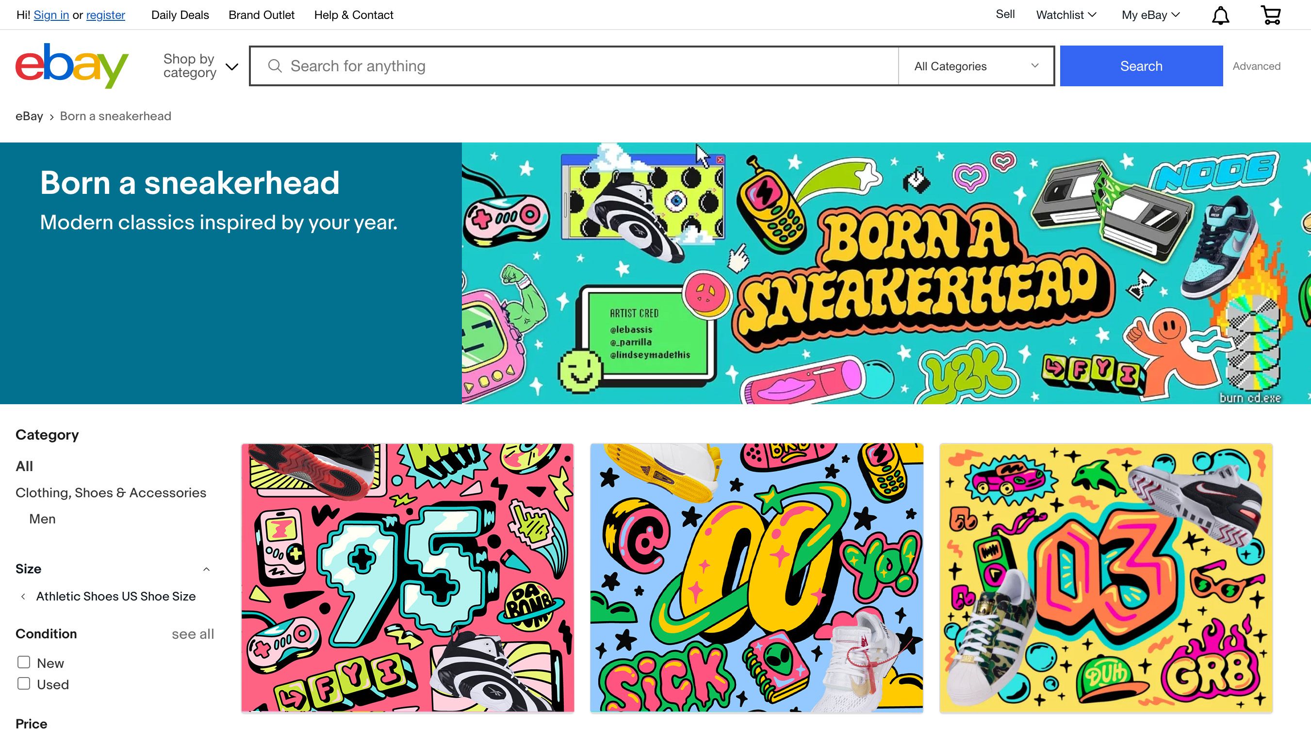 Lebassis created designs and lettering for eBay's new 'Born a Sneakerhead' campaign. Aiming to encapsulate the motifs and iconography from specific years, each design is vibrant and colourful.