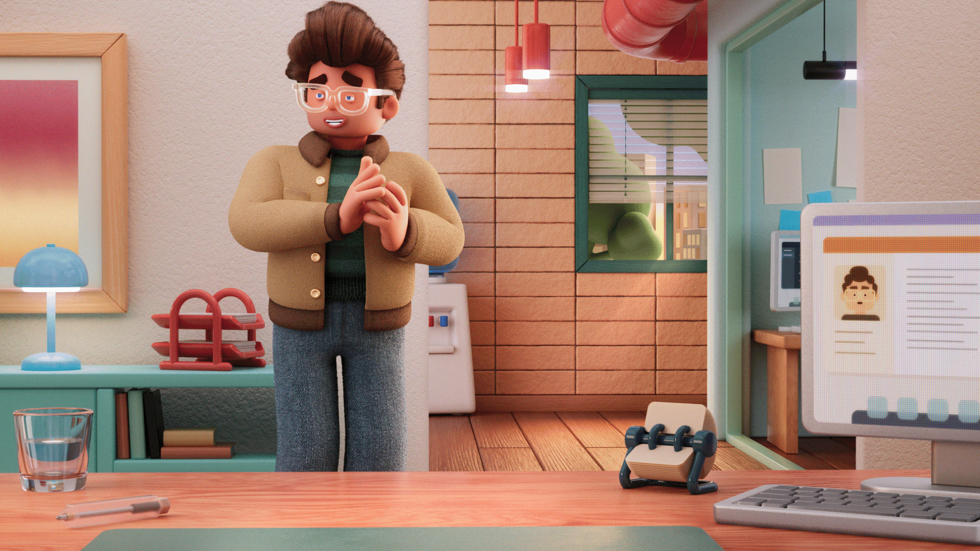 Simplicity was key for the concept and environment design, with Laura bringing to life a warm and welcoming office atmosphere combining realistic props with exaggerated textures to enhance the 3D toy-like feel of the space.
