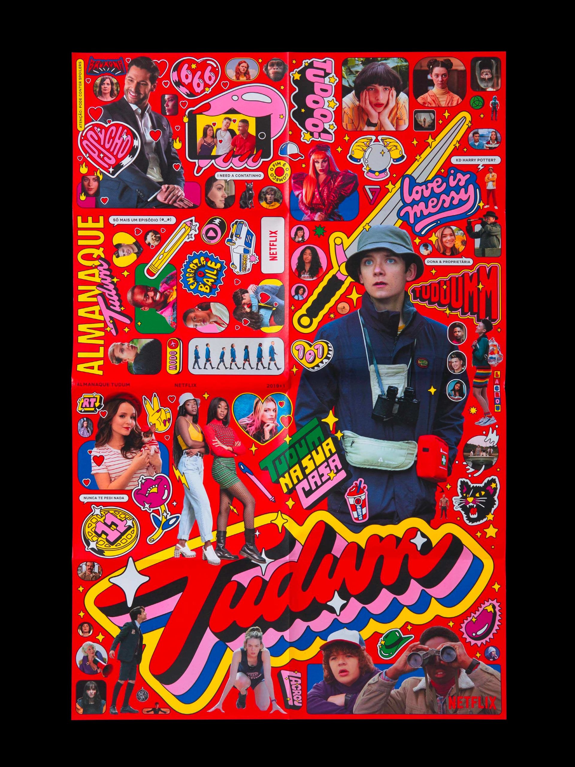 The almanac is made entirely based on stickers with a maximalist approach to represent the youthful and playful personality of Netflix shows. With Lebassis’ style of illustration, he developed 100 stickers – tying in elements and characters from Netflix shows with nods to Brazillian memes that related to Tudum. In addition to the being in the almanac, Lebassis’ stickers were also present during the live streams and on the website.