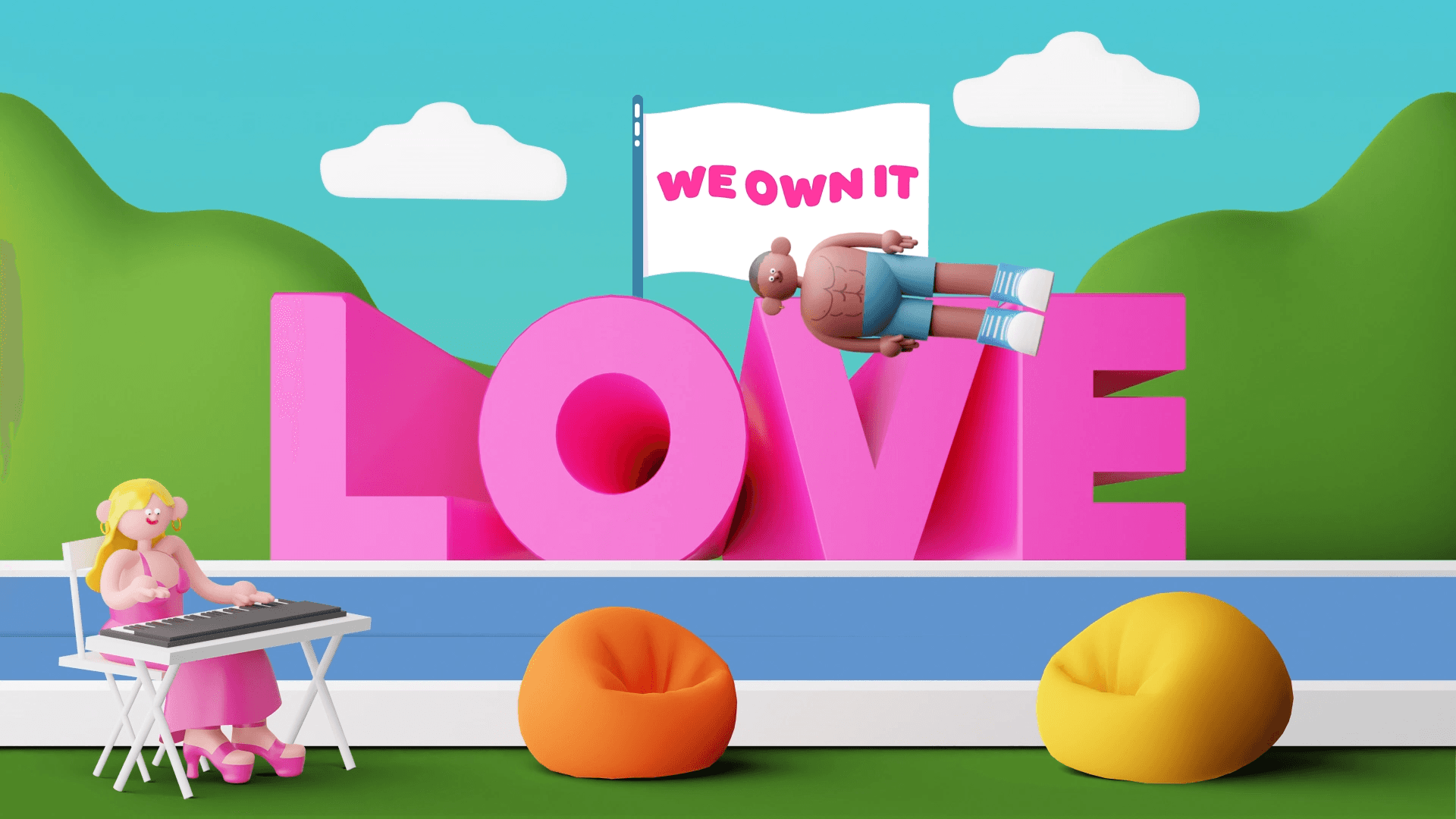 “There was so much room for fun here. The whole team was on the same page creatively and this made it really easy to get stuck in. My favourite thing is definitely all the tiny hidden references and jokes. There are so many silly nods and little tongue-in-cheek moments which made it a fab project to work on. I loved designing all the cheeky characters and getting them looking like love islanders, in my style. The team put everything together so beautifully and the way all the 2D assets merge with my 3D elements looks great.”