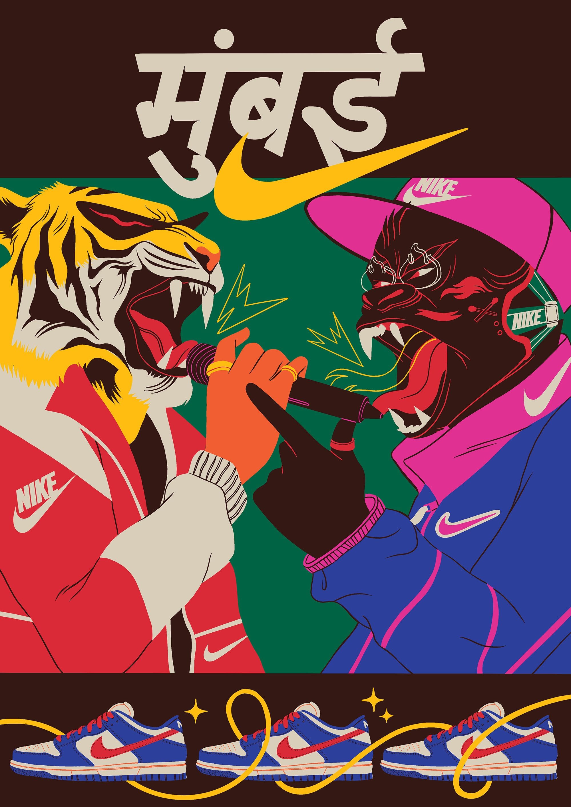The illustrations depict Mumbai as an alternate future, rooted in its rich, extravagant cultural history and fuelled by technology. Depicting an optimistic worldview, Boomranng portray scenes of life with an unexpected twist, all keeping the iconic Nike design front & centre, from energetic dance-offs to bustling train journeys and a circus of animatronic animals.