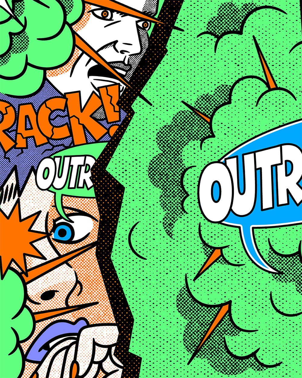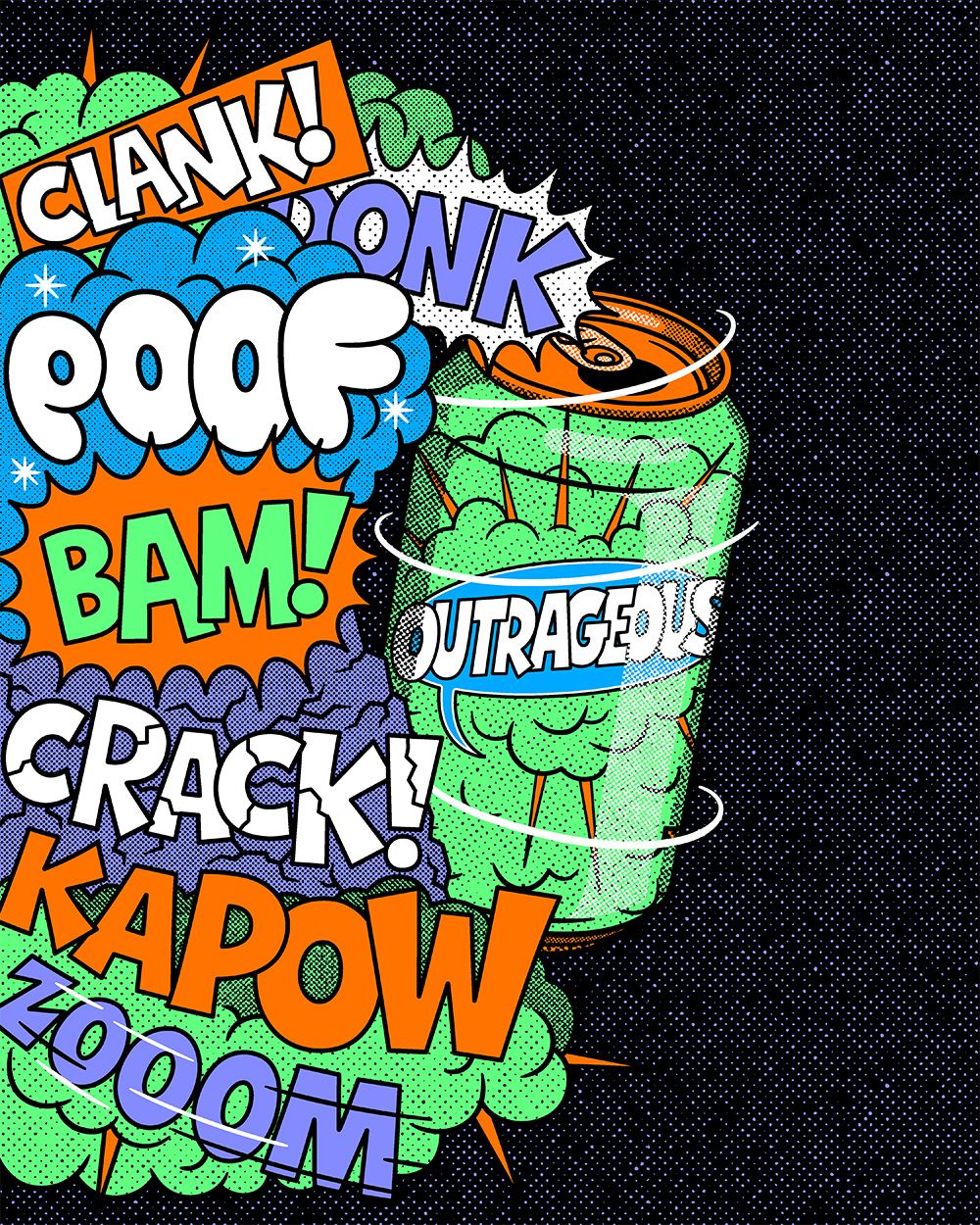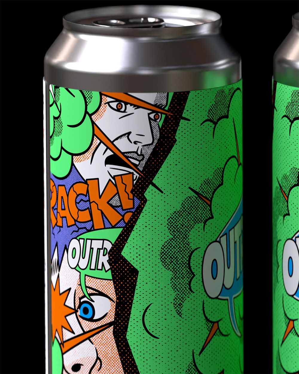 Justin crafted the explosive branding for imagined beer brand 'Outrageous'. Drawing on his vibrant graphic design style and influenced by classic comic books, Justin's label design is eye catching and textural.