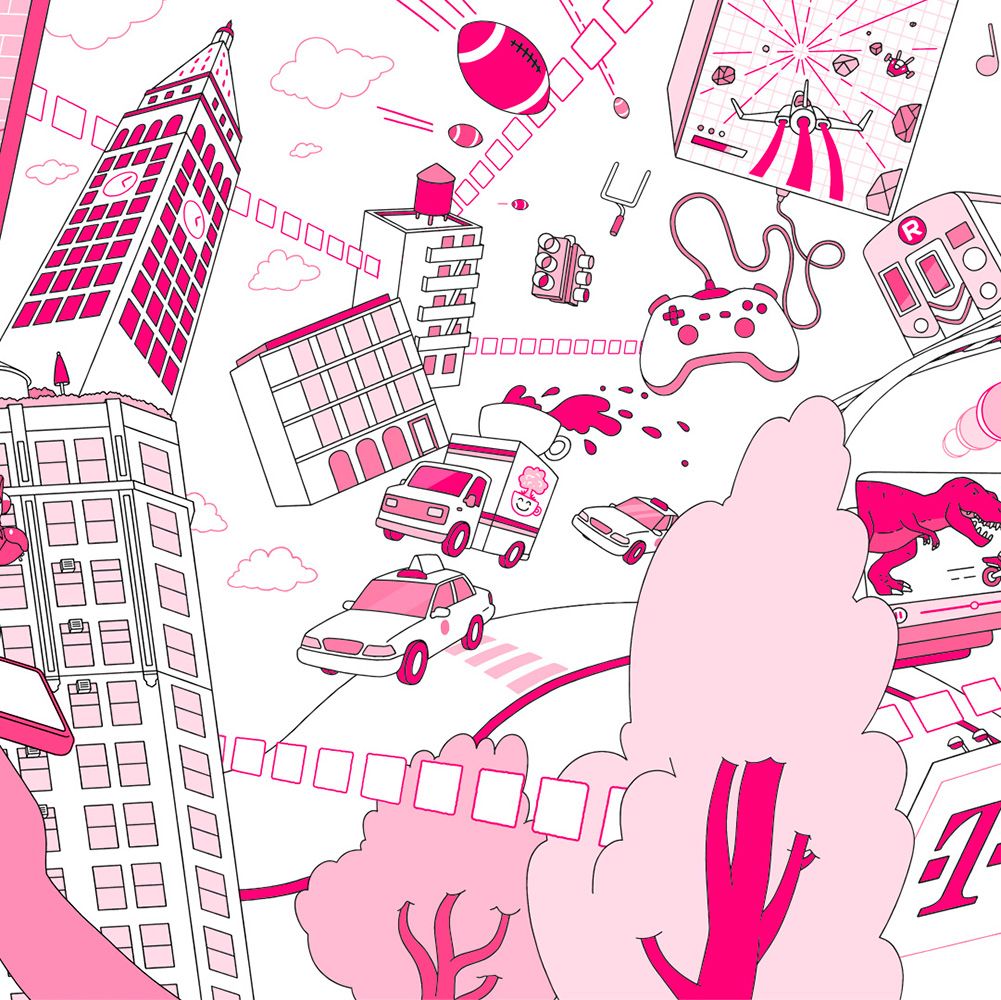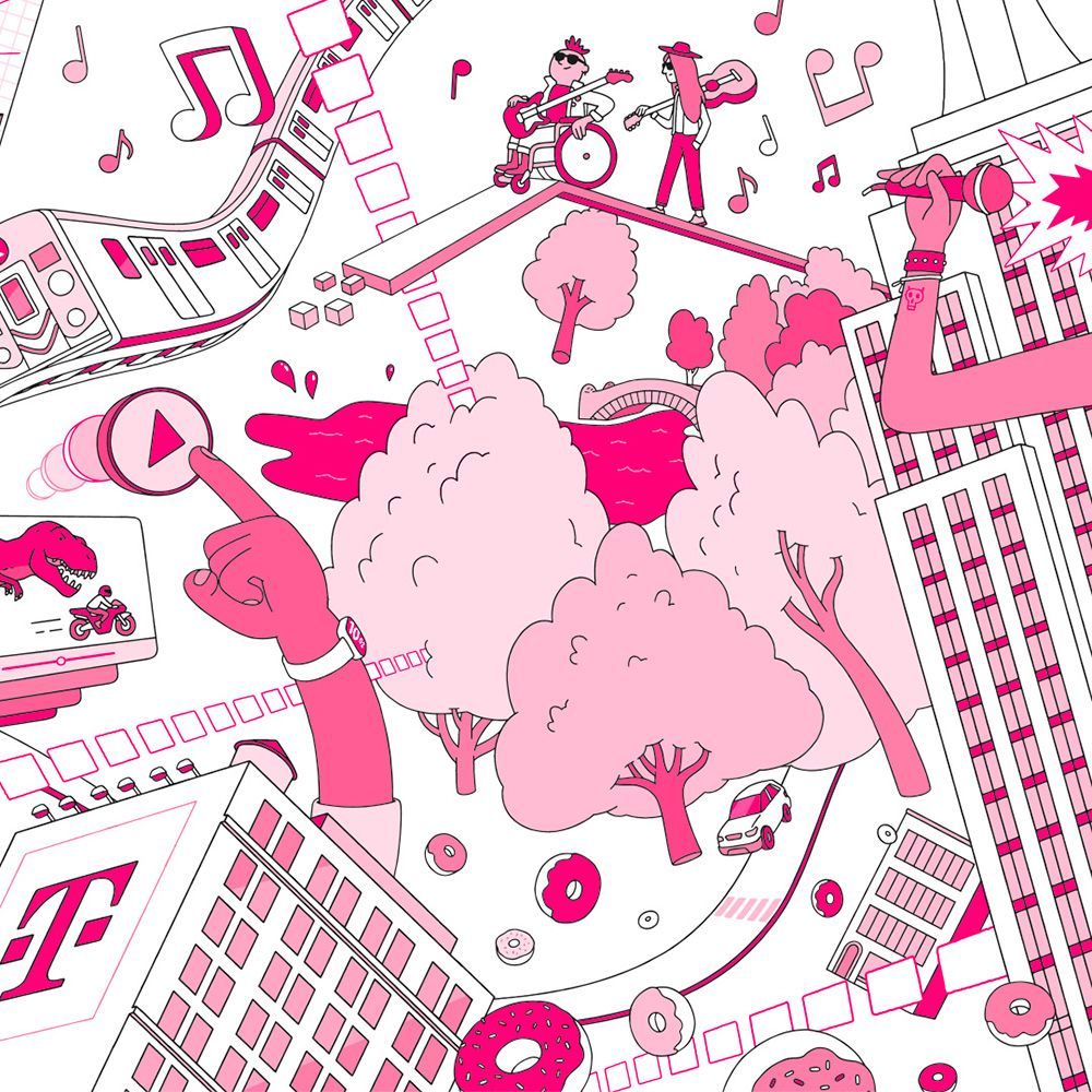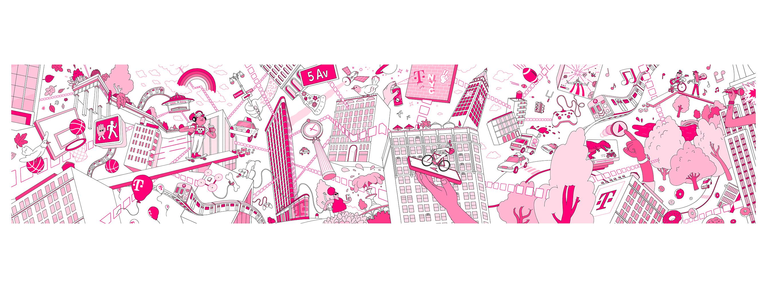 Damien worked with T-Mobile to design a large-scale mural for their Flat Iron flagship store in New York. The illustration featured heavily in the store’s design, with cues to the city’s iconic landmarks in Damien’s signature imaginative style.